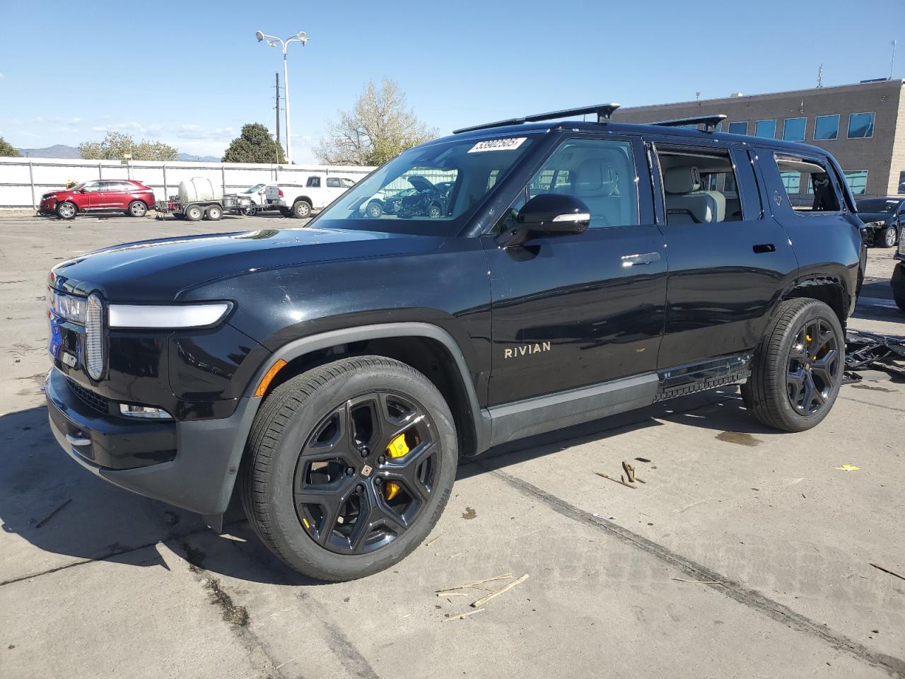 The RIVIAN R1S ADVENT 2023 has sustained substantial damage to the rear and side. The rear shows severe impact damage, with body panels and components detached. The side has visible damage. The interior appears to have moderate damage. The airbags are not visually detectable.