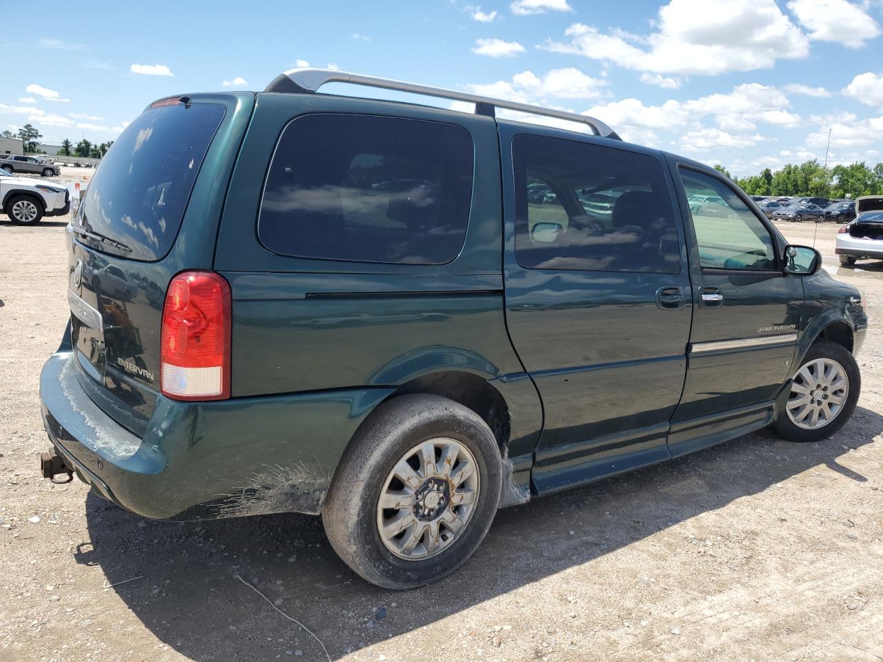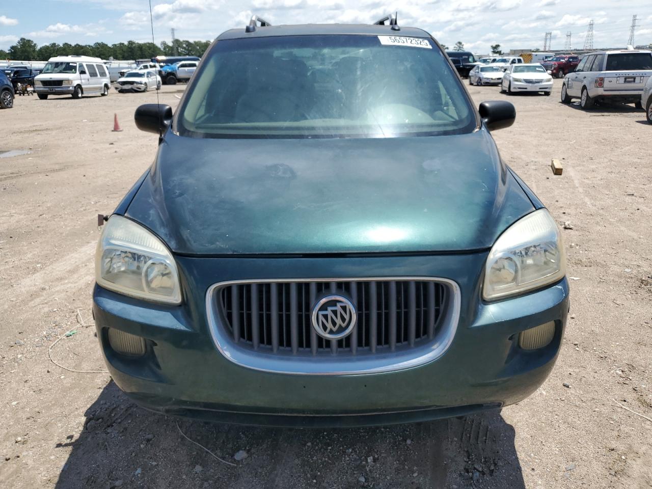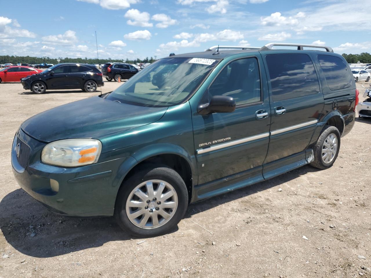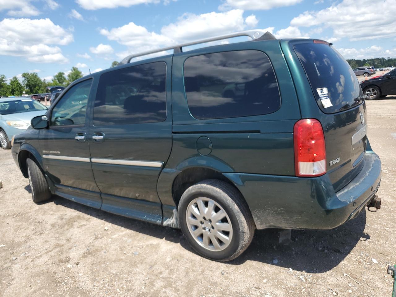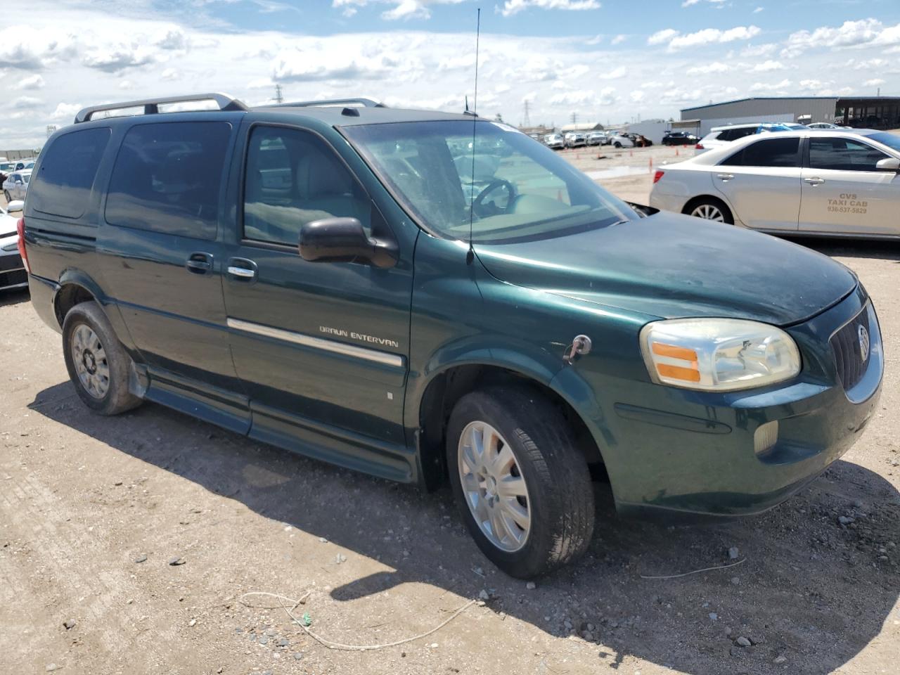 GoodThe 2006 BUICK TERRAZA, a green minivan, presents with side damage and minor dents/scratches. It is a Run & Drive Verified vehicle. The images show various angles of the exterior, including wheels, lights, and glass. The interior displays some wear and tear, and there is no immediate indication of airbag deployment. The car's overall condition reflects its age and use.