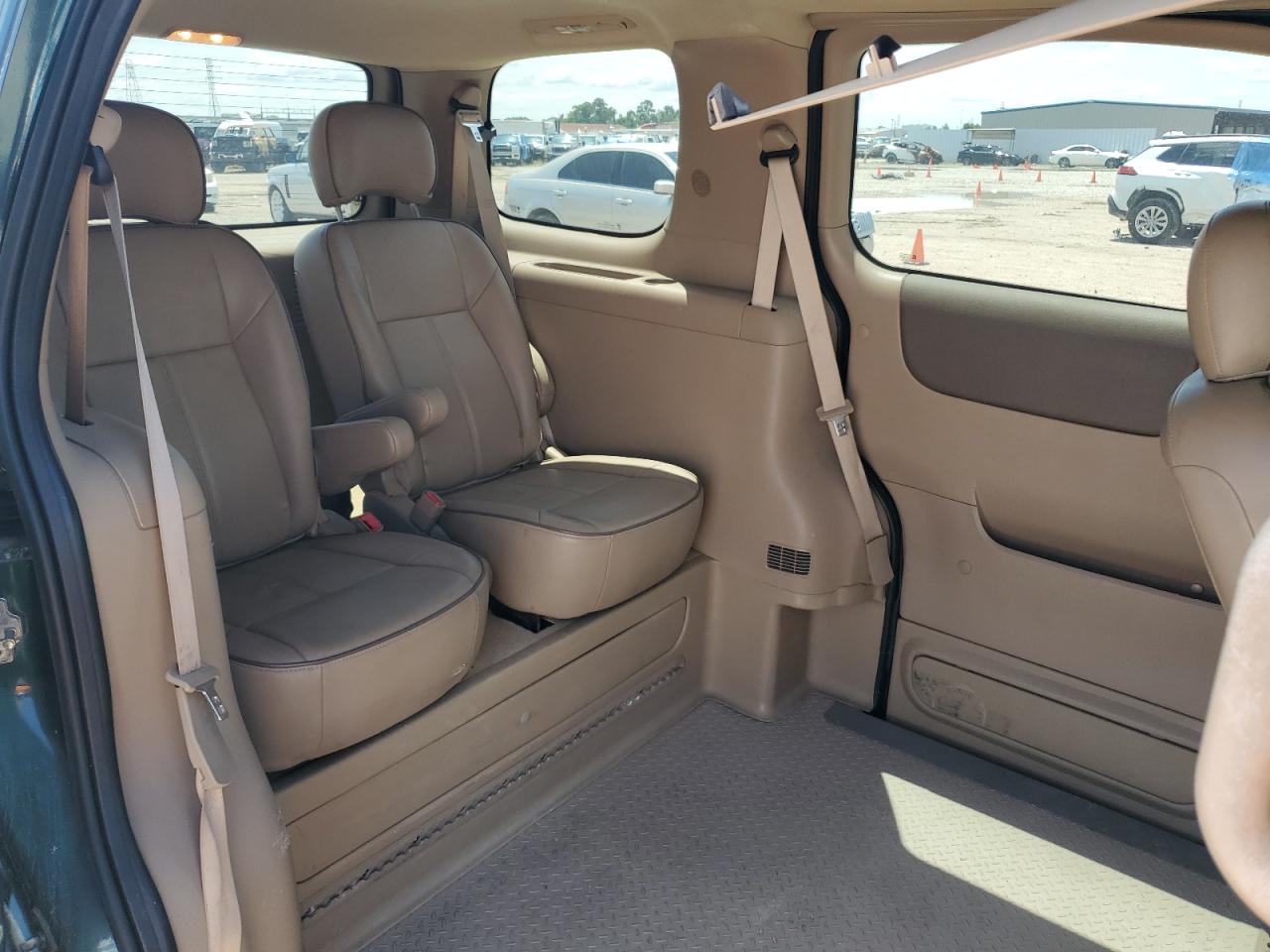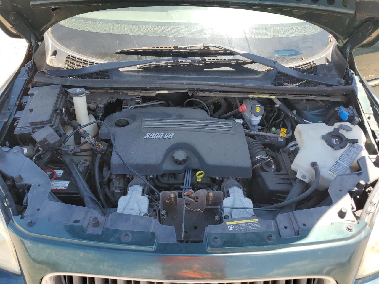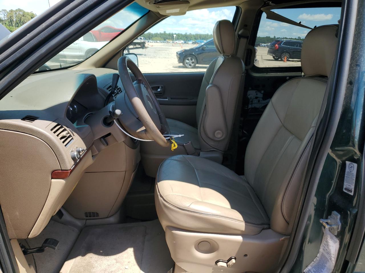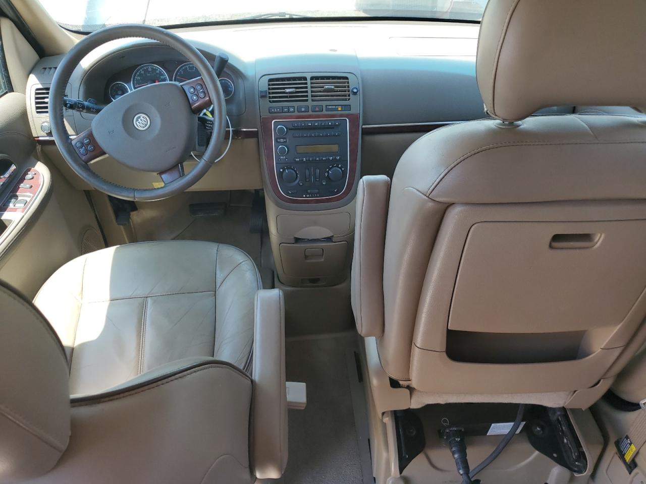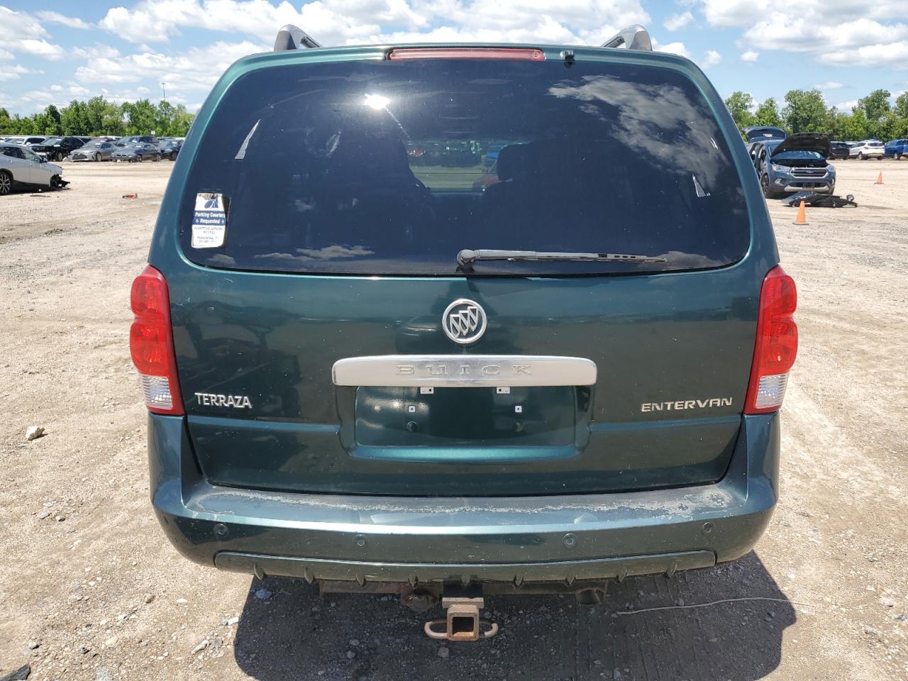 GoodThe 2006 BUICK TERRAZA, a green minivan, presents with side damage and minor dents/scratches. It is a Run & Drive Verified vehicle. The images show various angles of the exterior, including wheels, lights, and glass. The interior displays some wear and tear, and there is no immediate indication of airbag deployment. The car's overall condition reflects its age and use.