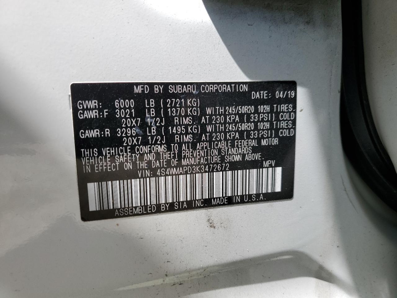FairThis is a 2019 SUBARU ASCENT LIM with white exterior. The vehicle has sustained REAR END and SIDE damage. It's a Run & Drive Verified vehicle.