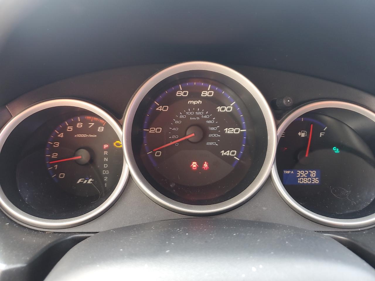 The Honda Fit has sustained front-end damage, affecting the body panels. The wheels appear to be intact. The interior shows signs of wear consistent with age. No airbag deployment is noted. The lights and glass appear intact.
