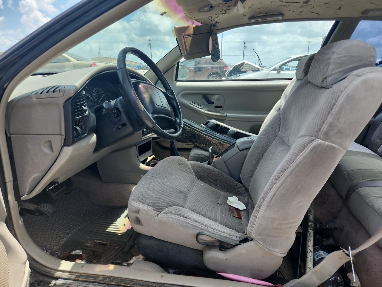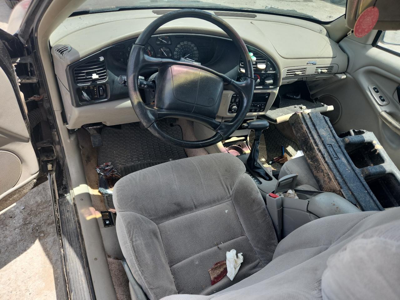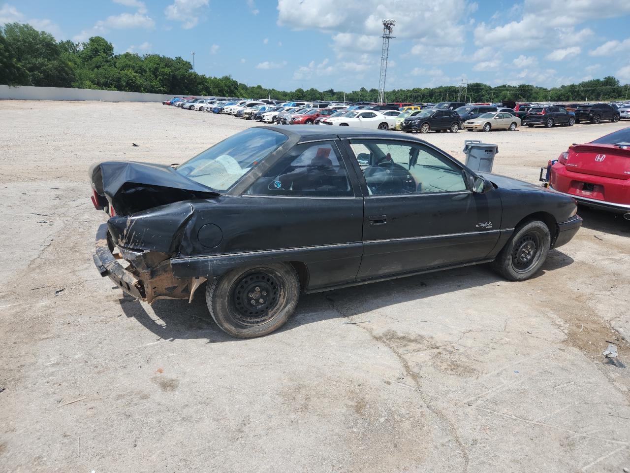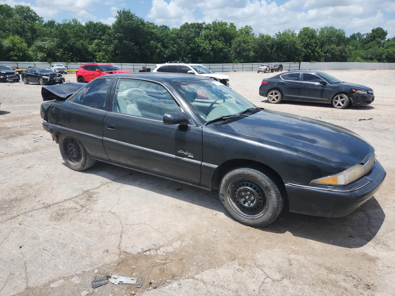 FairThis 1997 BUICK SKYLARK CU is black, with significant body damage. The exterior shows extensive damage, particularly at the rear with the bumper severely damaged, and body panels crumpled. Wheels and glasses are present. The interior also shows damage, the seats and dashboard has visible damage. The airbag is not visible so it hard to tell. The car's overall condition is rated as 'Fair'.