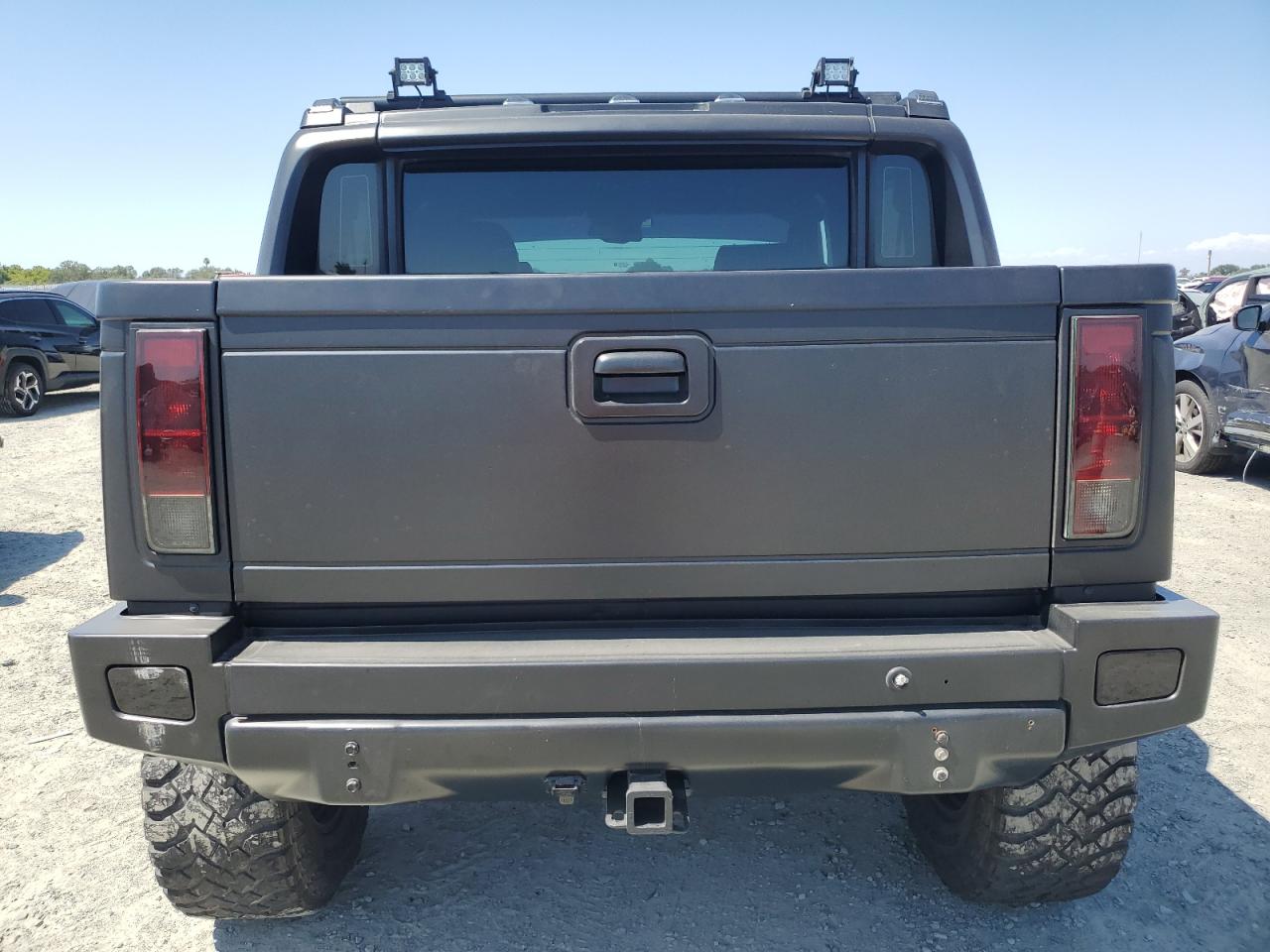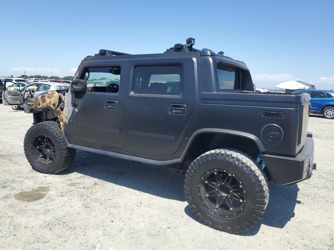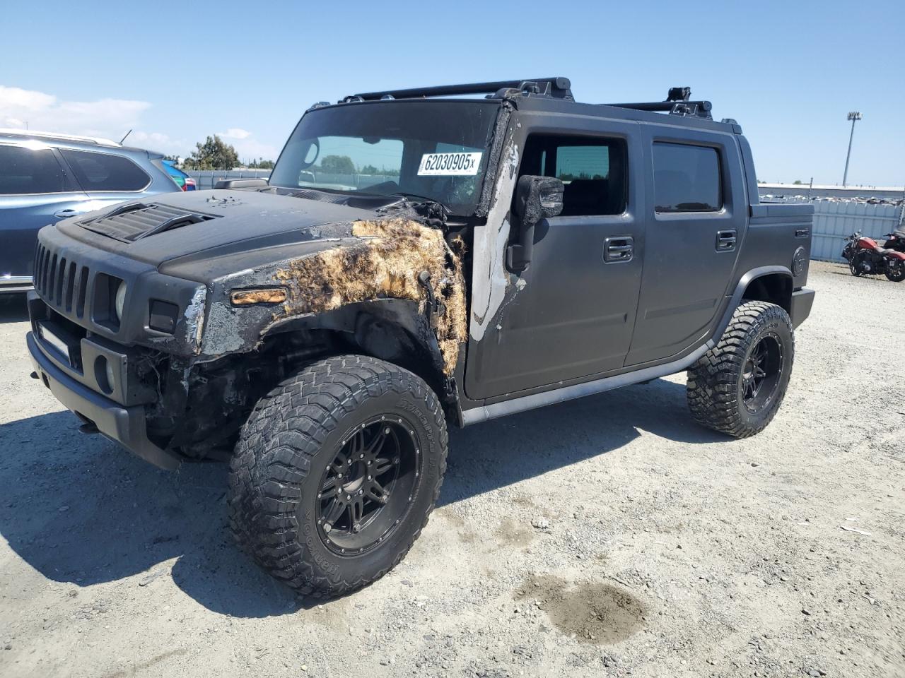 FairThe 2006 HUMMER H2 SUT, colored gray, exhibits significant exterior damage, categorized as 'Body' damage. The front of the vehicle shows extensive burn damage, including the front panel, and the driver's side door is missing. The wheels appear intact. The interior shows some wear and tear, but no significant damage. The airbags status is unknown.