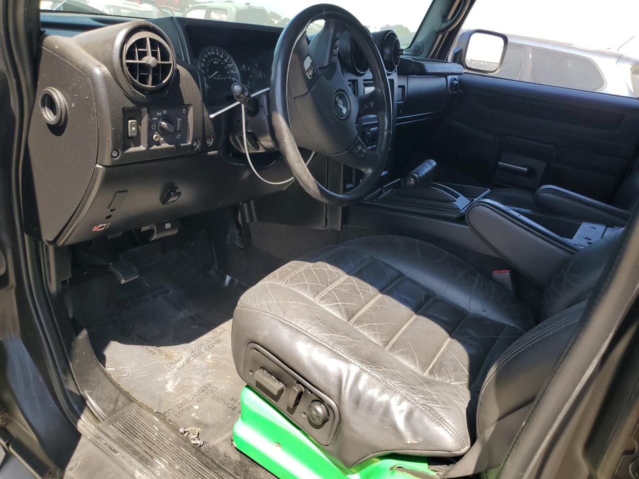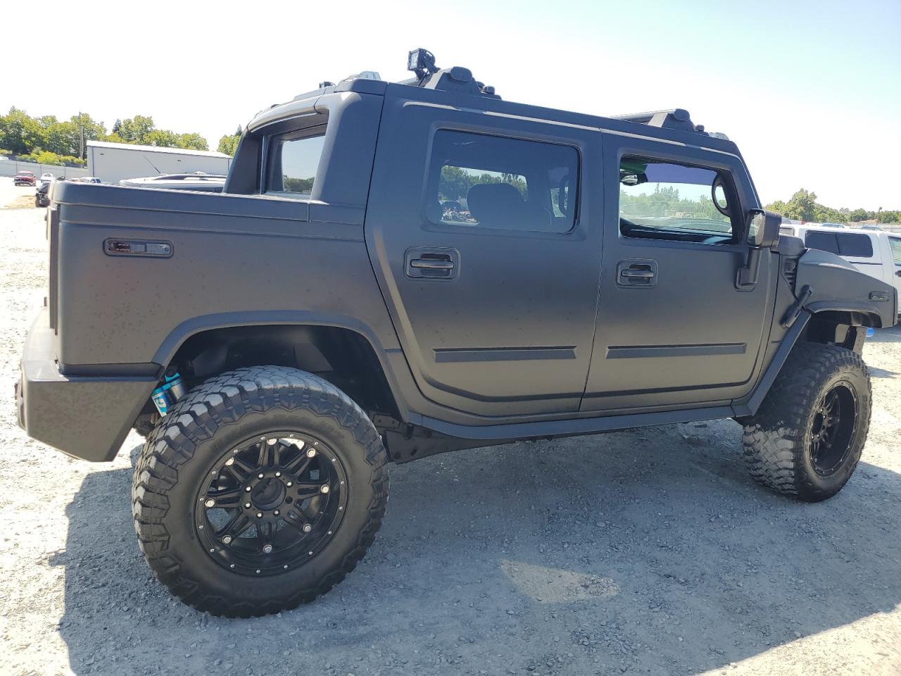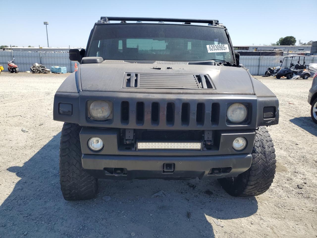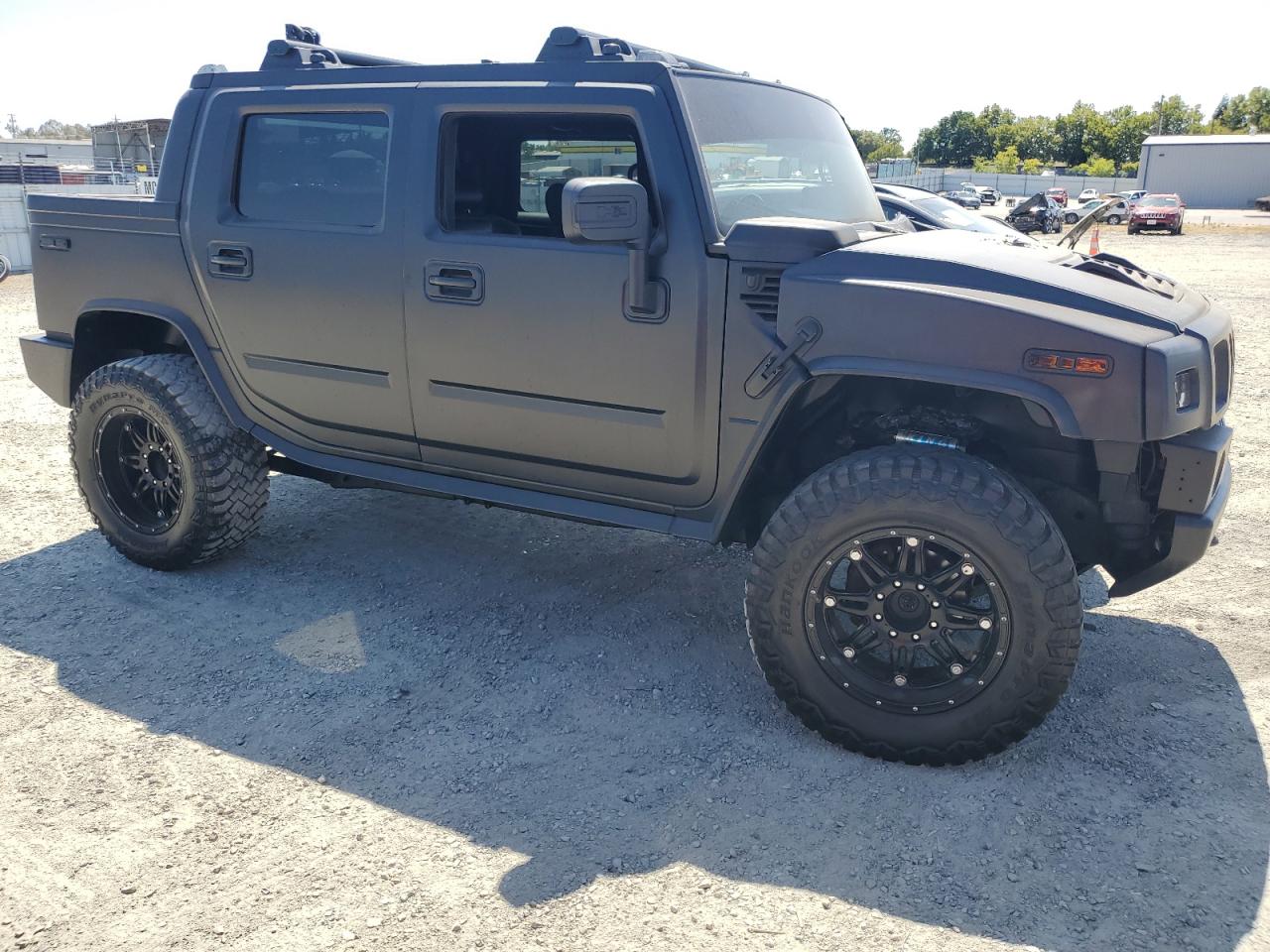 FairThe 2006 HUMMER H2 SUT, colored gray, exhibits significant exterior damage, categorized as 'Body' damage. The front of the vehicle shows extensive burn damage, including the front panel, and the driver's side door is missing. The wheels appear intact. The interior shows some wear and tear, but no significant damage. The airbags status is unknown.