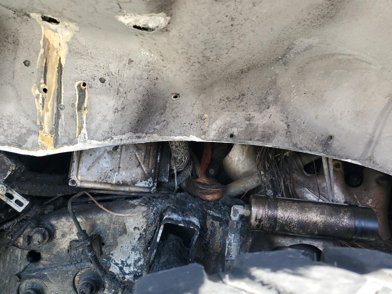 The vehicle has significant body damage with burn damage. The driver's side door is missing. The interior is in good condition.