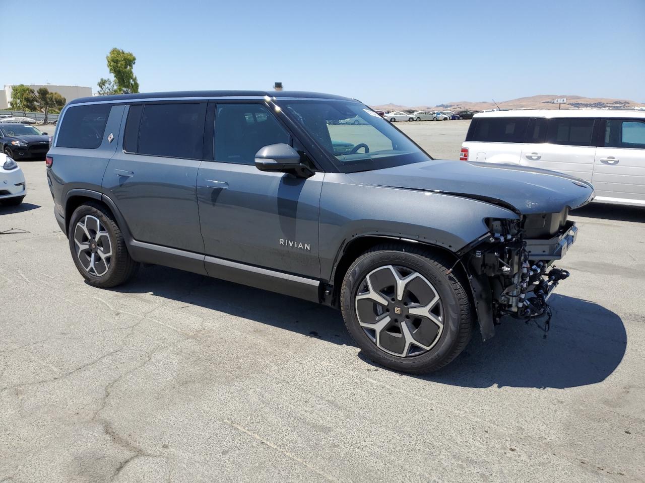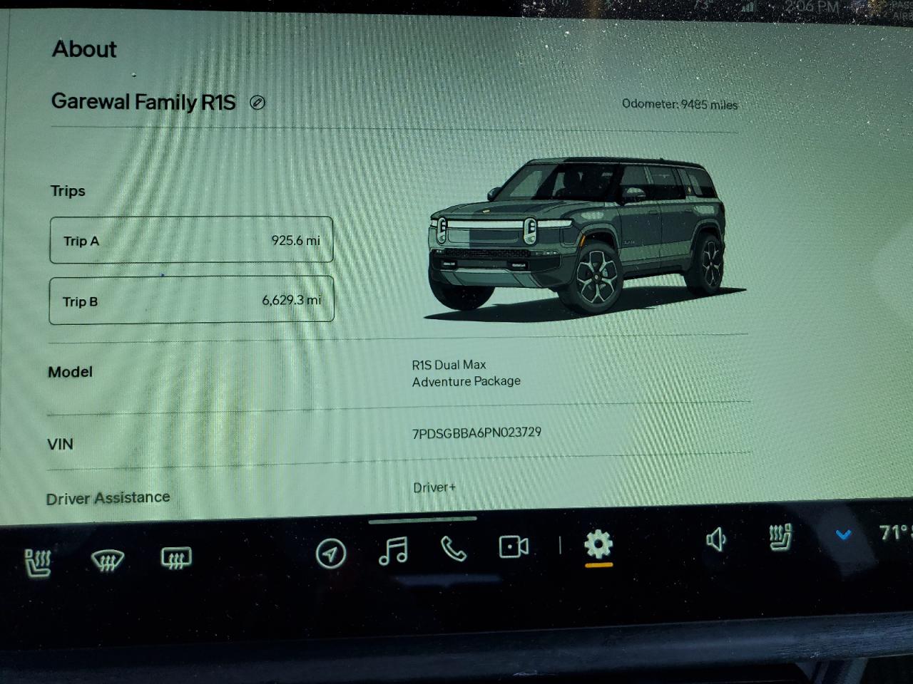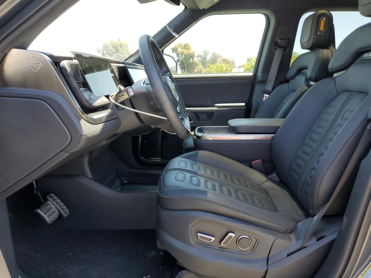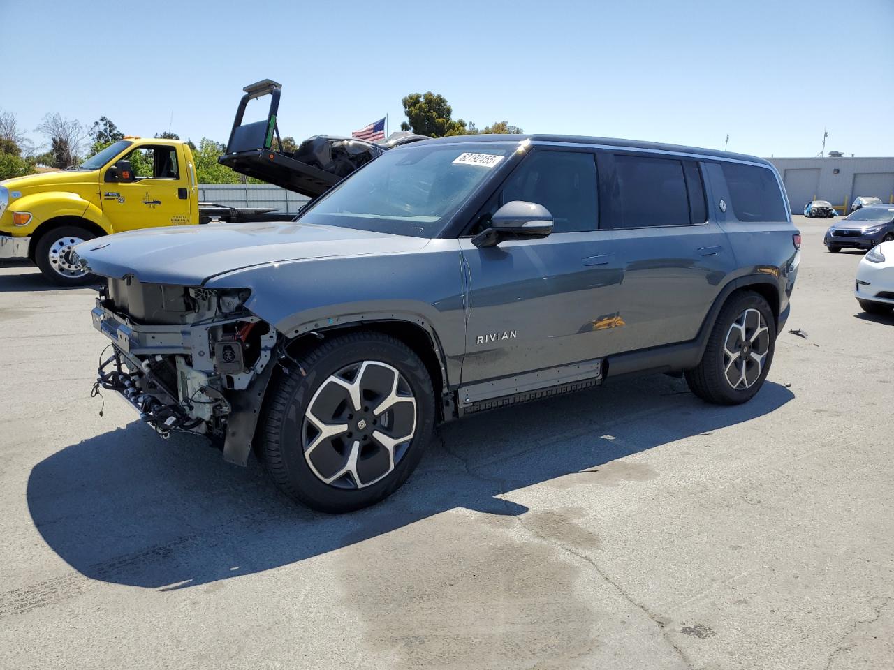 FairThis 2023 Rivian R1S Adventure is a gray electric SUV, showing front-end damage. The front fascia, including lights and bumper, is heavily damaged. The wheels appear intact. The interior shows minimal wear. The vehicle is a Run & Drive Verified.