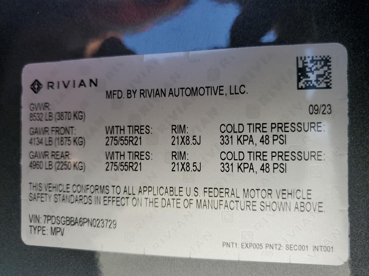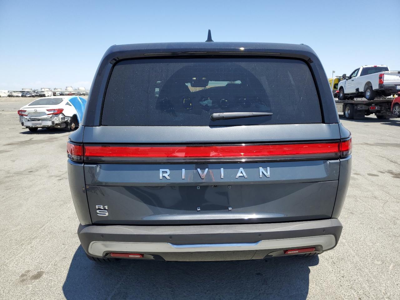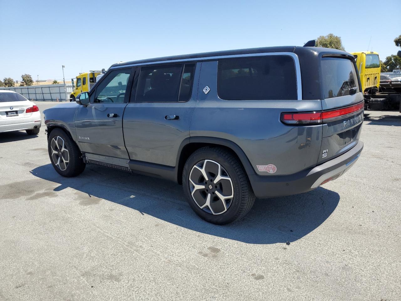 FairThis 2023 Rivian R1S Adventure is a gray electric SUV, showing front-end damage. The front fascia, including lights and bumper, is heavily damaged. The wheels appear intact. The interior shows minimal wear. The vehicle is a Run & Drive Verified.
