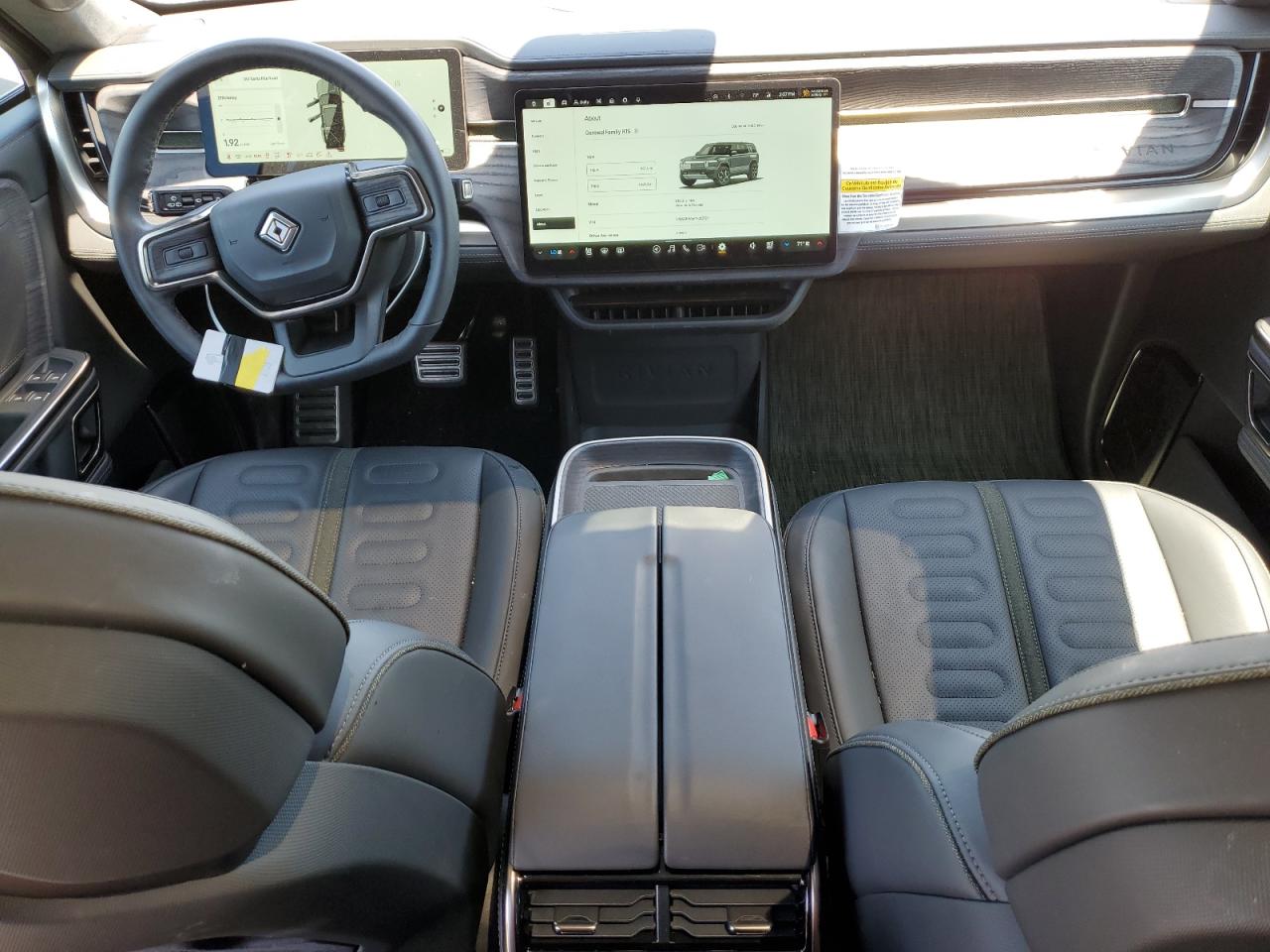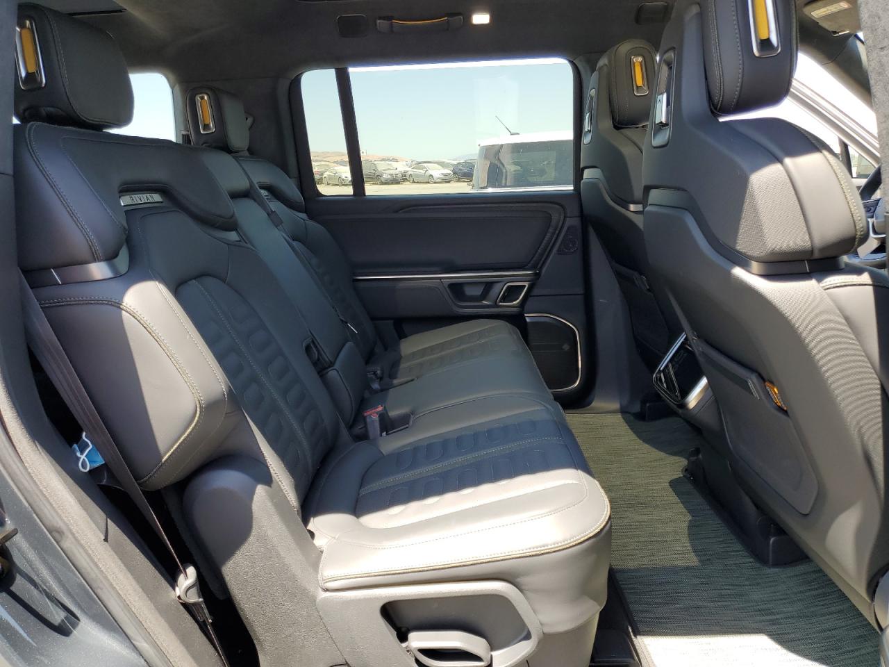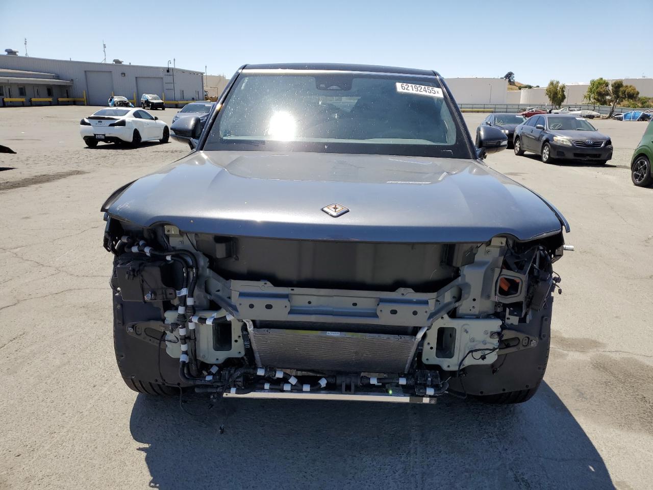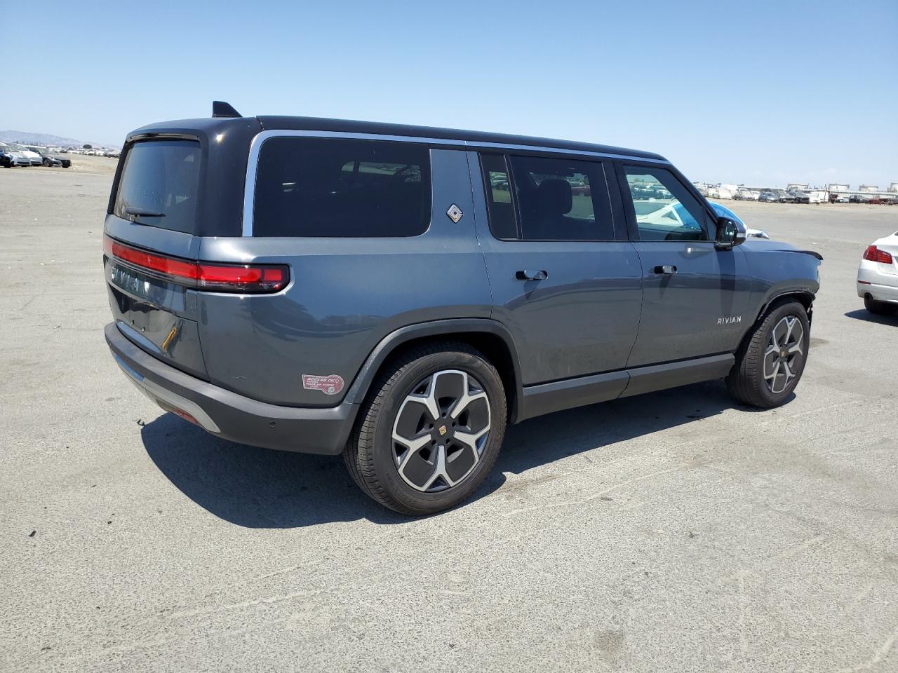 FairThis 2023 Rivian R1S Adventure is a gray electric SUV, showing front-end damage. The front fascia, including lights and bumper, is heavily damaged. The wheels appear intact. The interior shows minimal wear. The vehicle is a Run & Drive Verified.