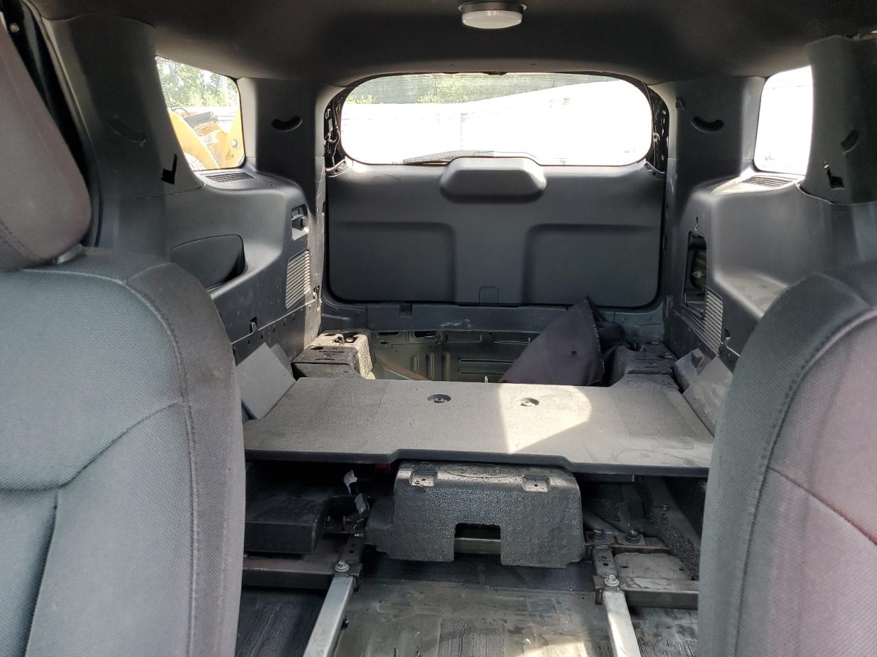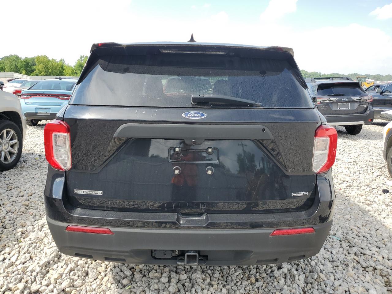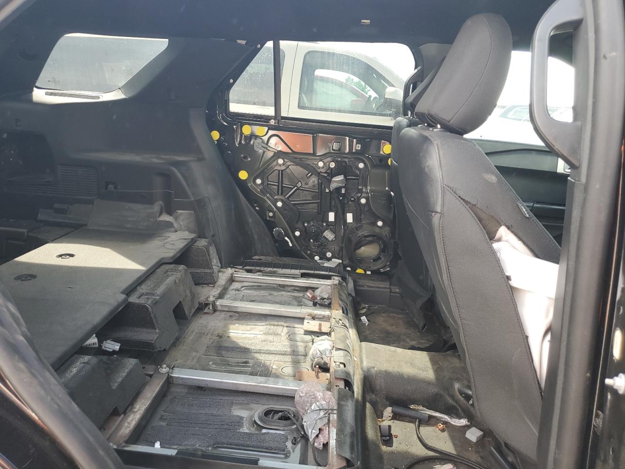 FairThis is a black 2021 Ford Explorer Police Interceptor with significant damage. The front end shows extensive damage, including missing body panels, indicating a frontal collision. The side of the vehicle also exhibits damage. The interior appears to have sustained some damage, and the airbags deployed. The wheels appear to be intact.