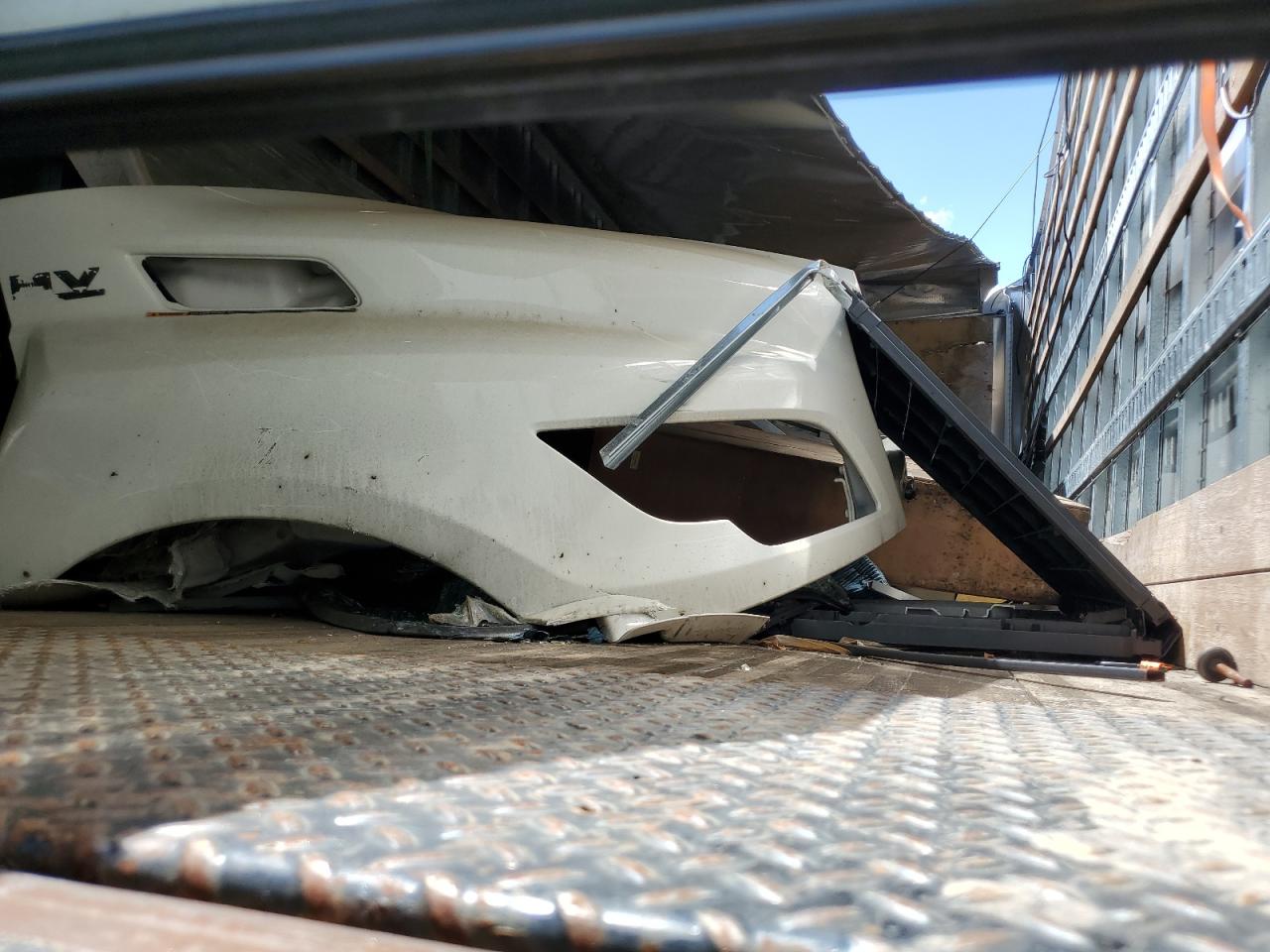The vehicle exhibits severe damage across multiple areas. The front end has sustained major impact, leading to structural issues, including significant damage to the cabin area and roof. The body panels are crushed and twisted. The interior shows moderate damage. The lights and windows are likely damaged. The airbags may have been deployed.