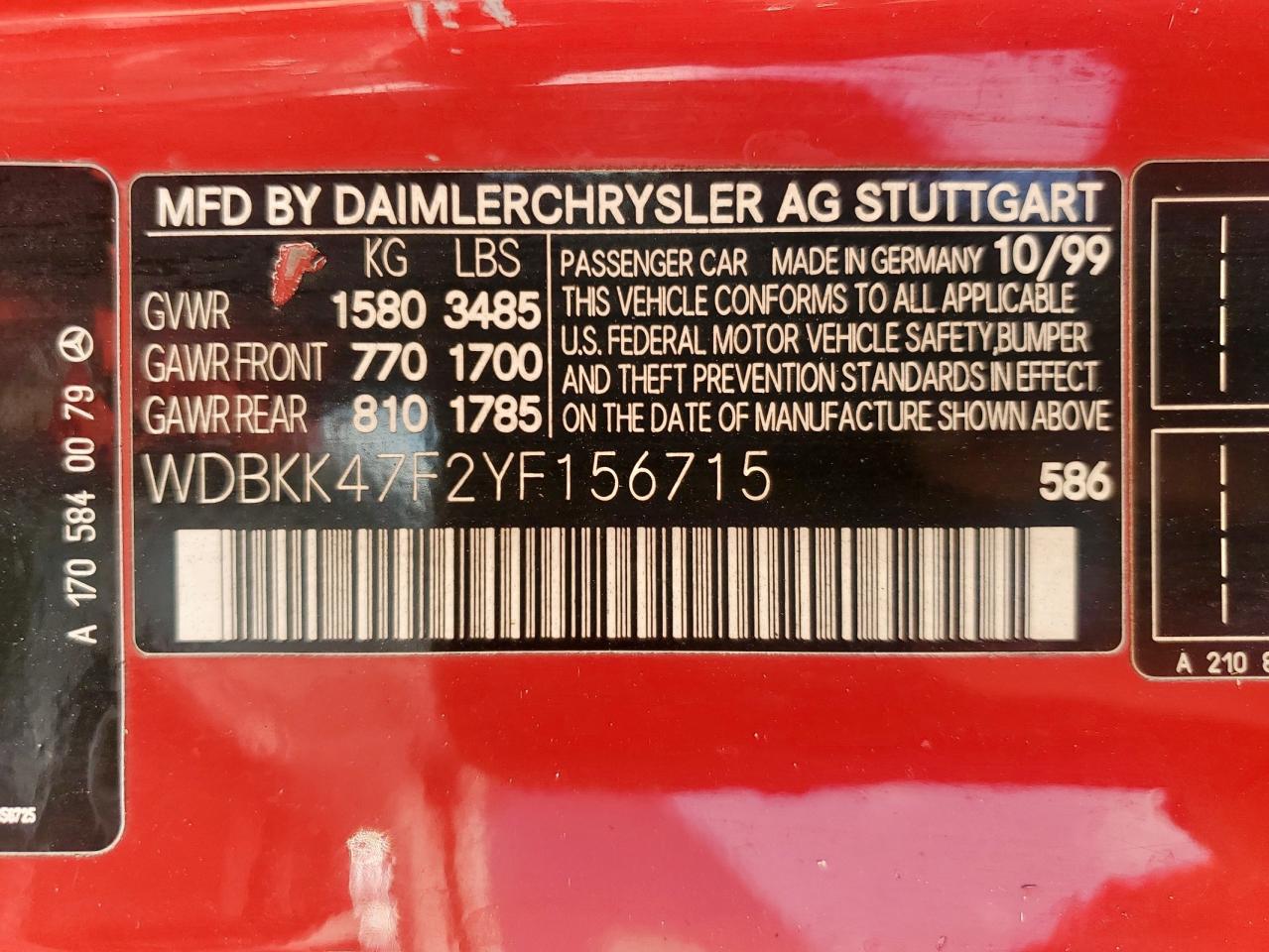FairThe 2000 MERCEDES-BENZ SLK 230 KO, is red. The primary damage is all over the body, with no secondary damage identified. The airbags have deployed, indicating a significant impact. The interior shows signs of damage. The vehicle's exterior exhibits moderate visible damage.
