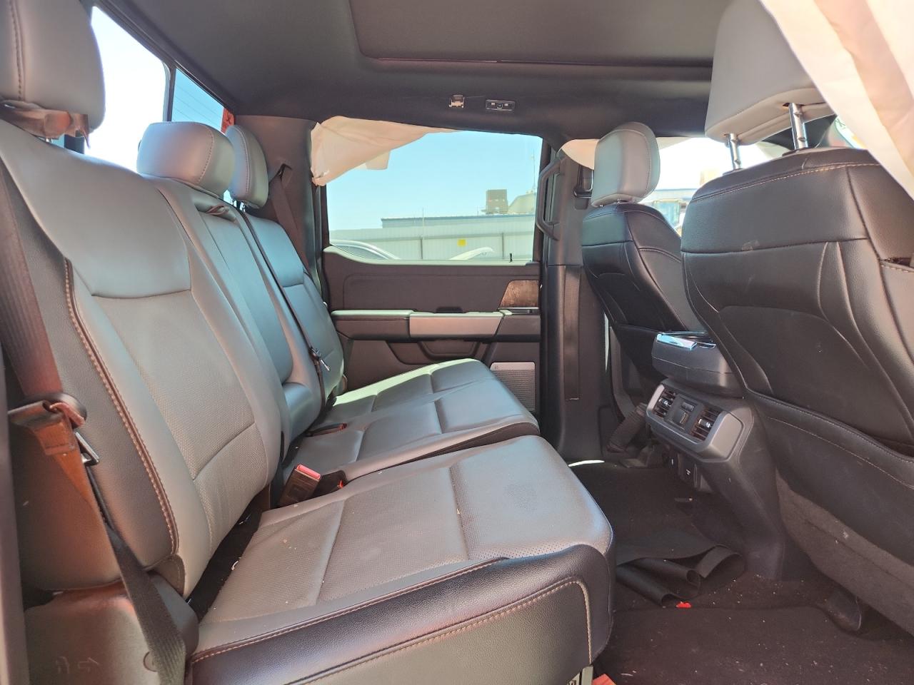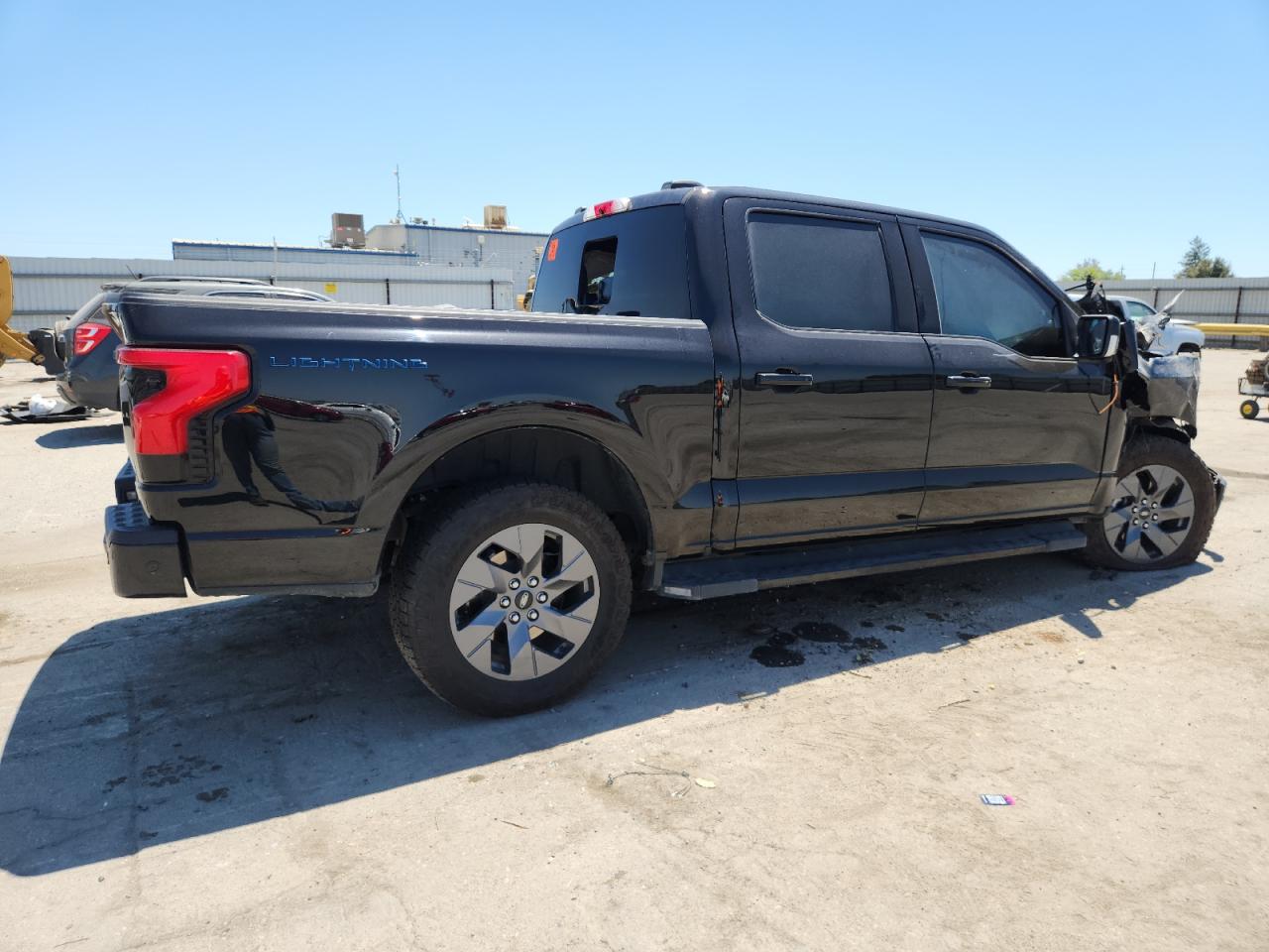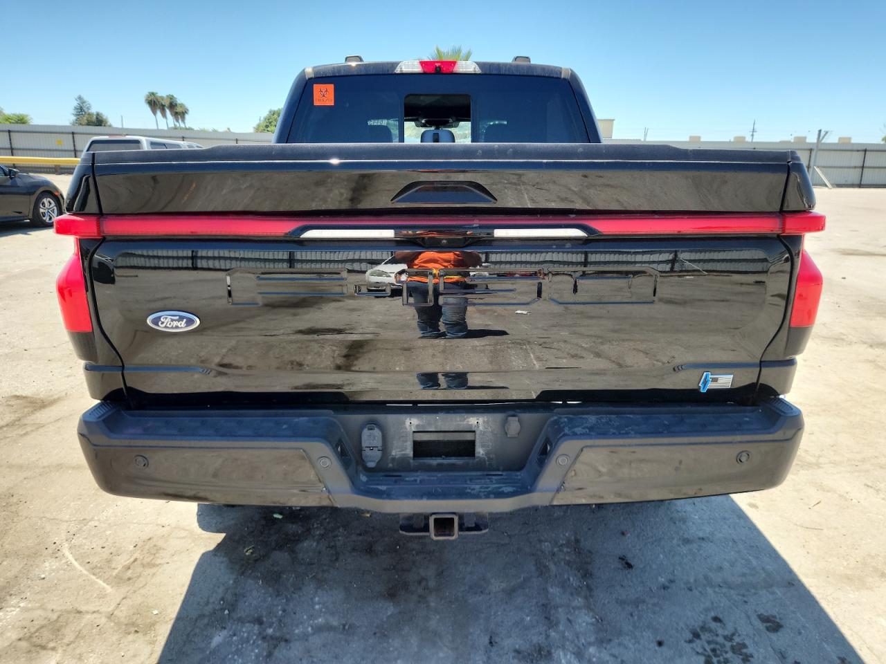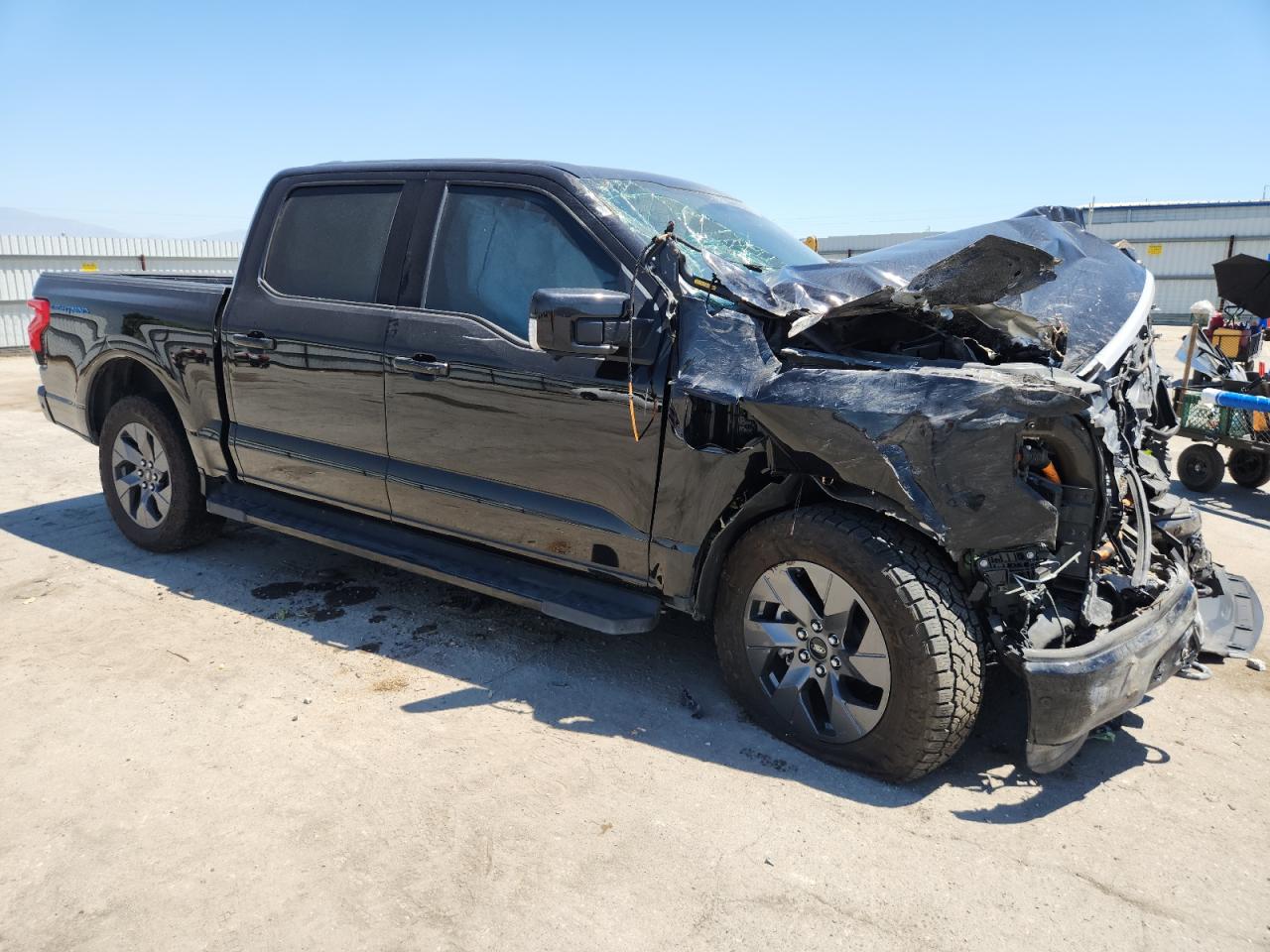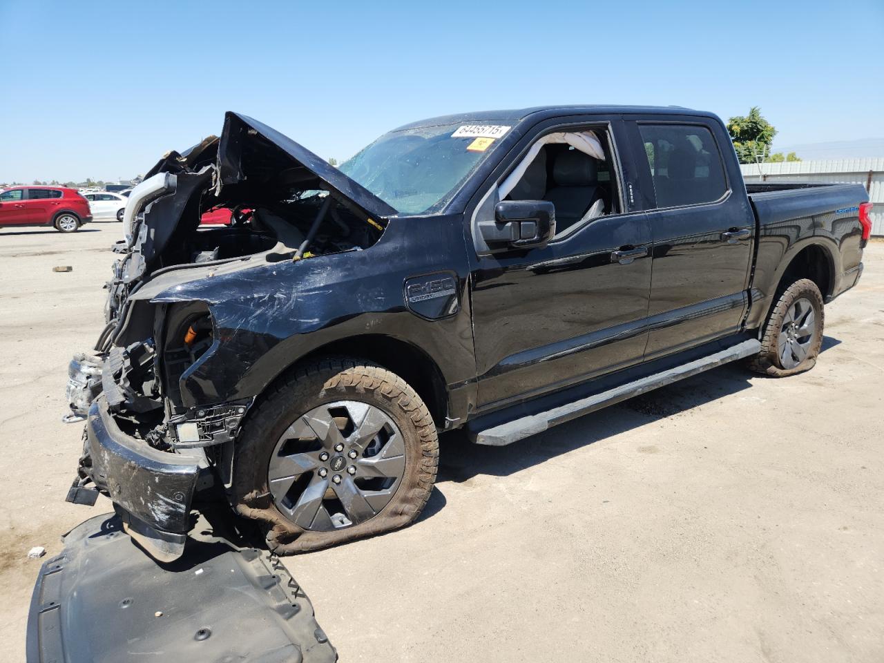 The Ford F-150 Lightning sustained severe front-end damage, with a crushed front, deployed airbags, and damaged wheels. The interior also shows significant damage. The vehicle is not in a drivable condition.