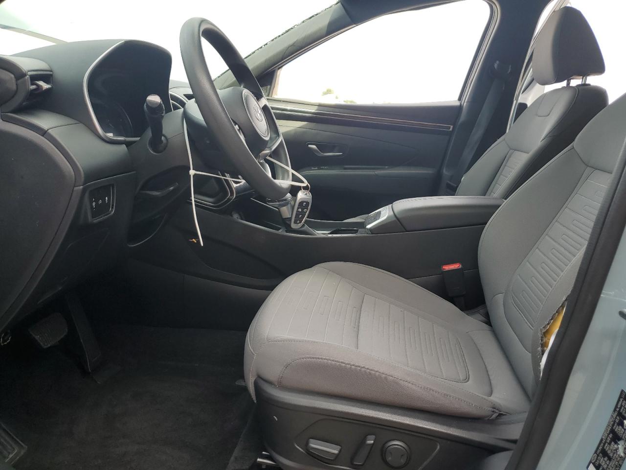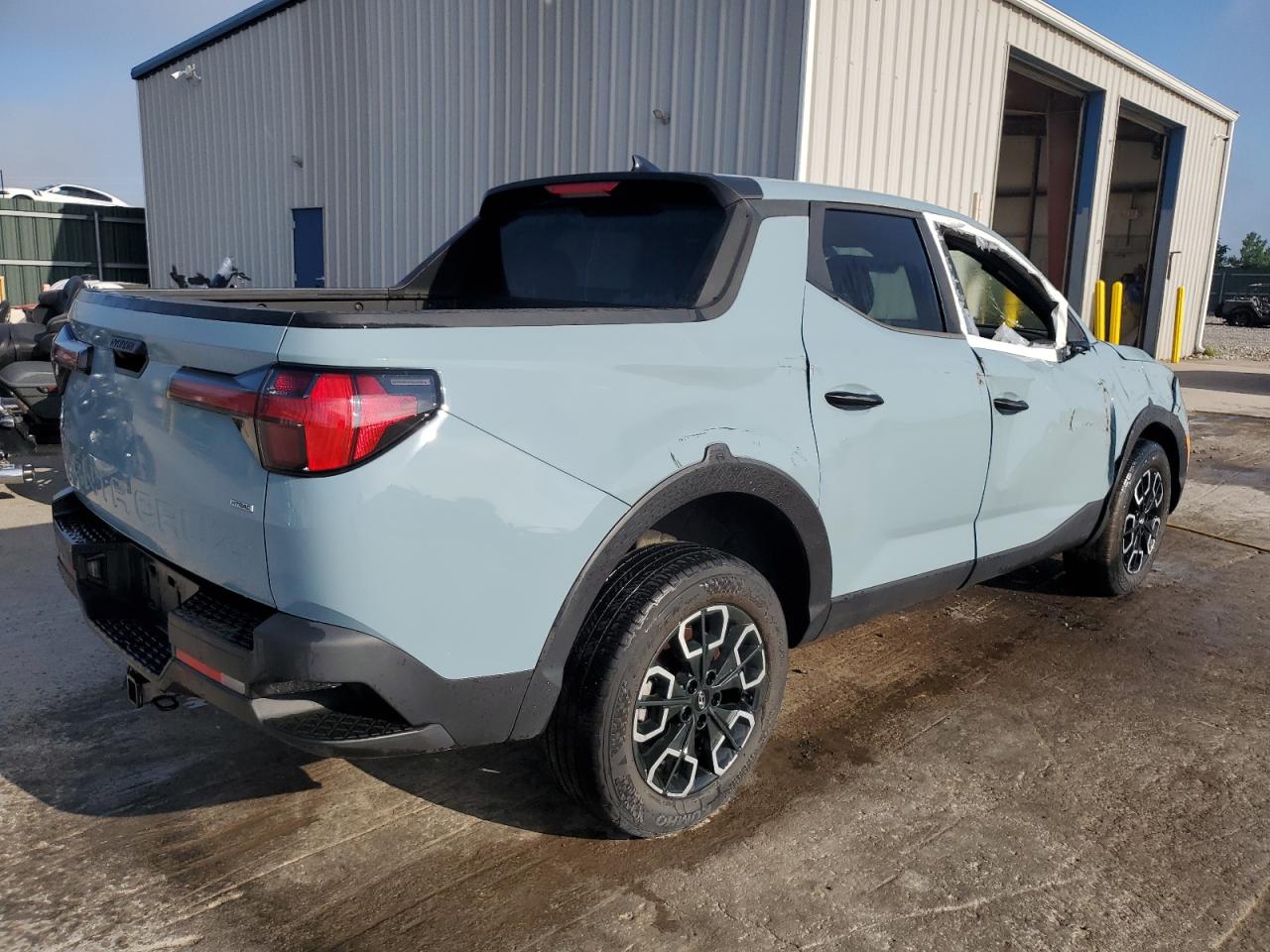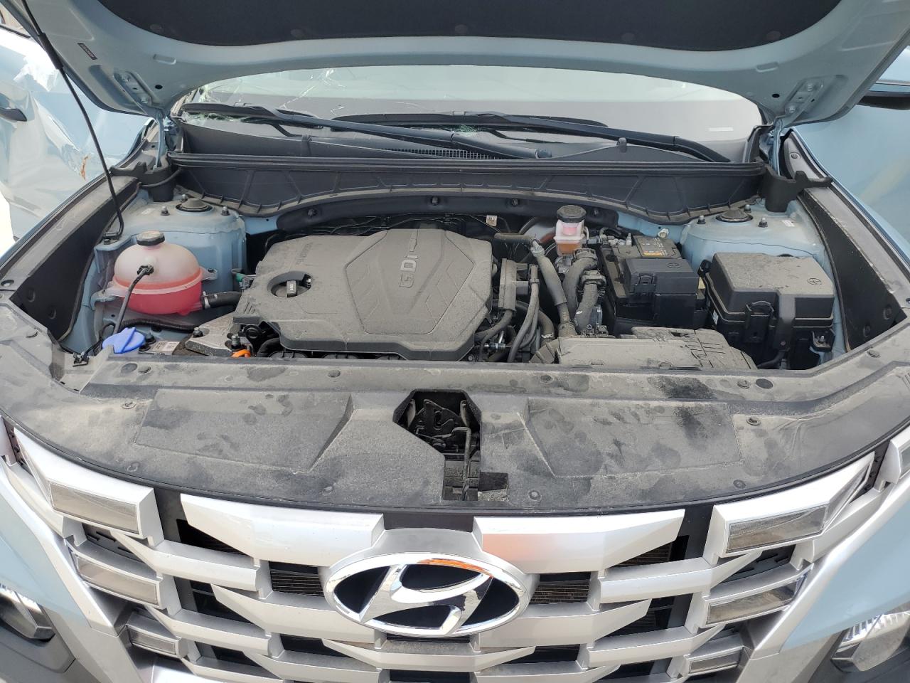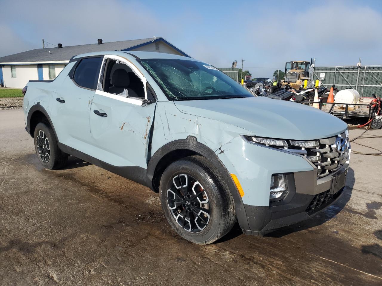 FairThis is a damaged 2022 Hyundai Santa Cruz. The vehicle has sustained significant damage. The primary damage is to the side, and the secondary damage is to the front end. The color of the car is blue. The wheels appear to be in decent condition, and the lights are present, but the glass has sustained damage, including the windshield. The interior shows signs of use, but its overall condition is good. There is potential airbag deployment.