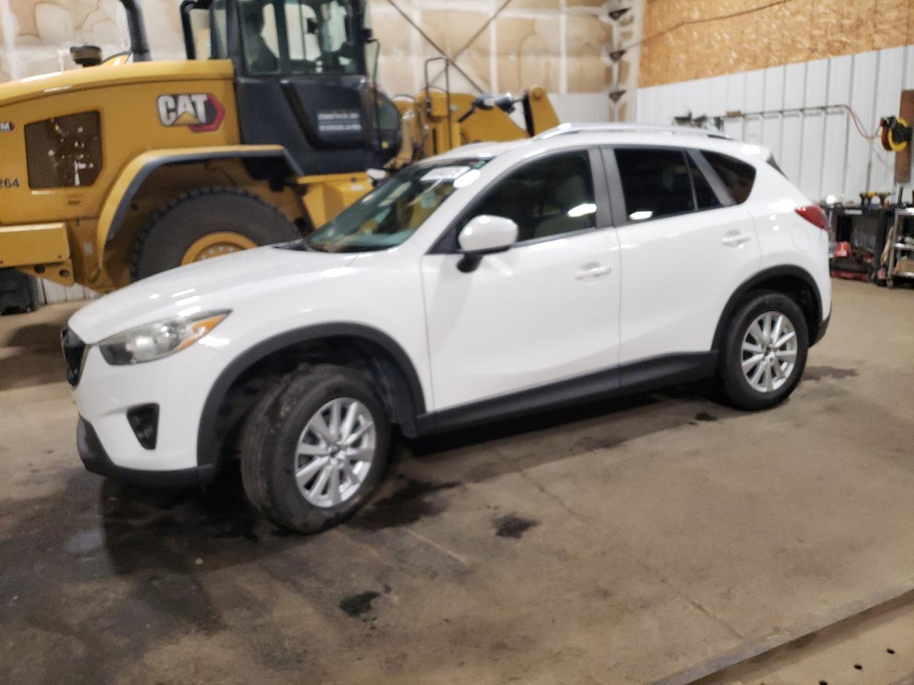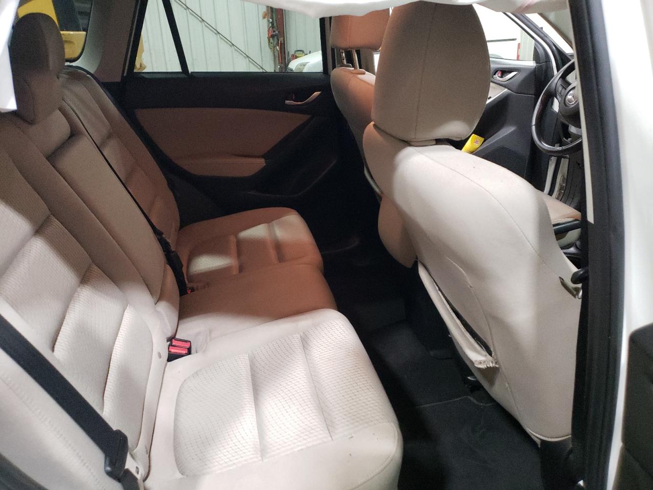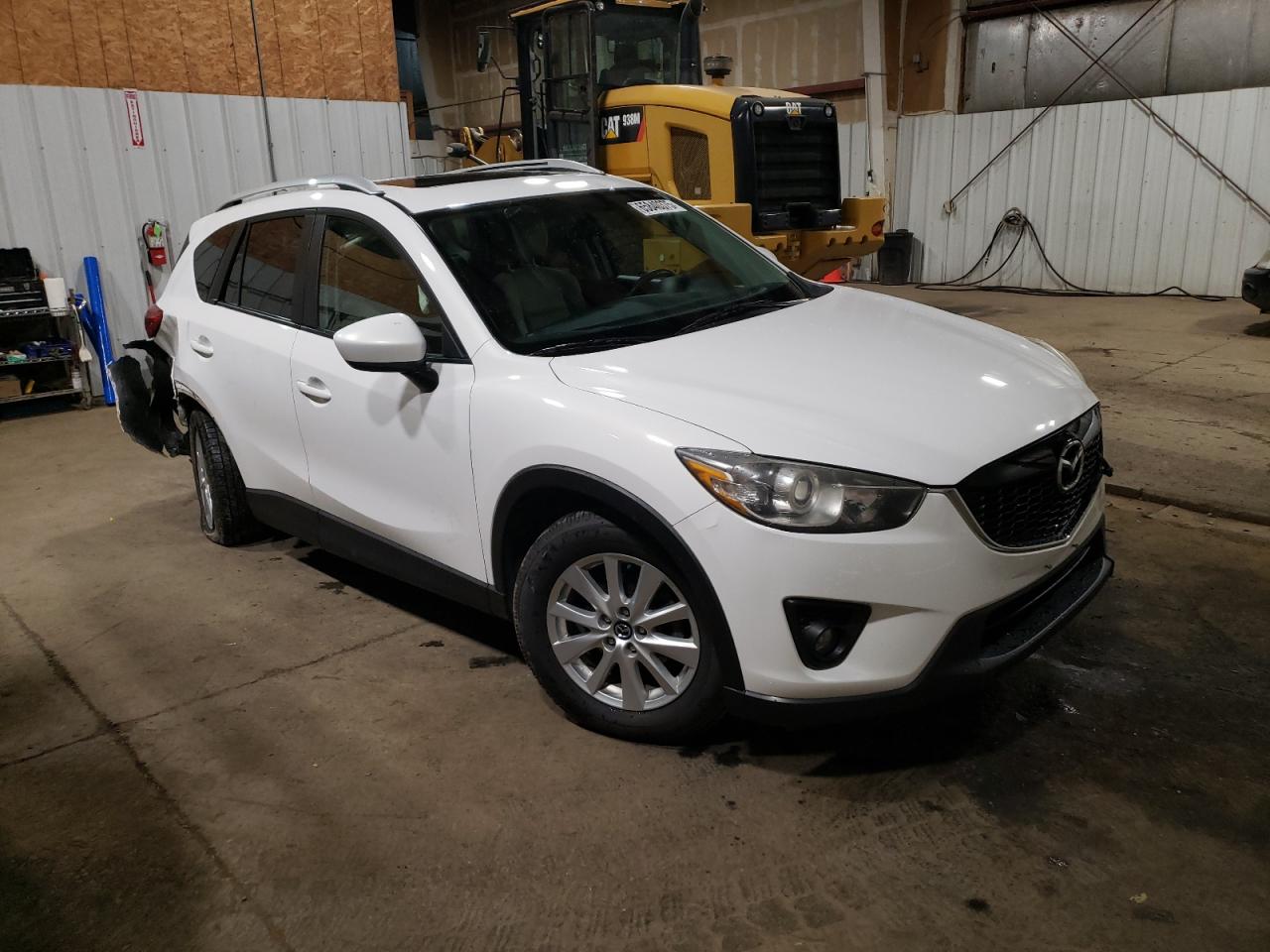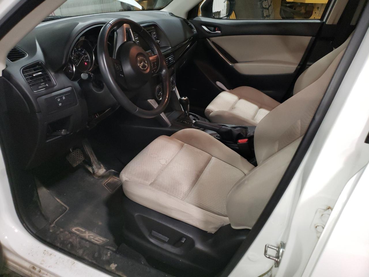 FairThis is a 2014 Mazda CX-5 Touring with significant rear-end damage. The primary damage is to the rear body panels. The car's color is white. The vehicle starts. The interior shows normal wear and tear. The vehicle's condition is drivable.