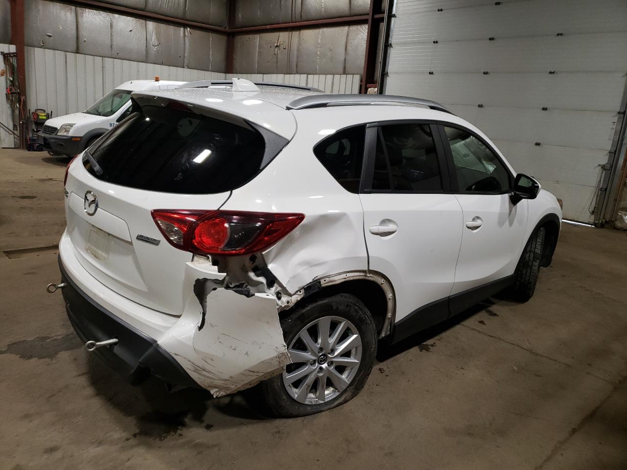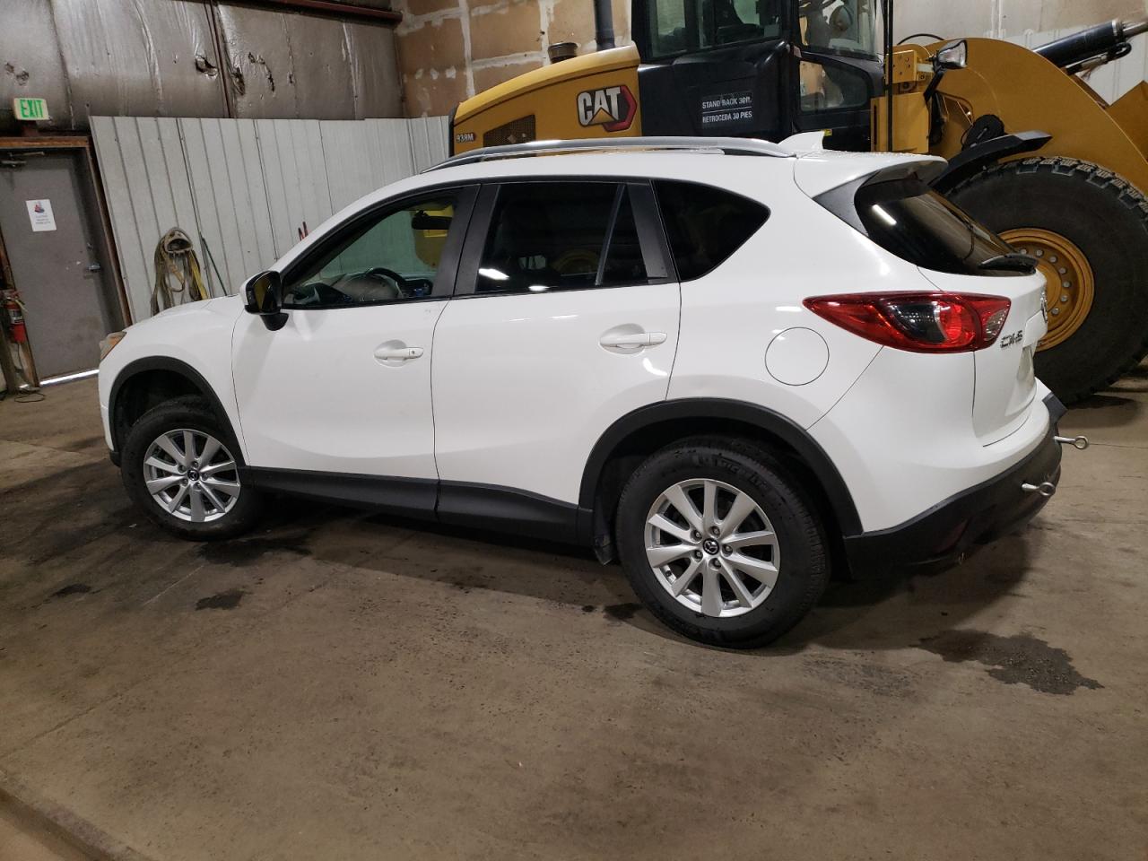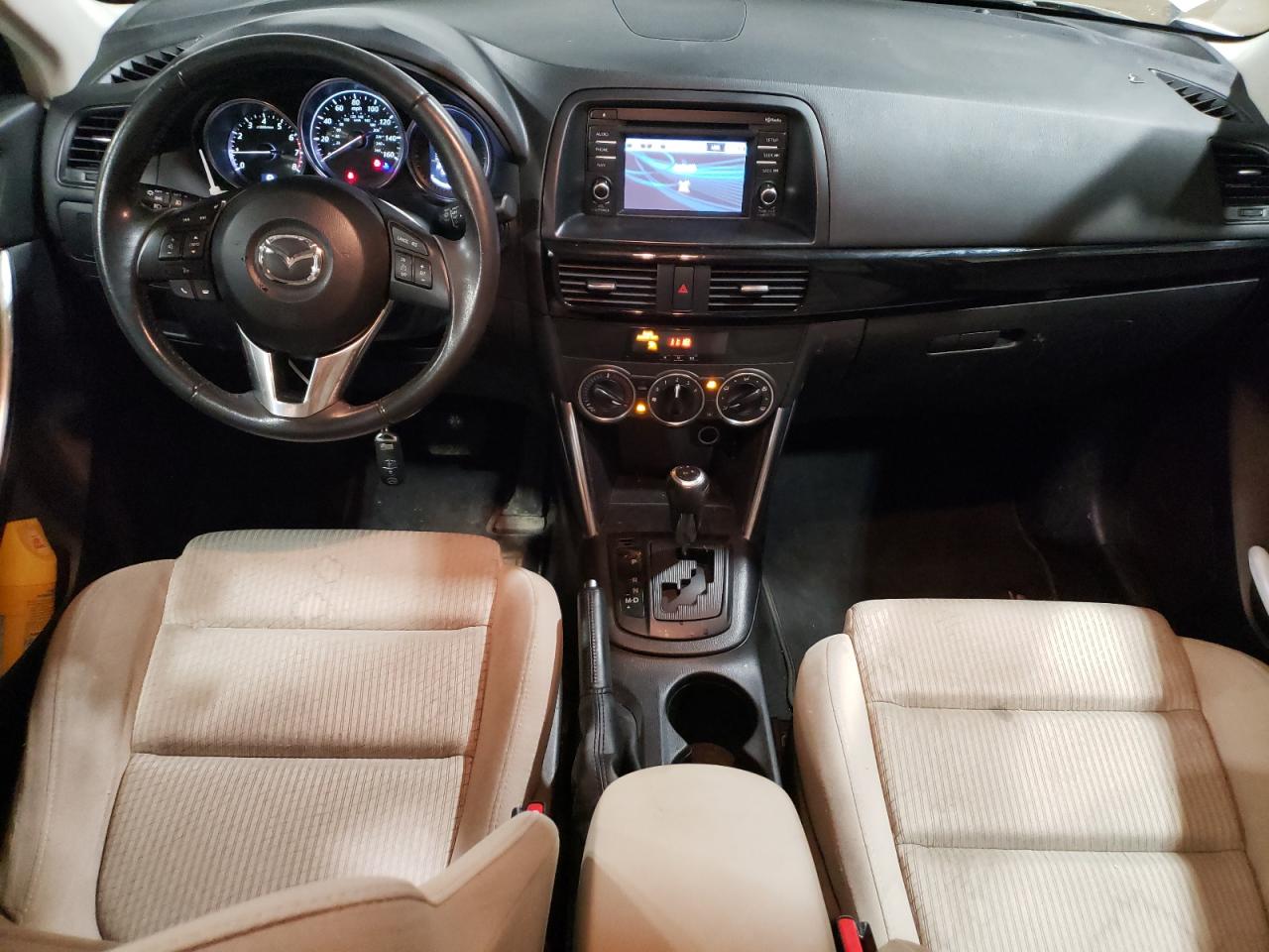 FairThis is a 2014 Mazda CX-5 Touring with significant rear-end damage. The primary damage is to the rear body panels. The car's color is white. The vehicle starts. The interior shows normal wear and tear. The vehicle's condition is drivable.
