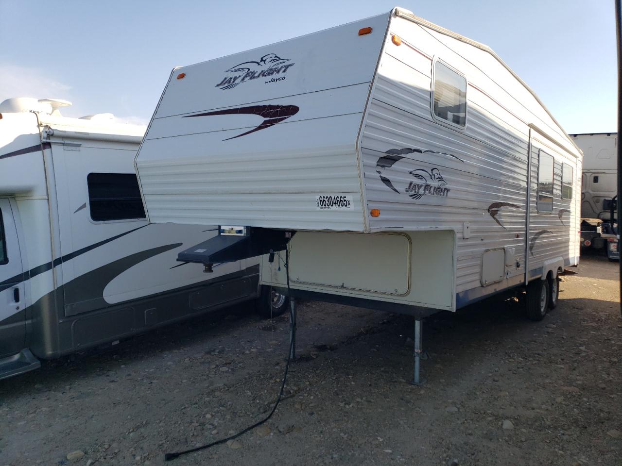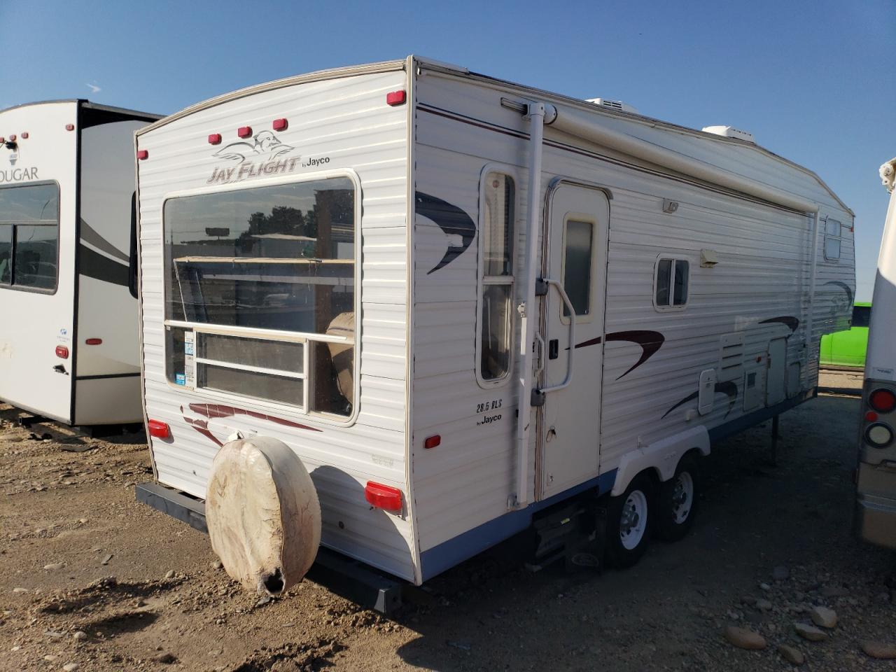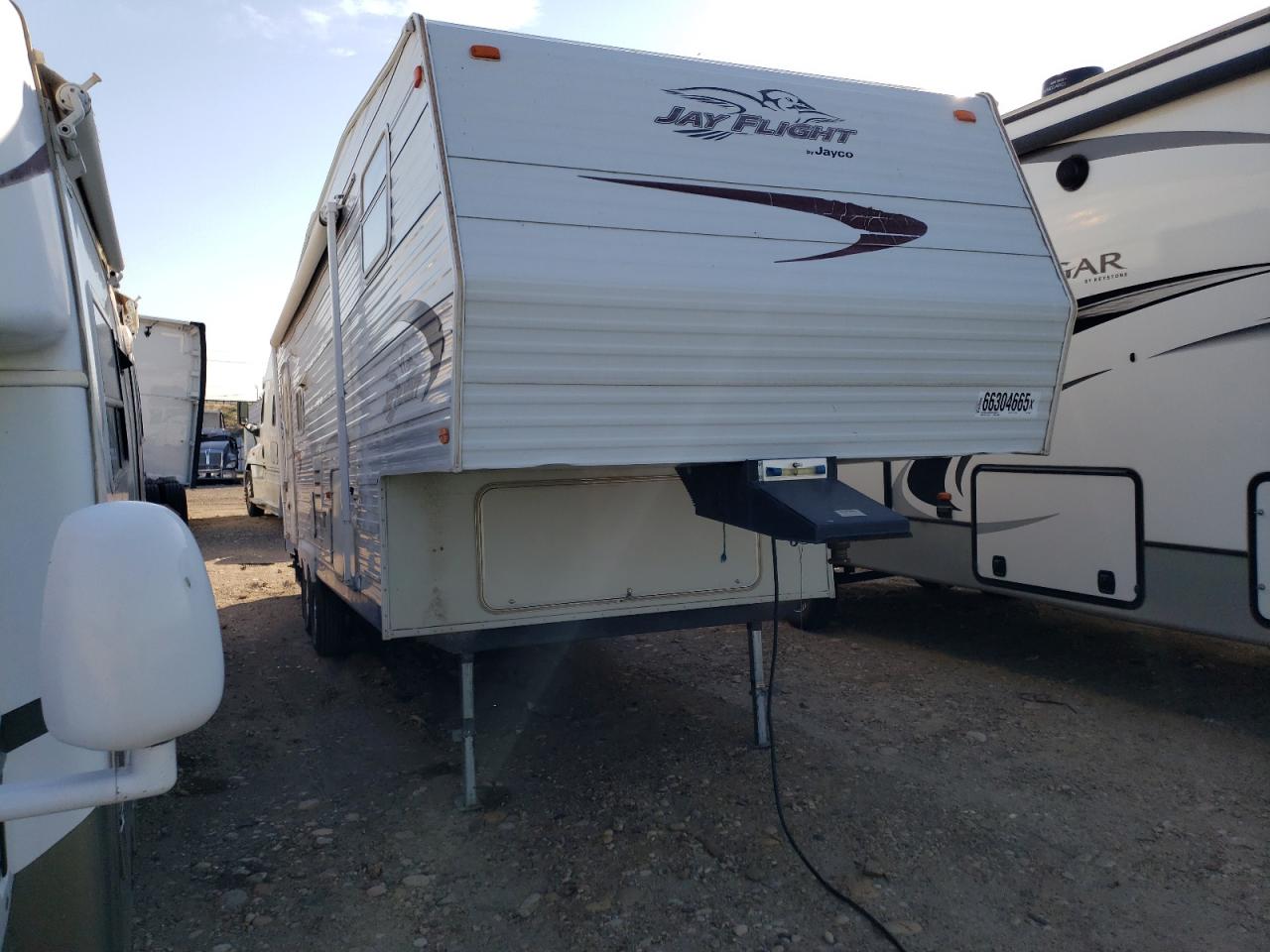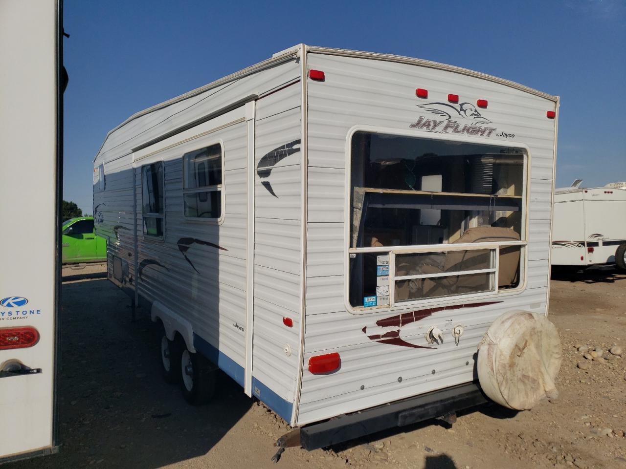 FairThe 2005 Jayco Jay Flight RV shows signs of water/flood damage. The exterior, primarily white, exhibits moderate damage affecting its overall condition. The interior also reflects the impact of water. The wheels appear to be functional. The lights and glasses seem intact. The vehicle's state indicates a need for repair, with drivability potentially affected.