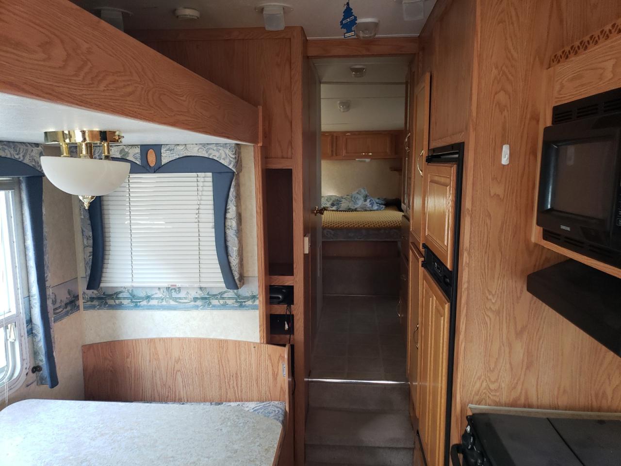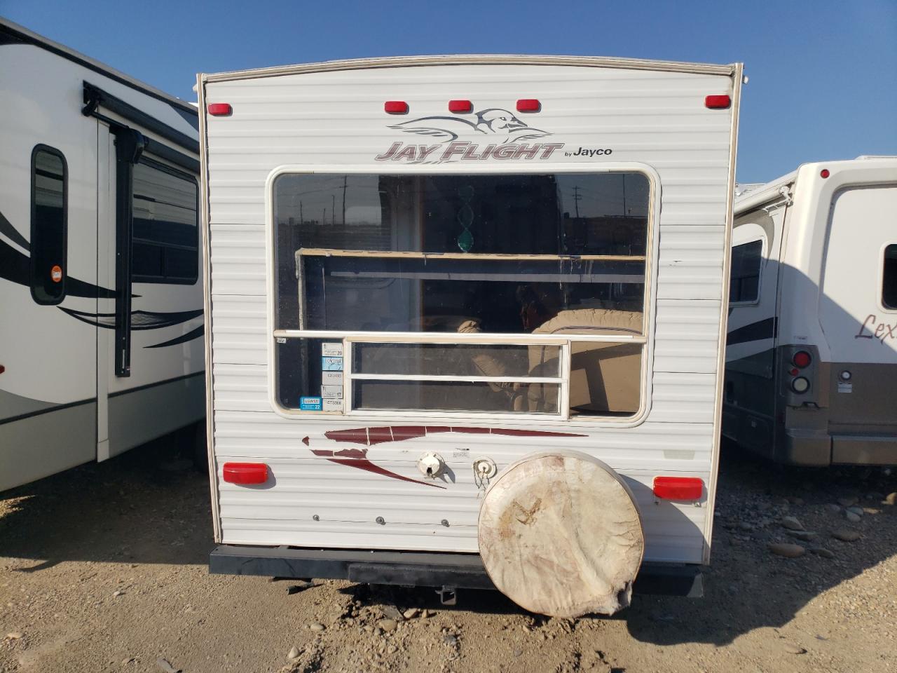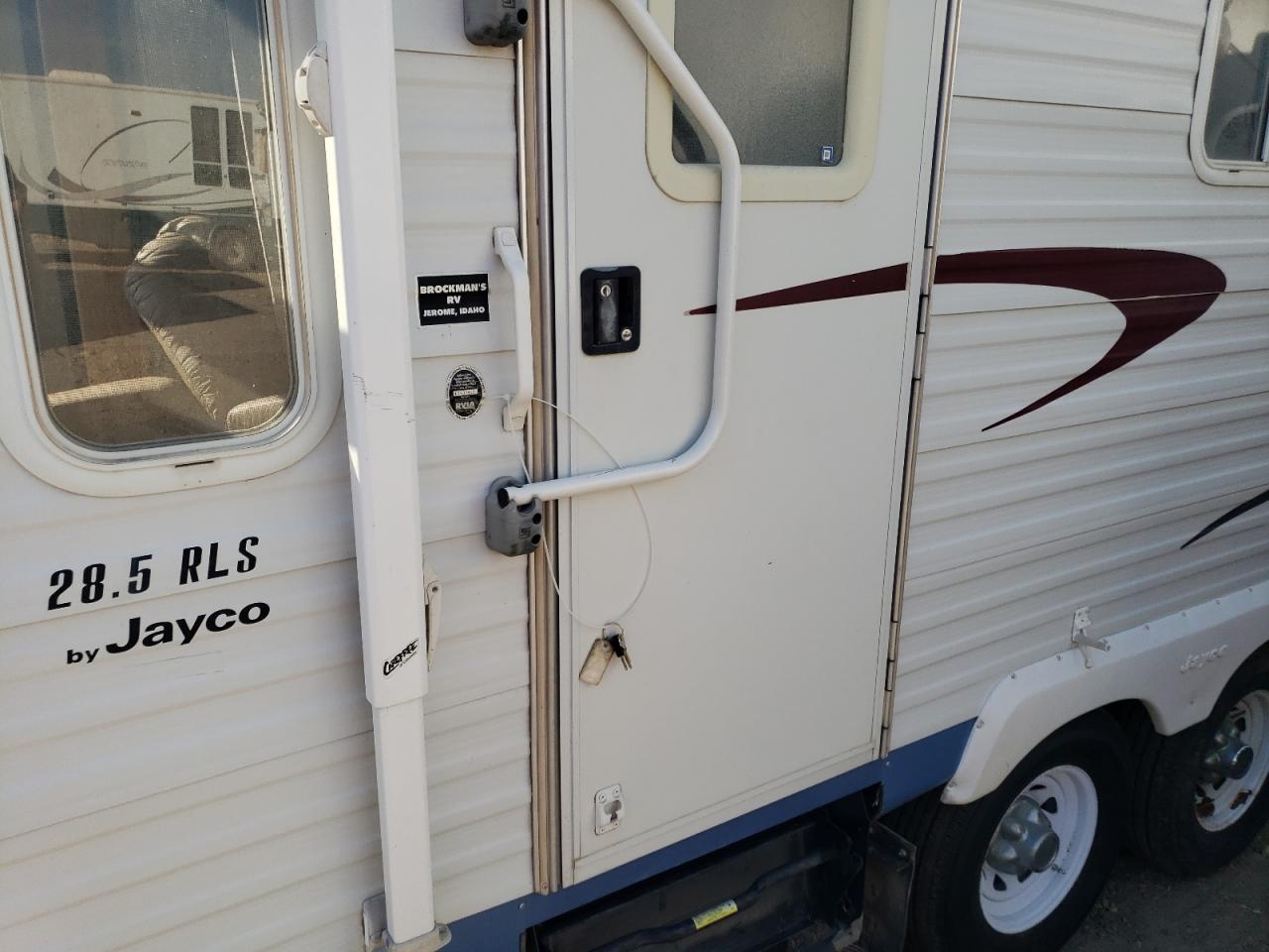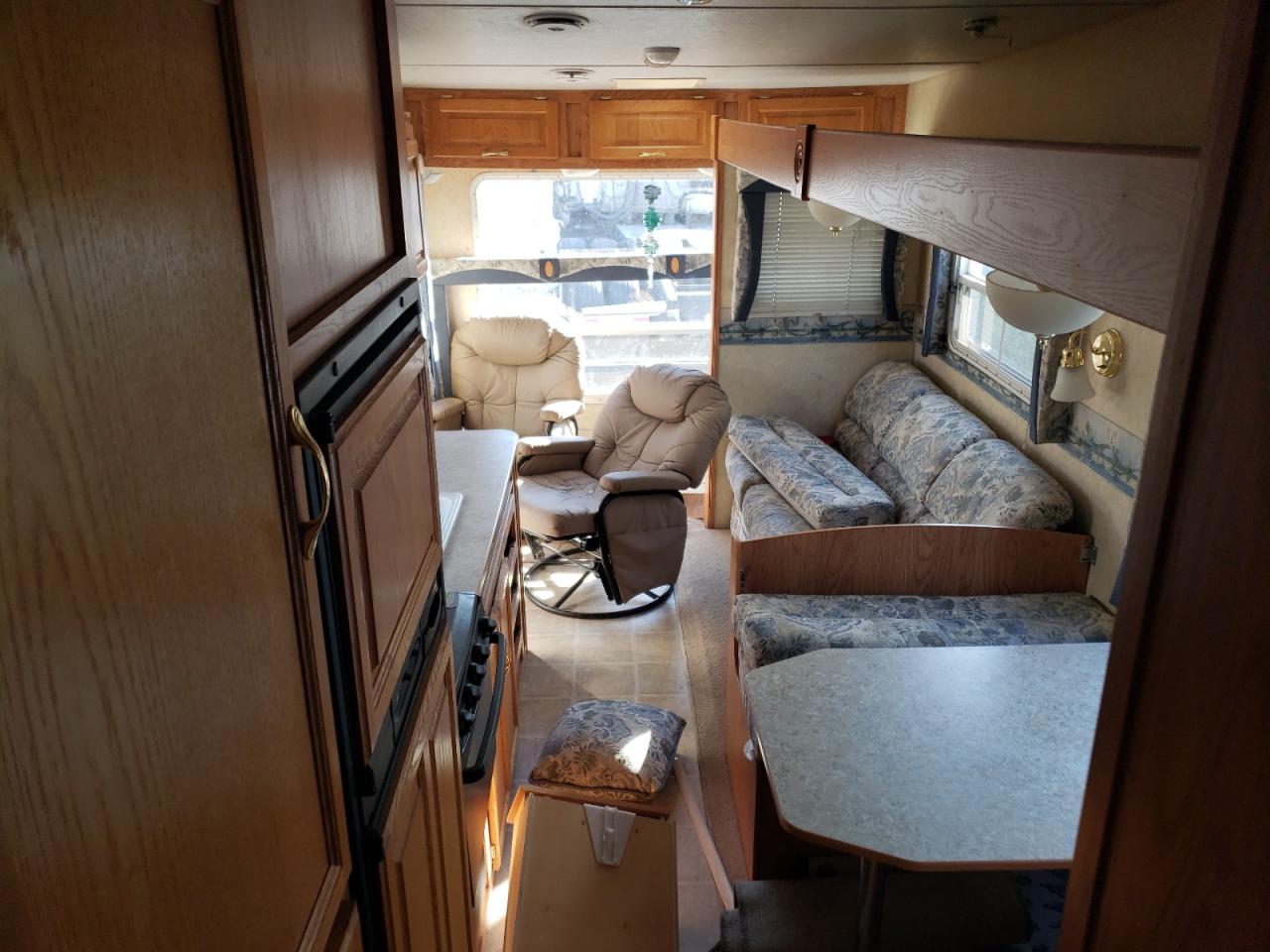 FairThe 2005 Jayco Jay Flight RV shows signs of water/flood damage. The exterior, primarily white, exhibits moderate damage affecting its overall condition. The interior also reflects the impact of water. The wheels appear to be functional. The lights and glasses seem intact. The vehicle's state indicates a need for repair, with drivability potentially affected.