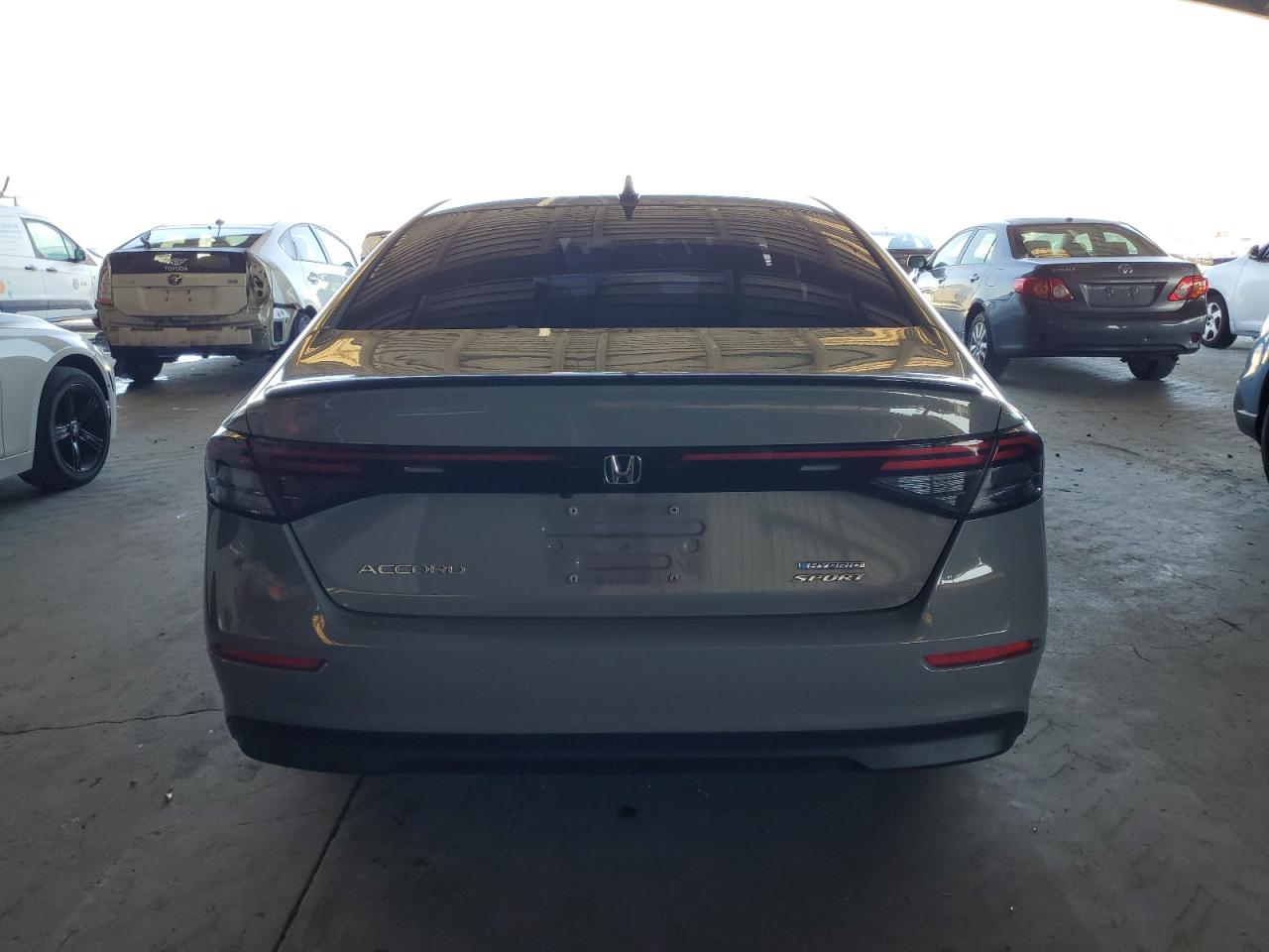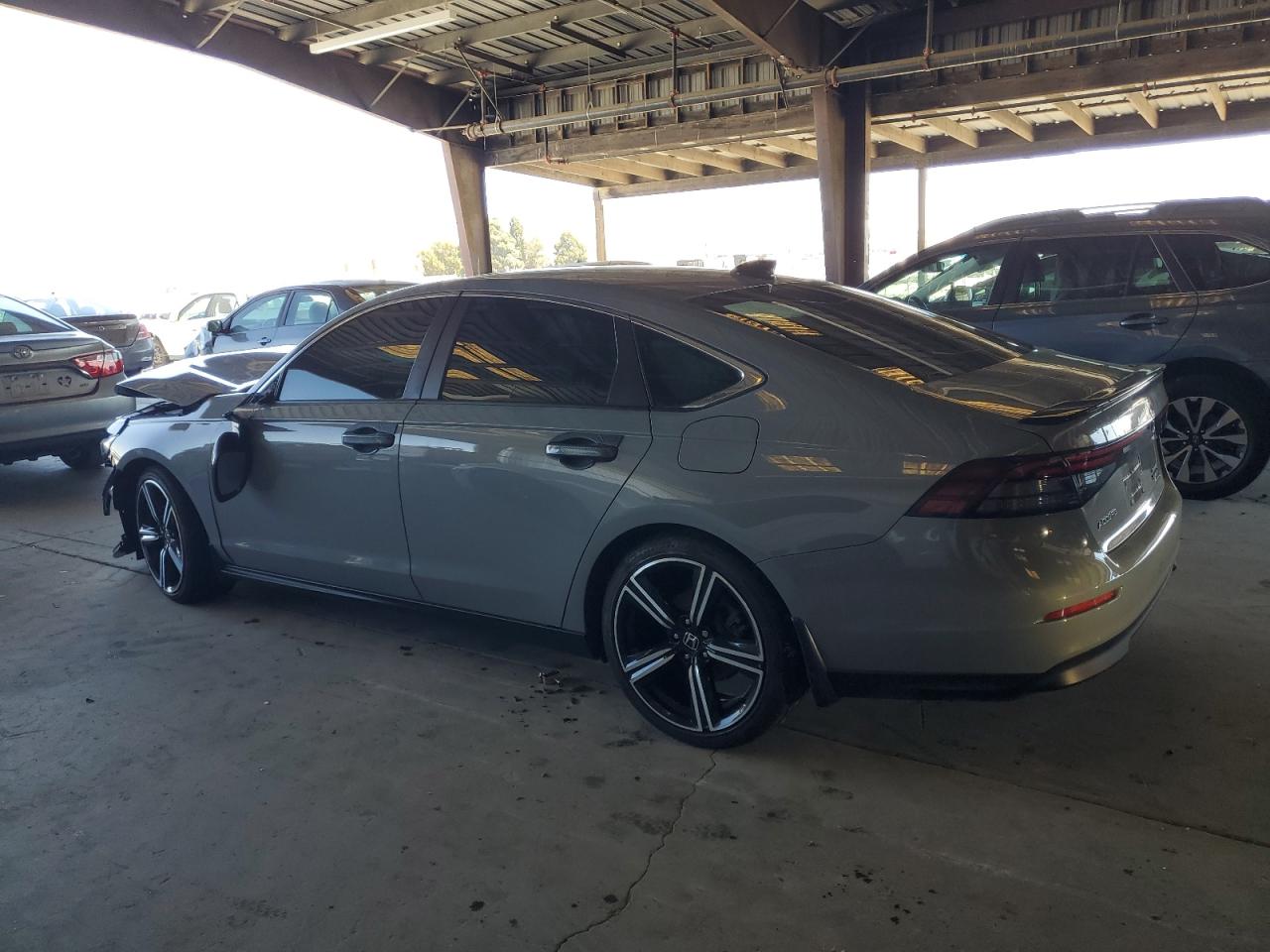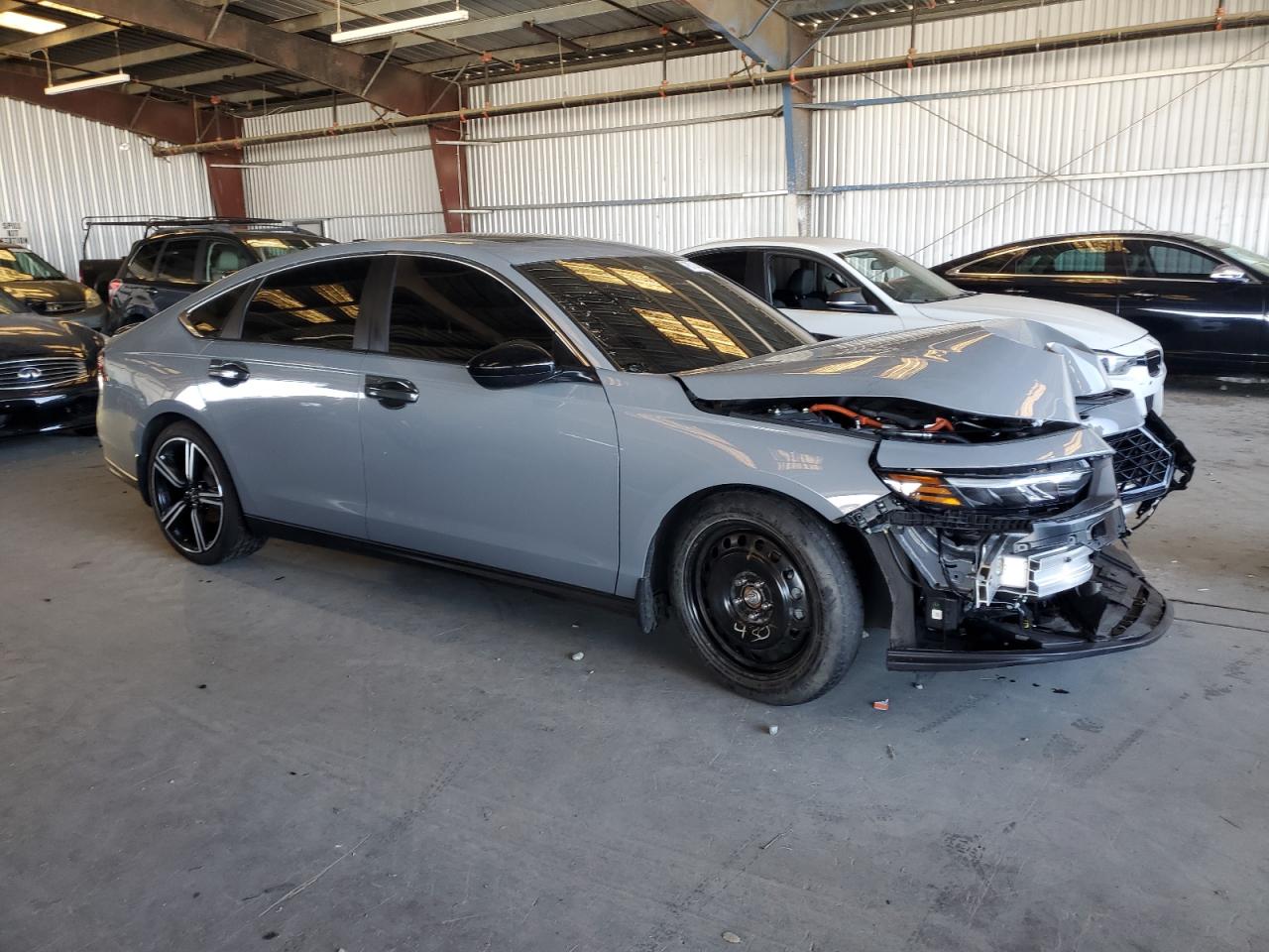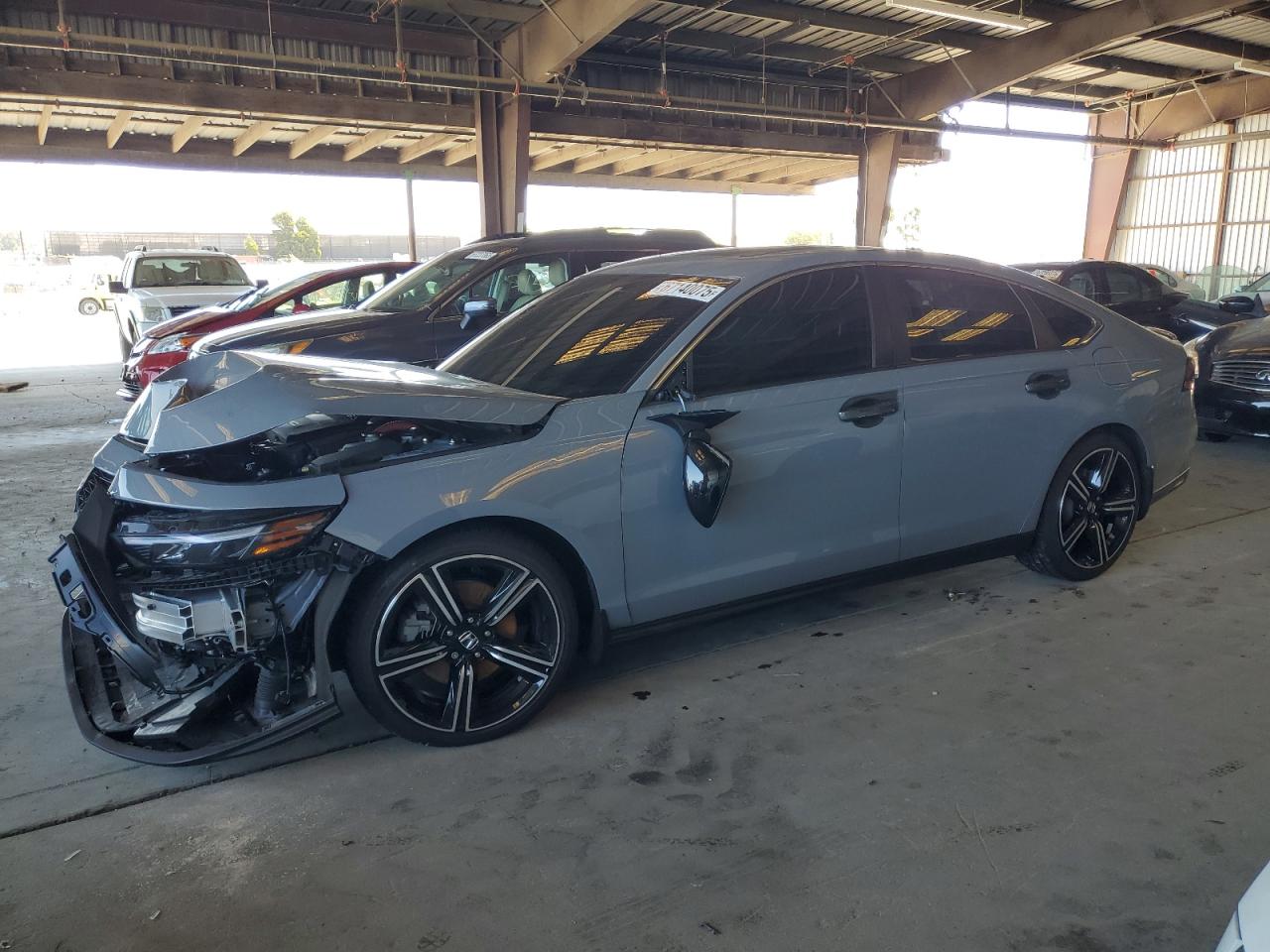 FairThis HONDA ACCORD HYBRID SPORT 2024, starting with DEFAULT code, is a grey car that has sustained significant front-end damage. The front of the vehicle shows extensive damage, with the bumper, lights, and front panels severely affected. The wheels appear to be intact. The interior shows deployed airbags and visible damage. The car will require considerable repairs.