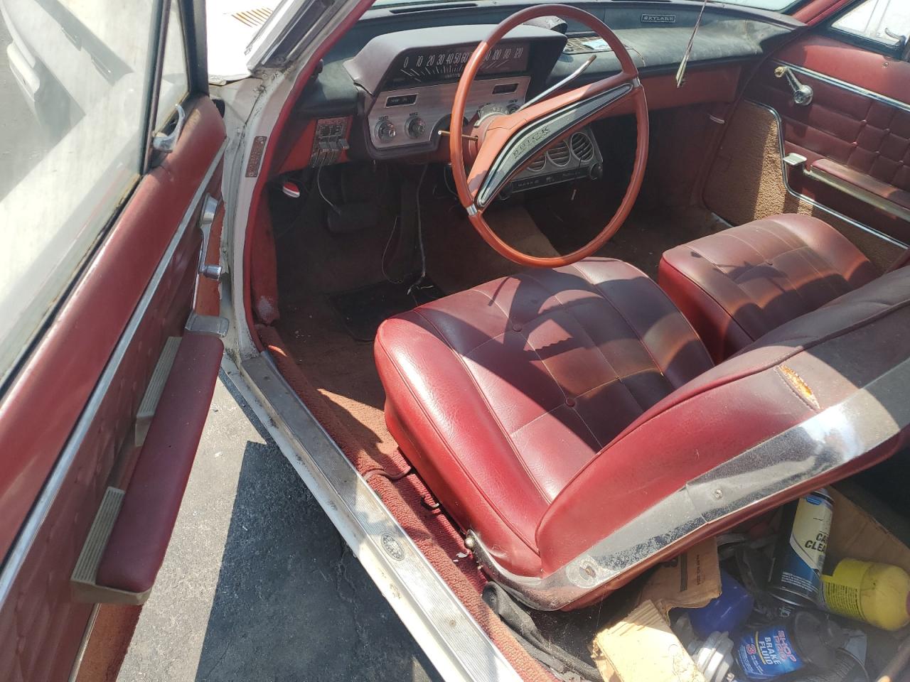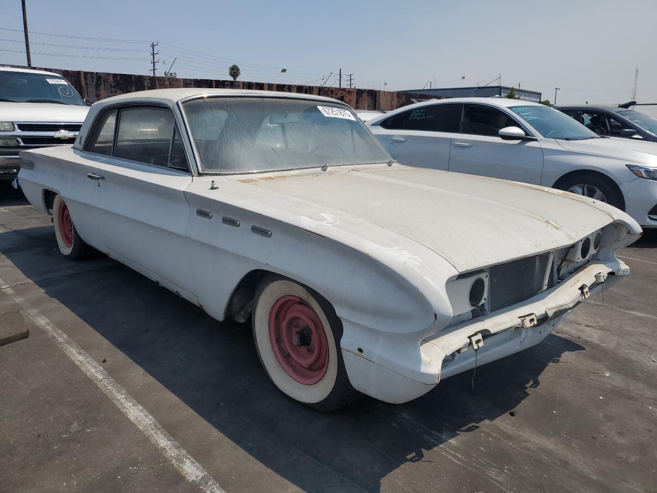 FairThe 1962 Buick Skylark exhibits significant wear and tear, suggesting it has spent considerable time exposed to the elements. The white paint is faded, and there's visible body damage. Interior condition reflects its age, with wear on the seats and surfaces. A classic car project for restoration enthusiasts.