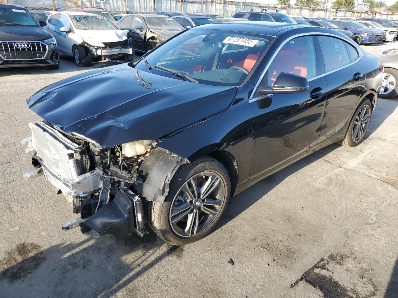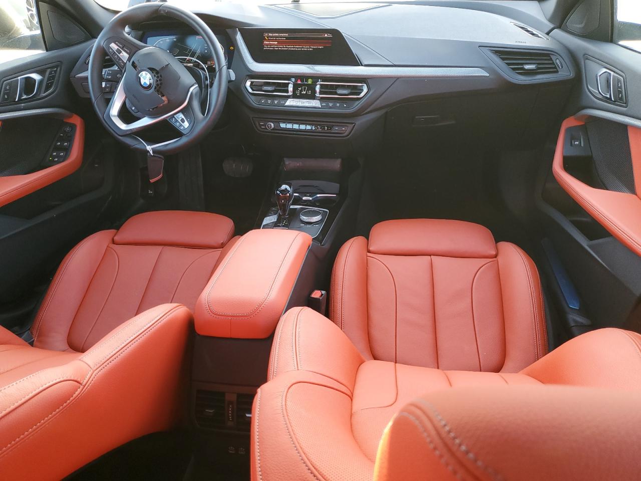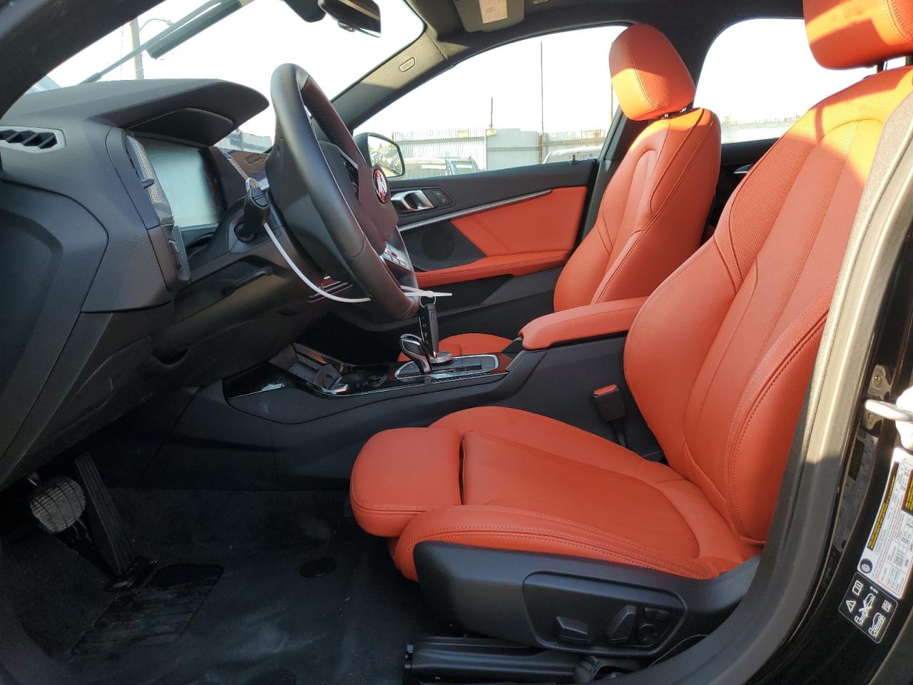Fair2024 BMW 228XI. The car has suffered front-end damage, including the bumper, hood, and potential structural components. The car is black, featuring a Run & Drive Verified start code, indicating it is drivable. The interior appears to be in relatively good condition with orange leather seats. The wheels and glasses seem intact, with no obvious damage.