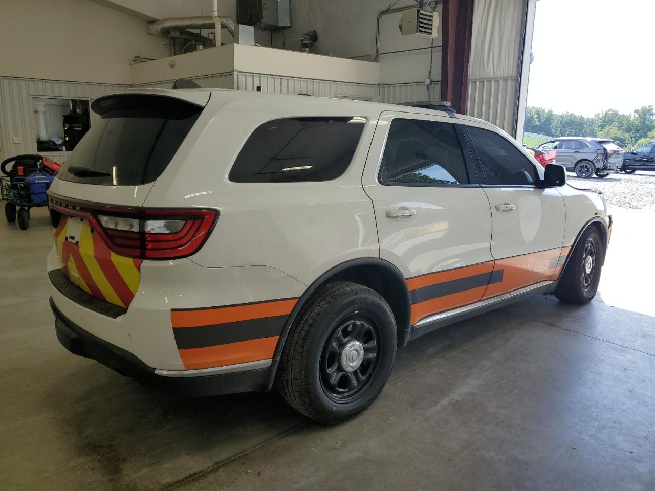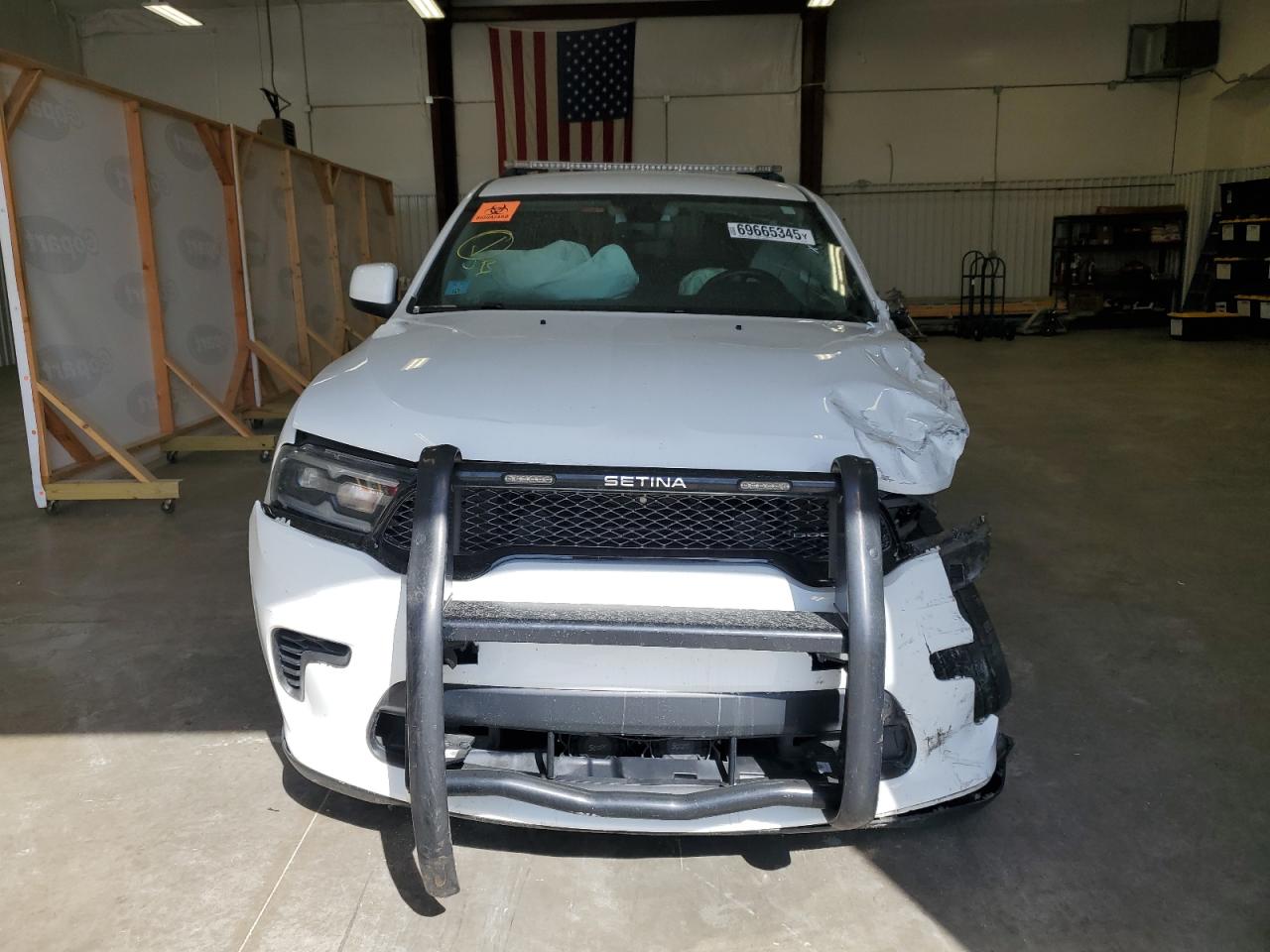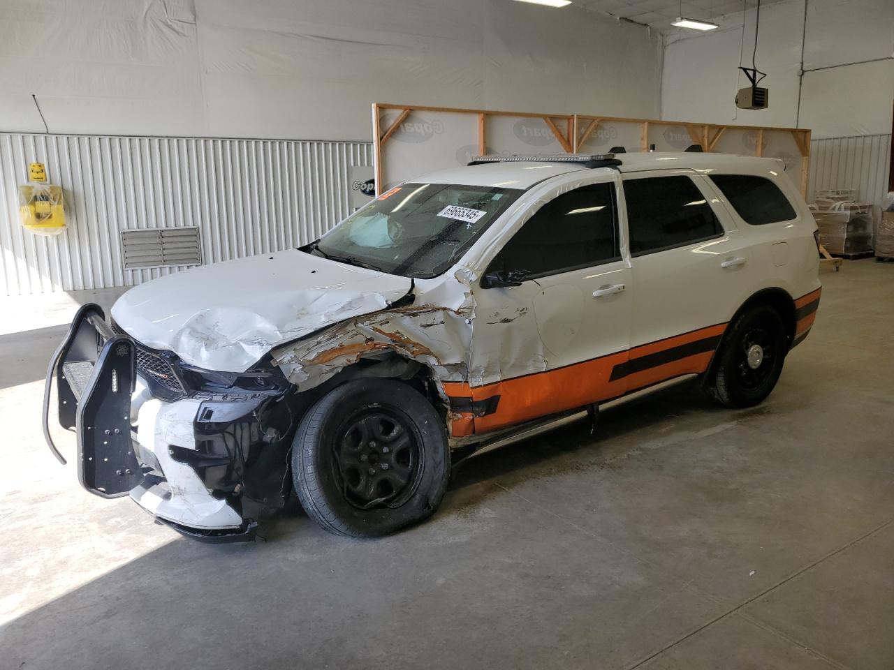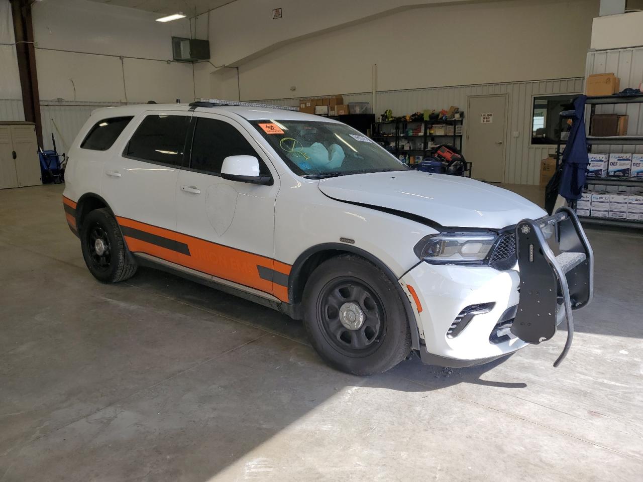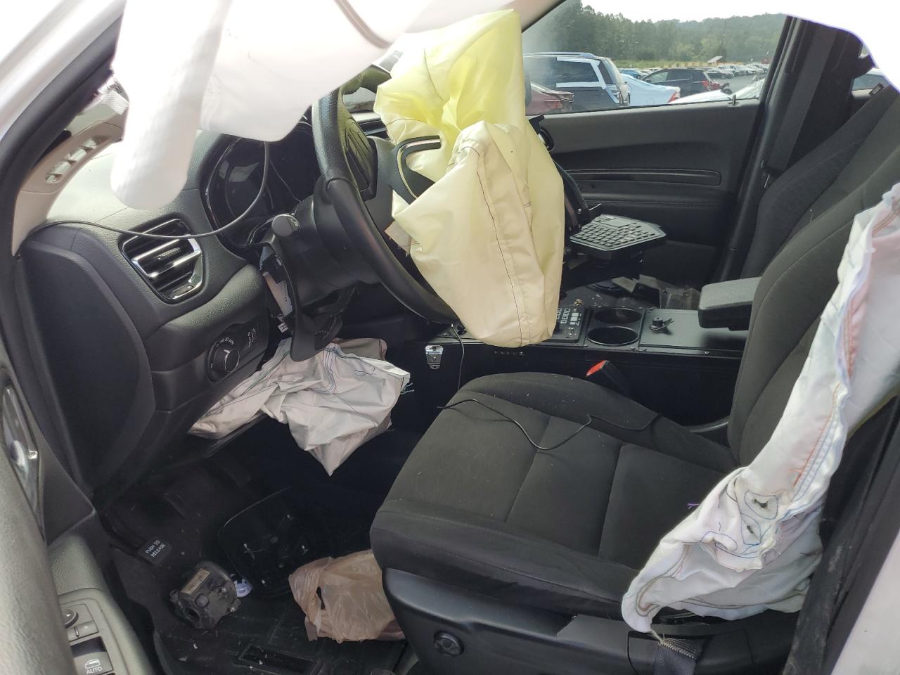 FairThe white 2021 DODGE DURANGO PU has sustained significant damage. The primary damage is widespread, affecting the entire body of the vehicle, with no identified secondary damage. The exterior presents substantial damage, impacting the body panels, while the interior shows signs of airbag deployment and other related impacts.
