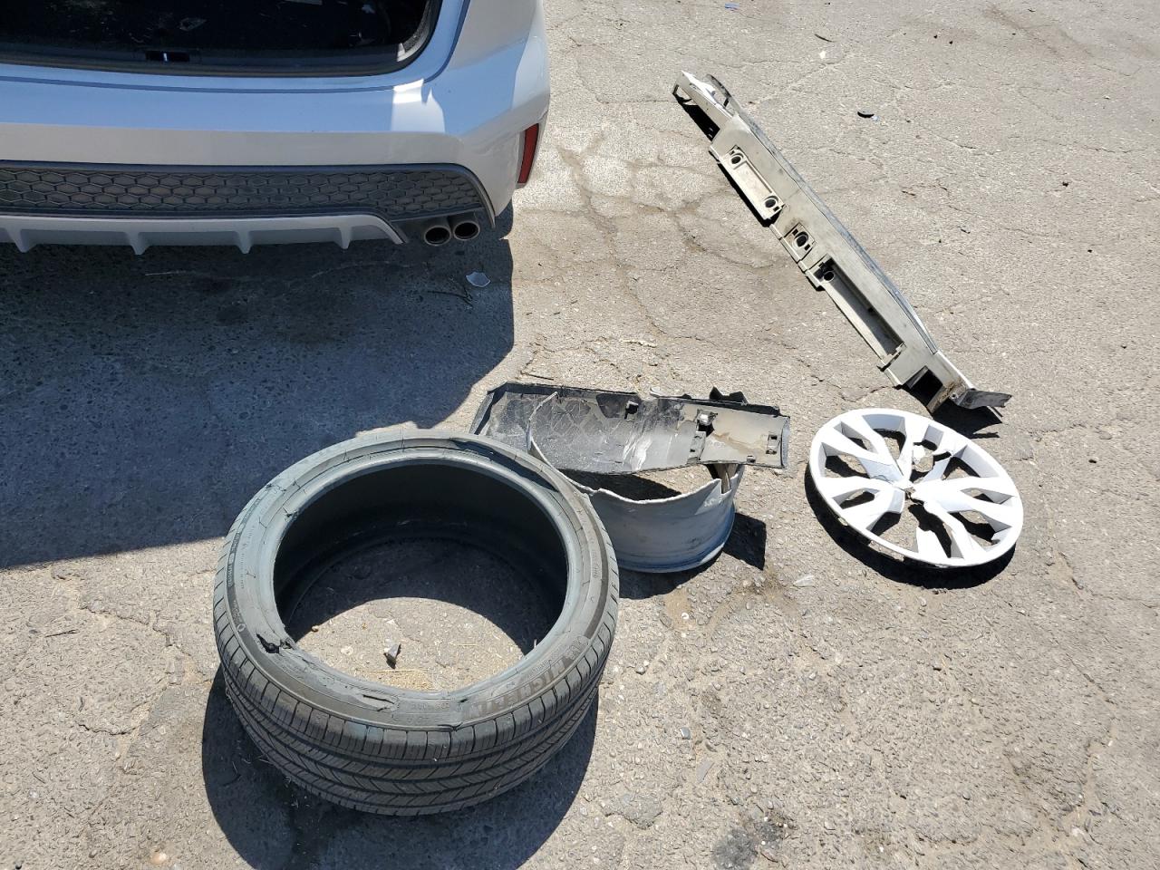 The front end of the car is severely damaged, with significant impact. Damage extends to the front wheel area. The side of the vehicle also exhibits notable damage. Interior shows airbag deployment. Overall, the vehicle requires considerable repair and is likely not drivable in its current state.