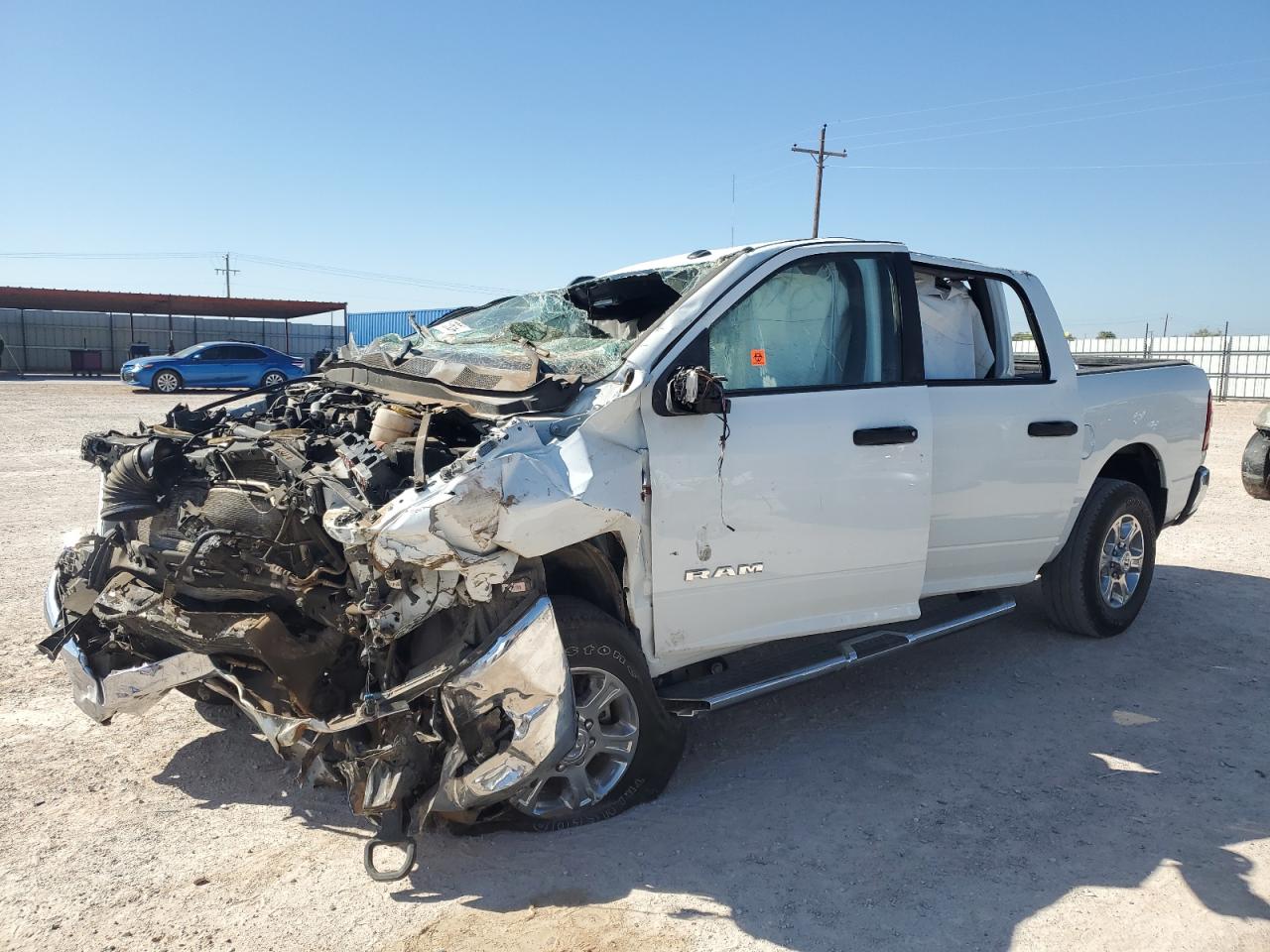 PoorThe white 2024 RAM 2500 BIG H has sustained severe damage across its exterior and interior. The primary damage is extensive, affecting nearly all body panels and structural components. The front of the vehicle is severely compromised, with significant deformation of the hood, fenders, and front-end components. The roof and windshield are also extensively damaged, indicating a likely rollover or impact. The interior shows signs of airbag deployment, with deployed airbags visible. Overall, the vehicle requires considerable repair and is unlikely to be drivable in its current state.