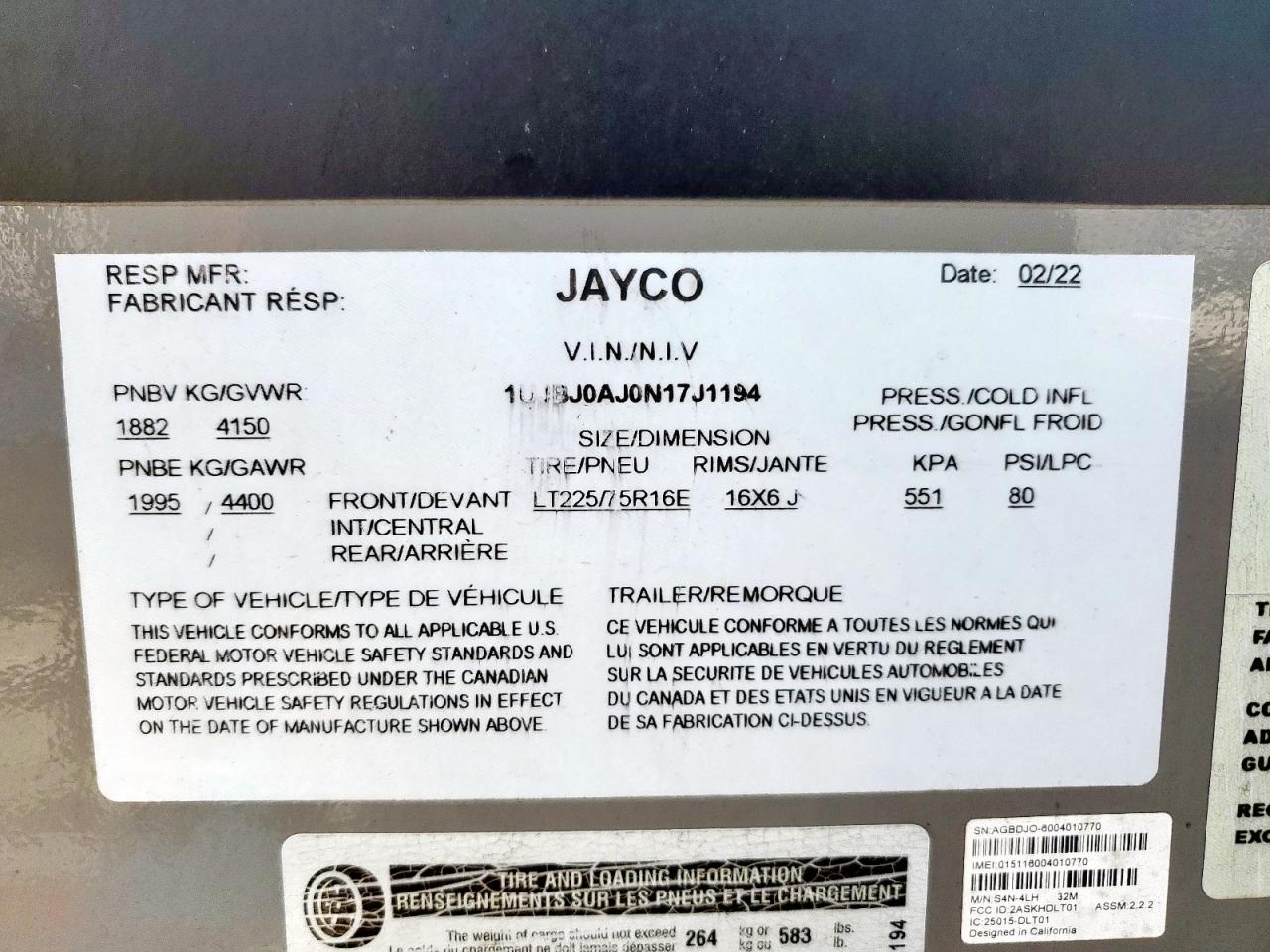 GoodThe images showcase a 2022 JAYCO STX RV in white. The primary damage is minor dents and scratches, with no secondary damage observed. The vehicle is in overall good condition, suitable for various uses. The interior appears to be well-maintained, with minimal wear and tear. The exterior shows minor damage, but the RV is drivable. The wheels, lights, and glass appear to be in good condition. The vehicle's damage category is body, indicating damage to the body panels only. No specific mechanical or airbag issues are noted.