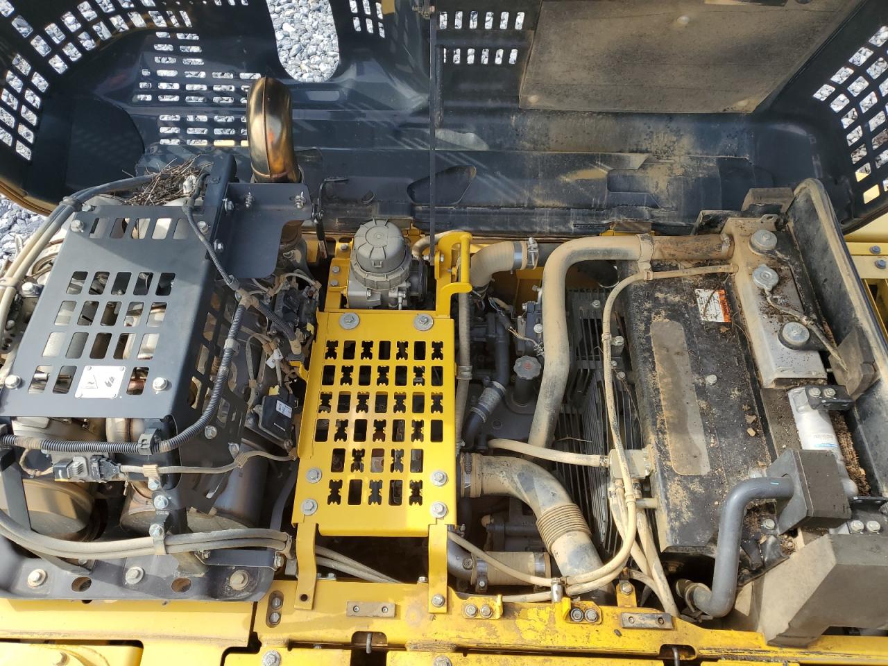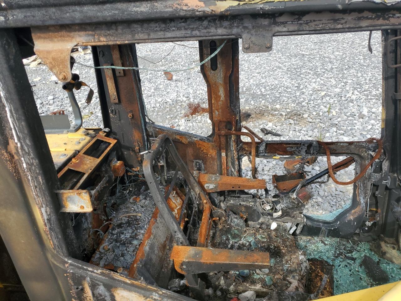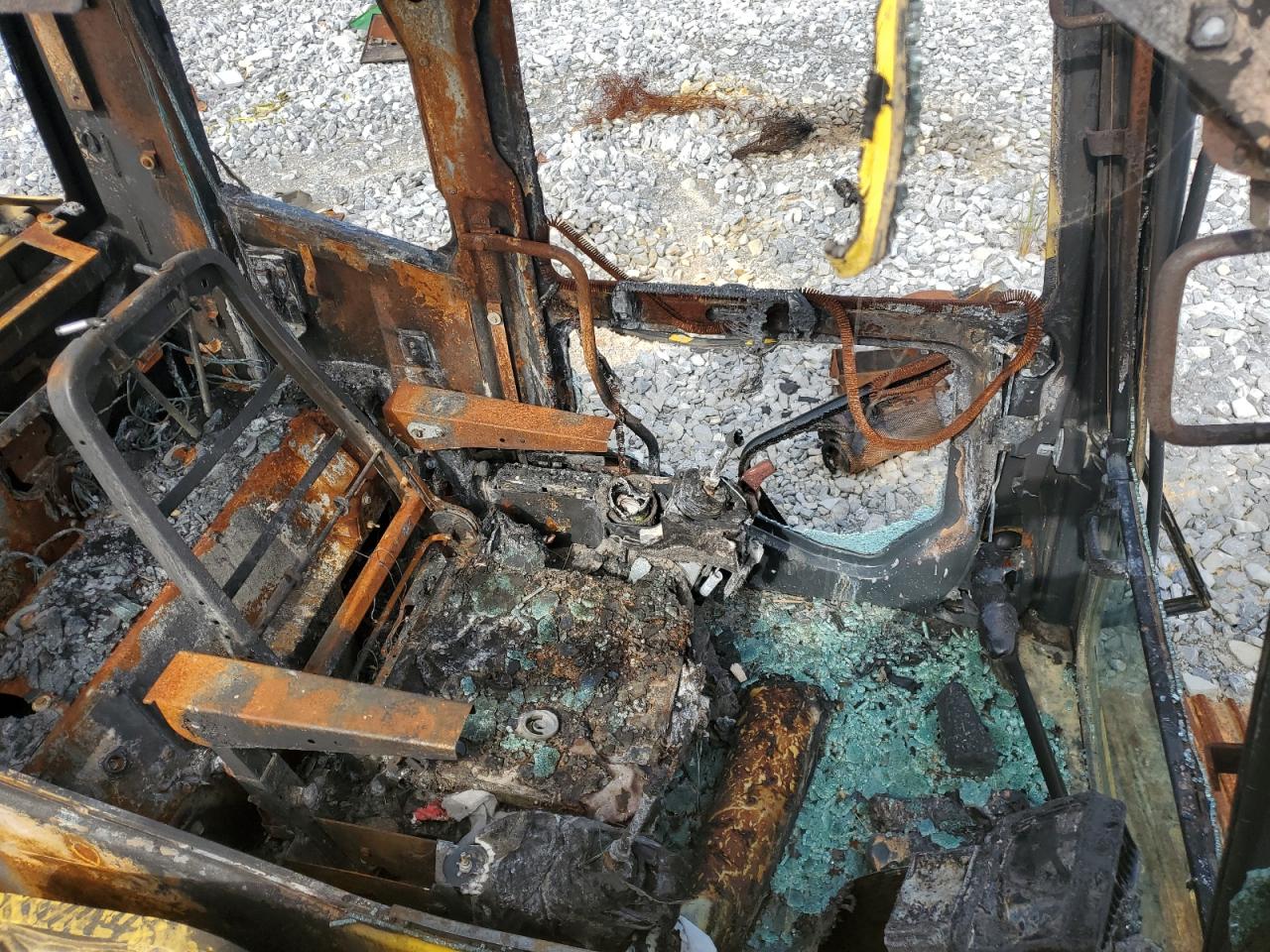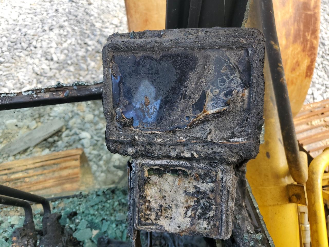 Significant fire damage throughout the interior of the excavator. Exterior shows some wear and tear.