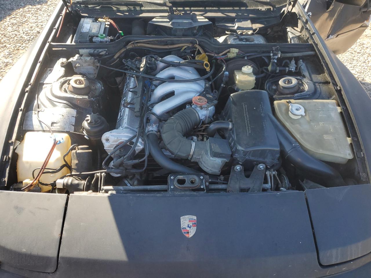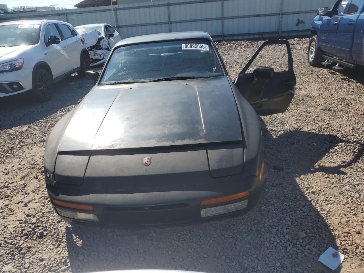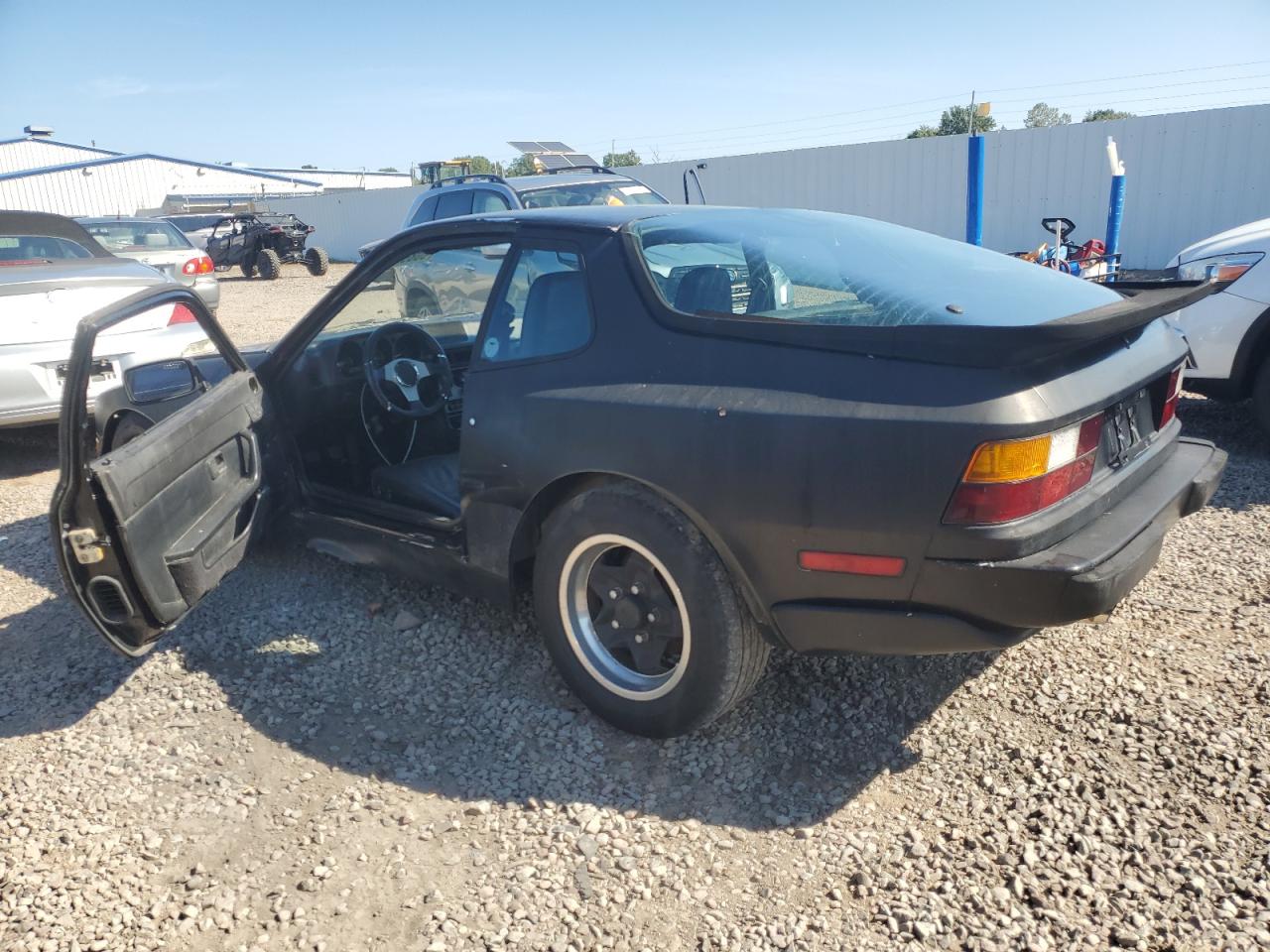 Fair1984 Porsche 944 in black. The vehicle exhibits moderate damage, primarily on the side, but no damage is visible on the other parts of the car. The interior appears to be in decent condition, with some signs of wear and tear. The car's wheels and lights appear to be in good condition. Glasses have no damage. This classic Porsche 944 needs repair, but it is potentially drivable.
