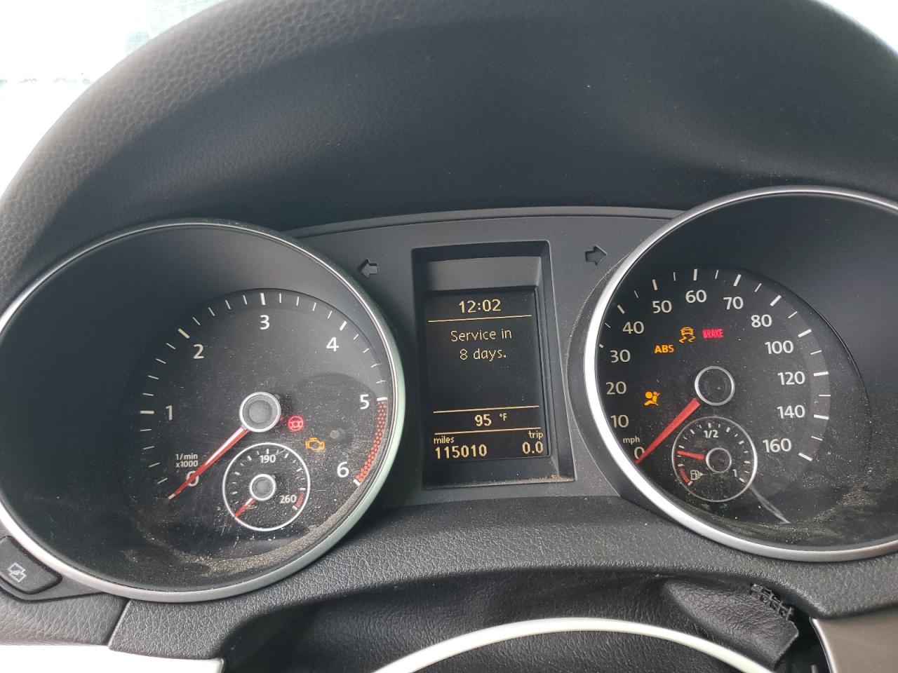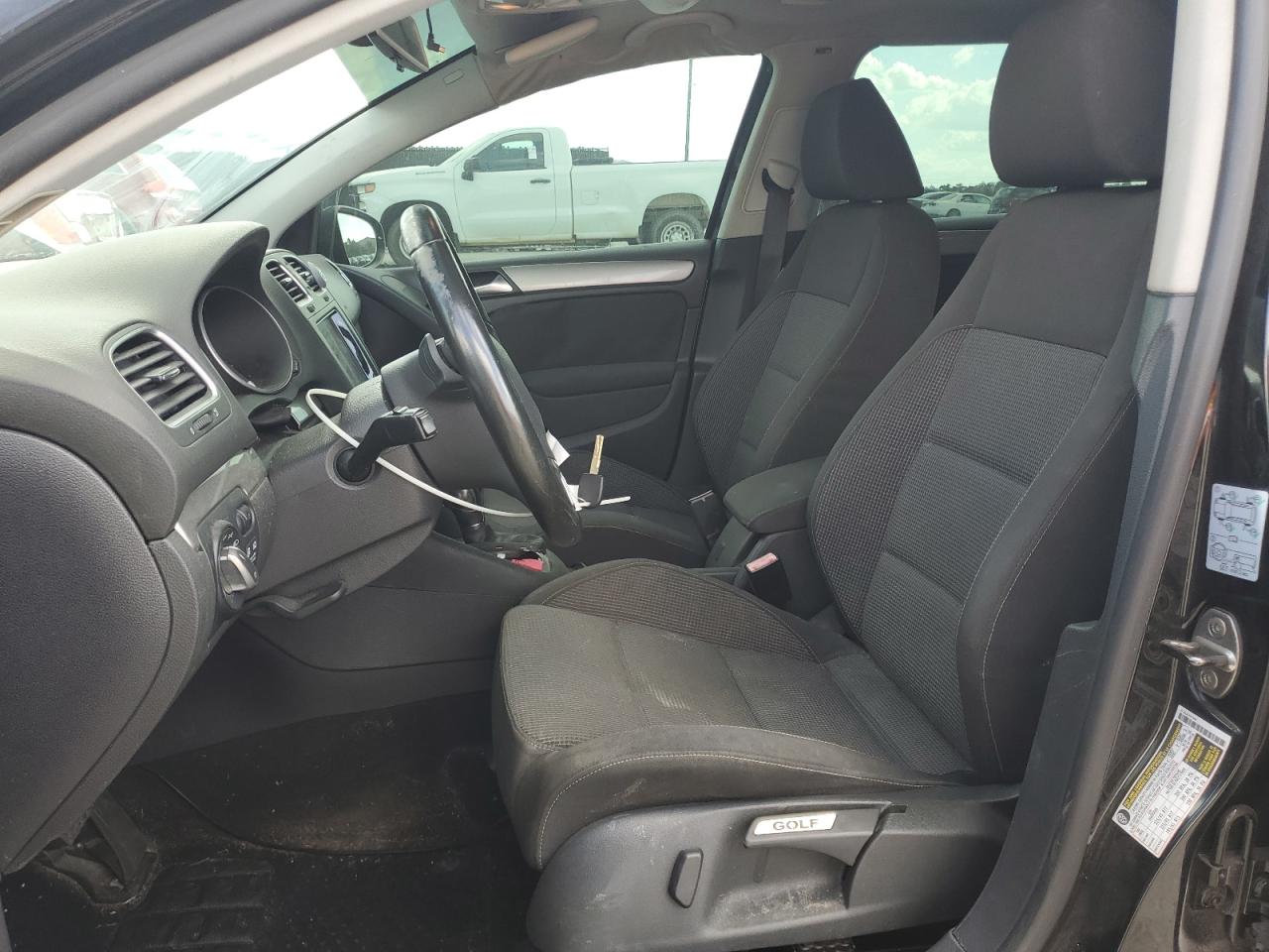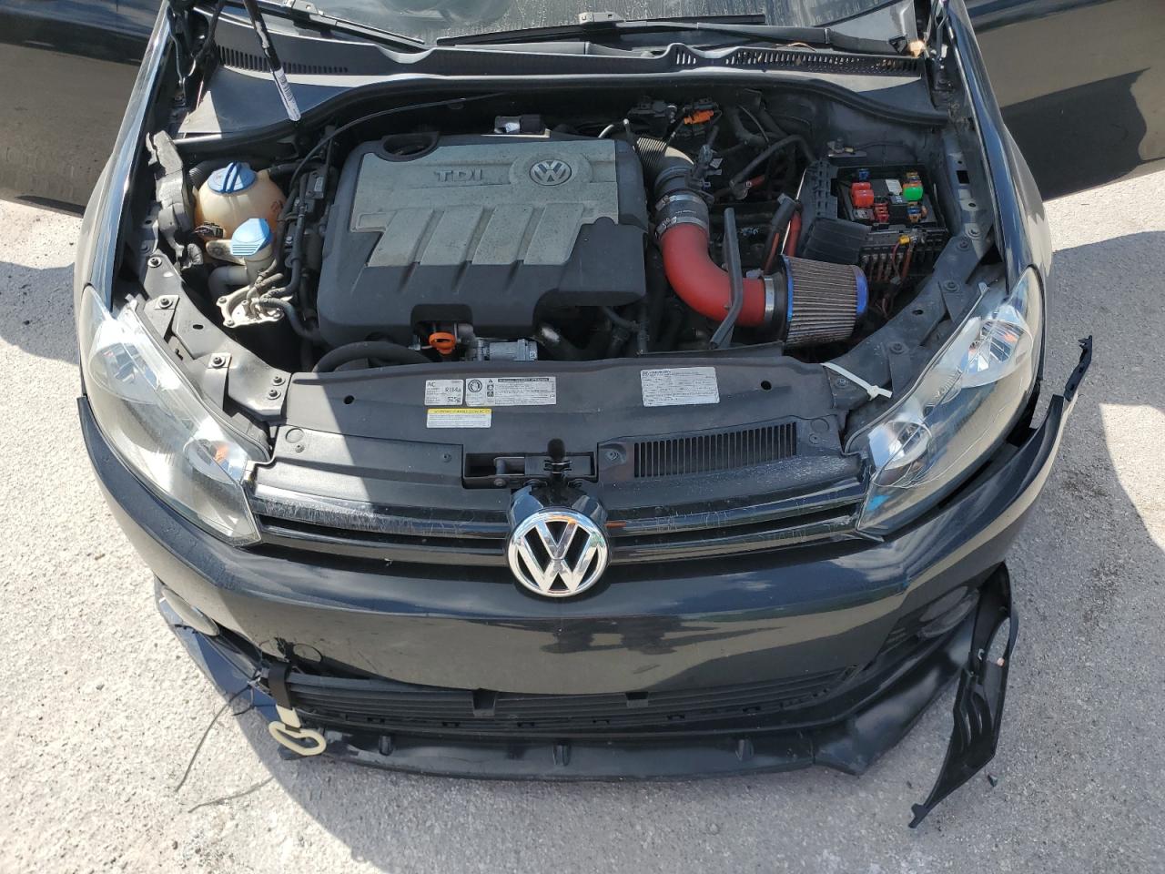FairThe 2012 Volkswagen Golf is a black hatchback. The vehicle's front end shows significant damage, likely from a collision, including body panel damage. There are minor dents and scratches across the exterior. The interior appears to be in relatively good condition, with normal wear and tear.