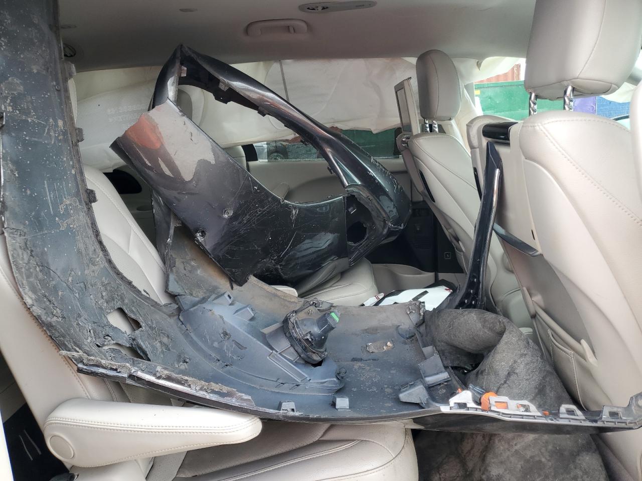 The vehicle exhibits major front-end damage, body panel damage, and interior component damage including deployed airbags. Mechanical components are likely affected as a result of the collision