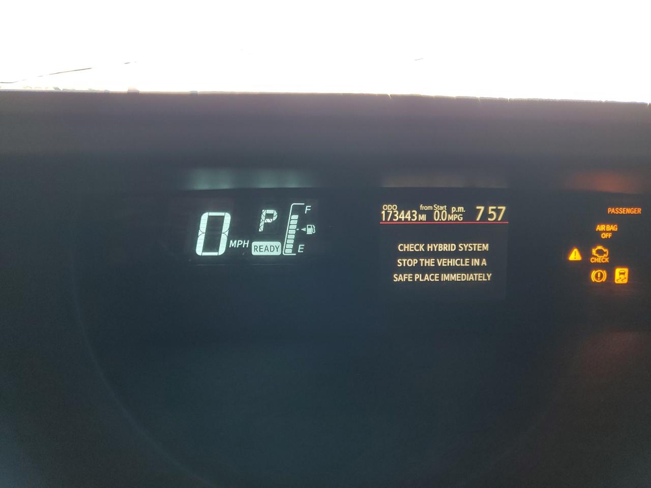 The car exhibits body damage. The interior shows signs of wear. The airbags are functional, but the dashboard displays a check engine system warning and recommends parking the vehicle in a safe place immediately.