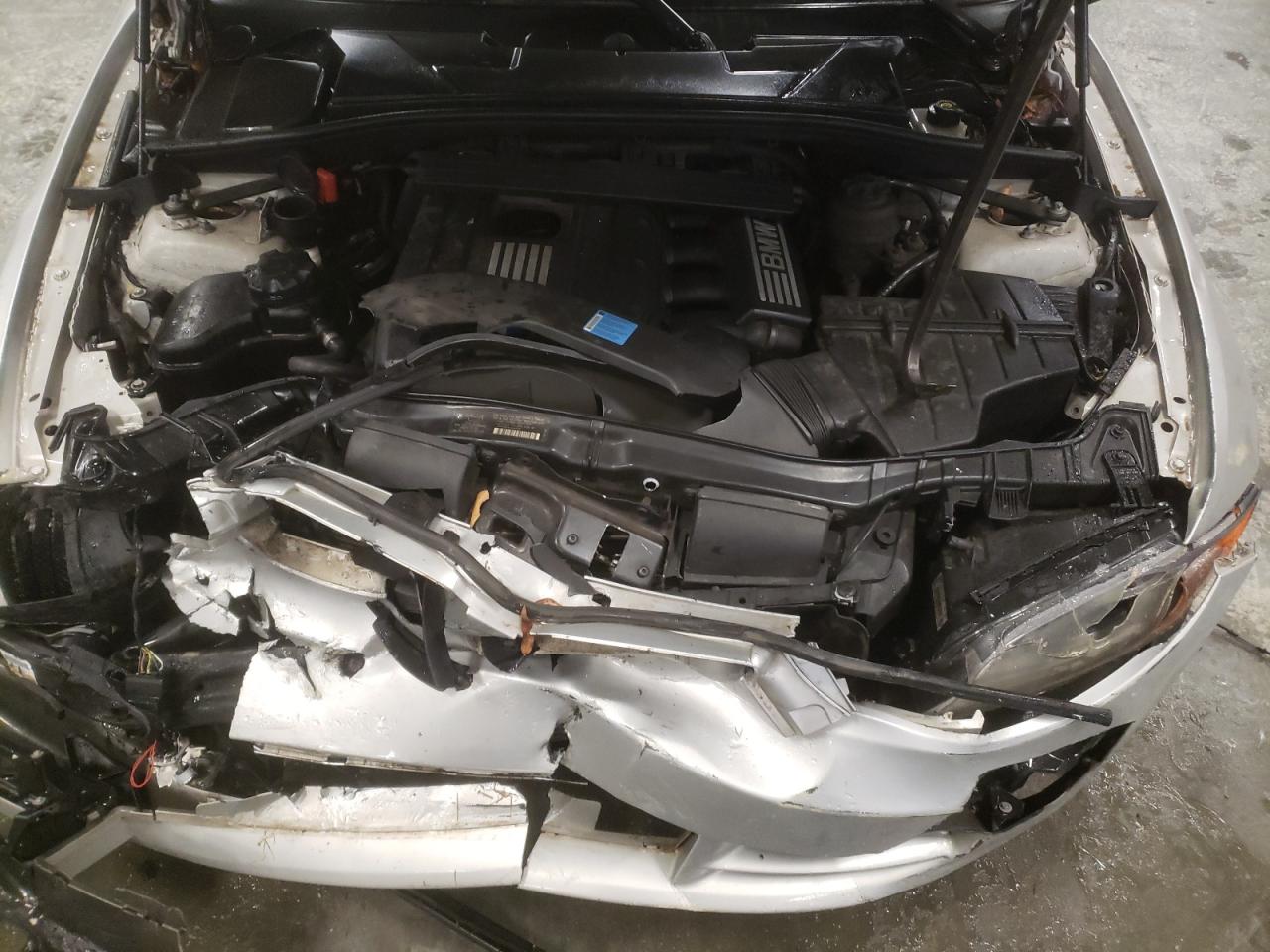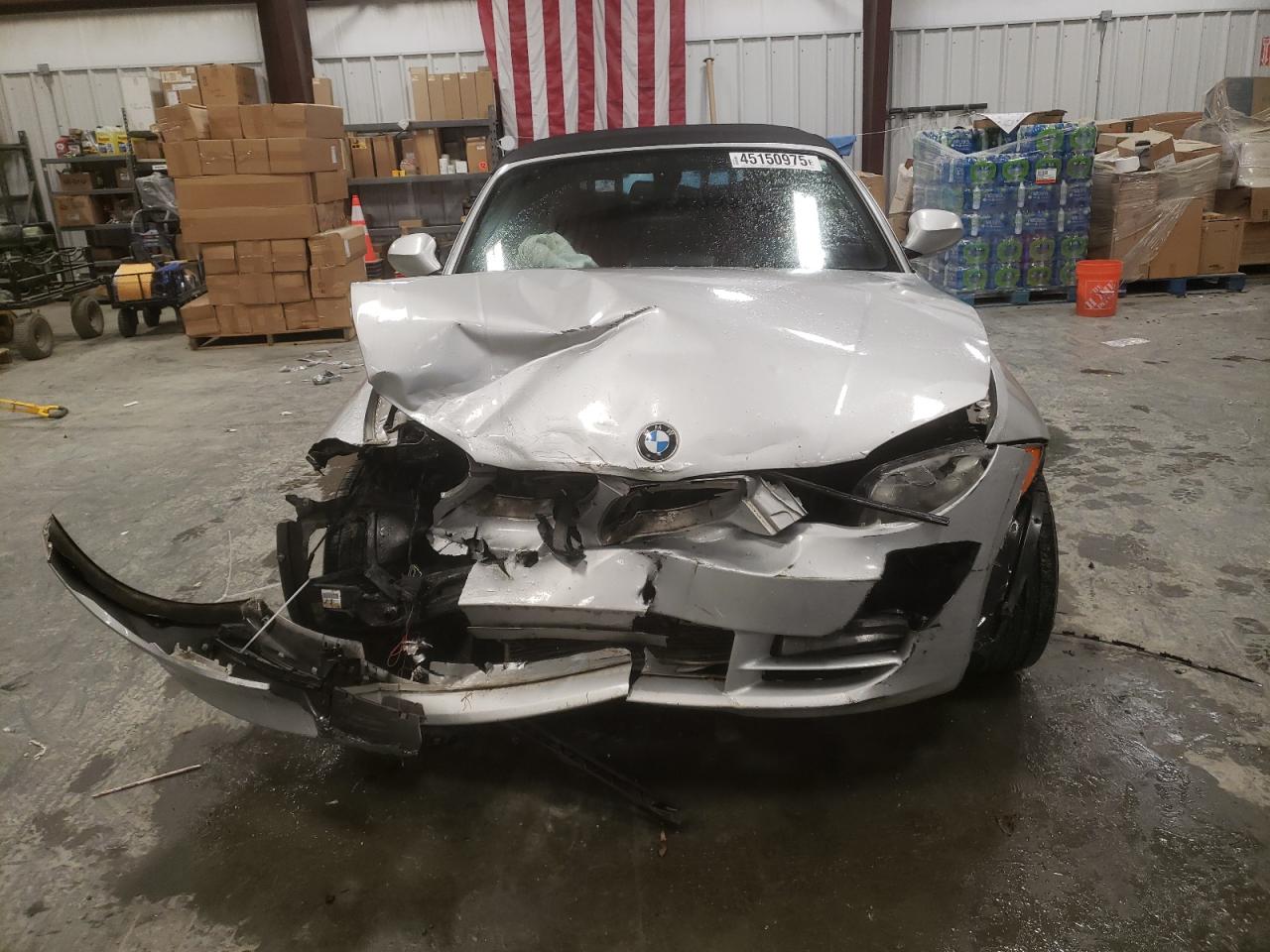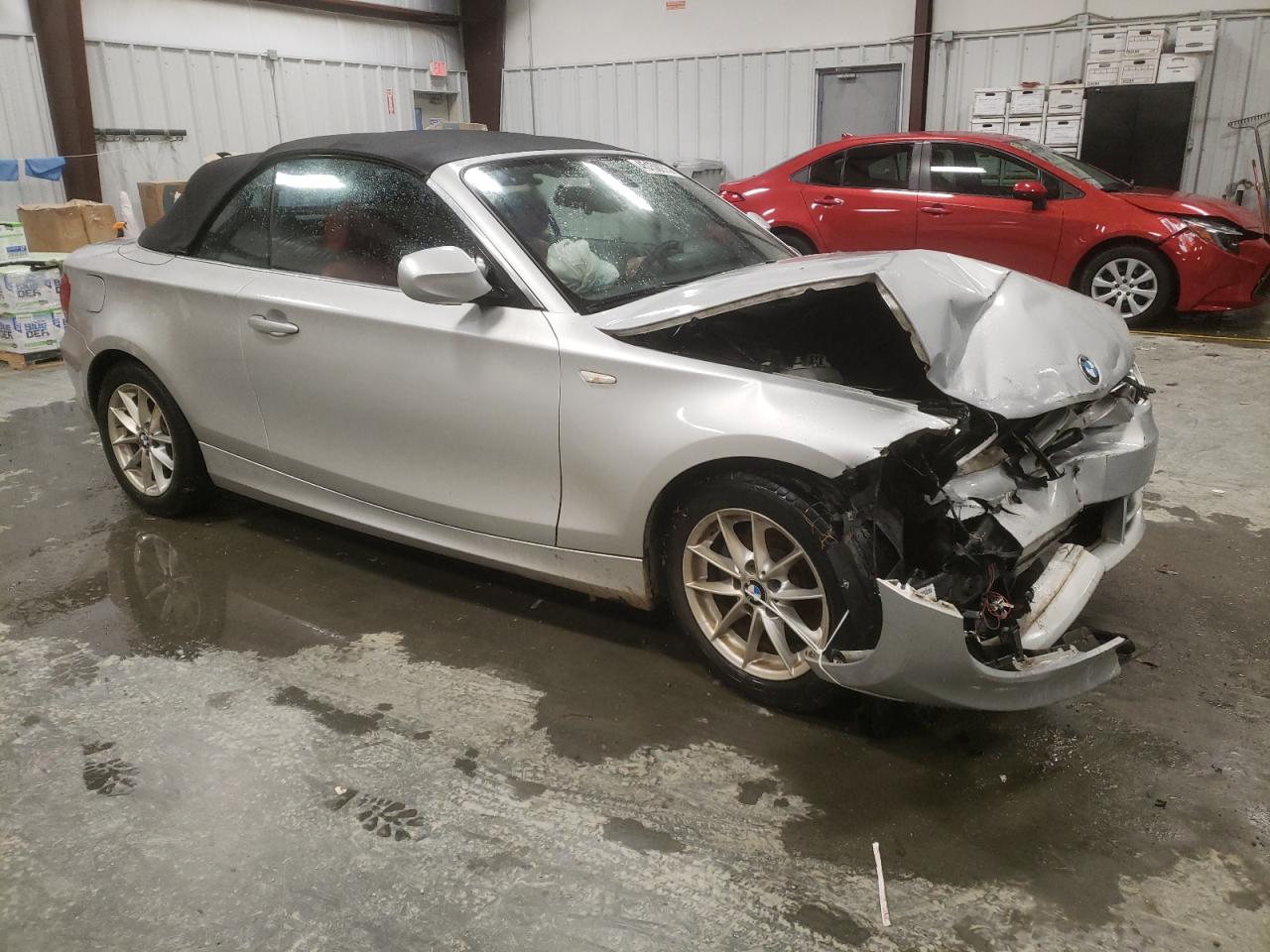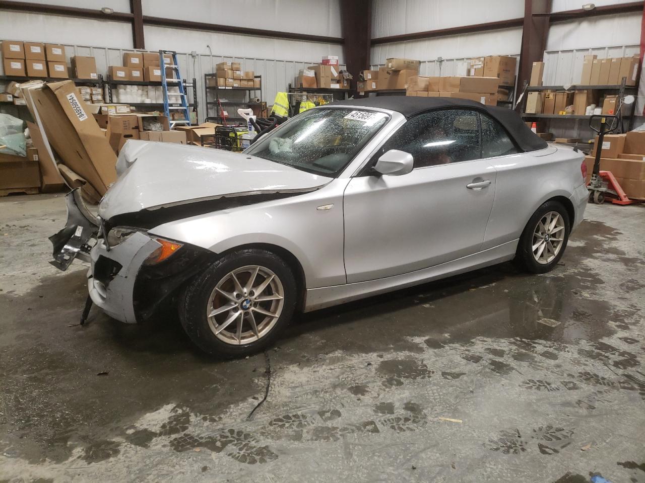 PoorThe silver 2011 BMW 128i convertible has sustained significant damage. The front end is heavily damaged, with the front bumper, hood, and fenders showing major impact. The airbags have deployed. The interior also exhibits substantial damage, with deployed airbags and visible damage. The vehicle is likely not drivable in its current state. The wheels appear to be intact, and the lights and glasses are likely damaged. The car's engine is damaged.