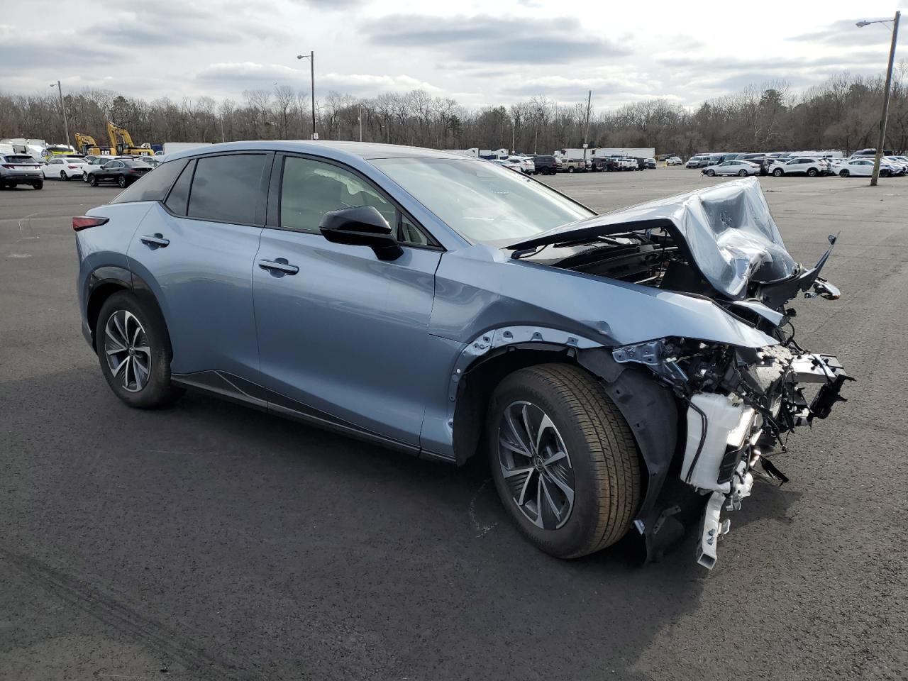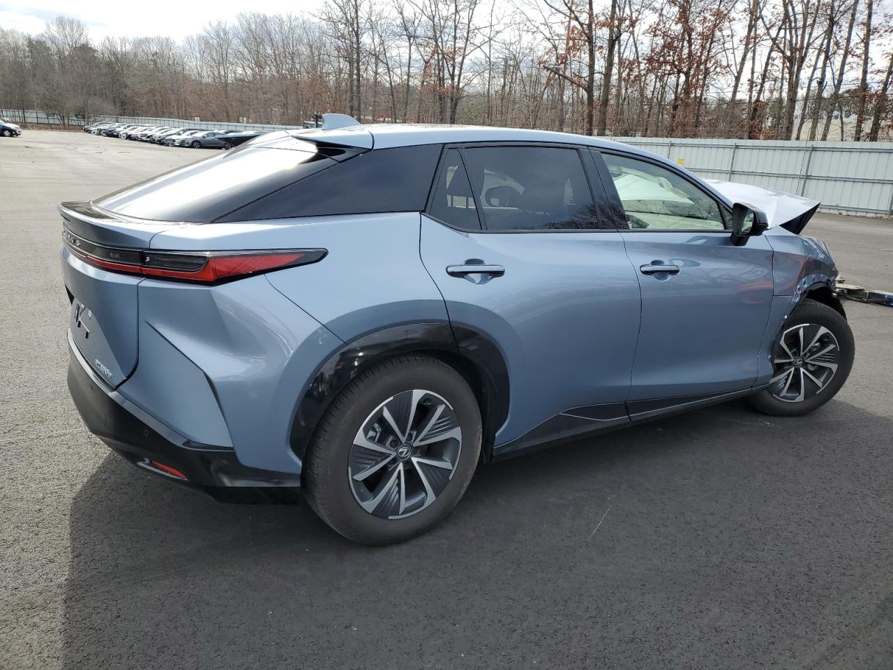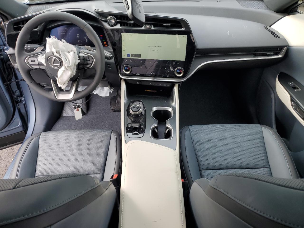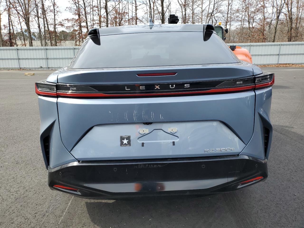 The LEXUS RZ 300E 2024 has significant front-end collision damage. This includes extensive damage to the front bumper, hood, and fenders. The airbags have deployed. There are dents and scratches on the body. The wheels have damage and tires are deflated. The interior shows damage.