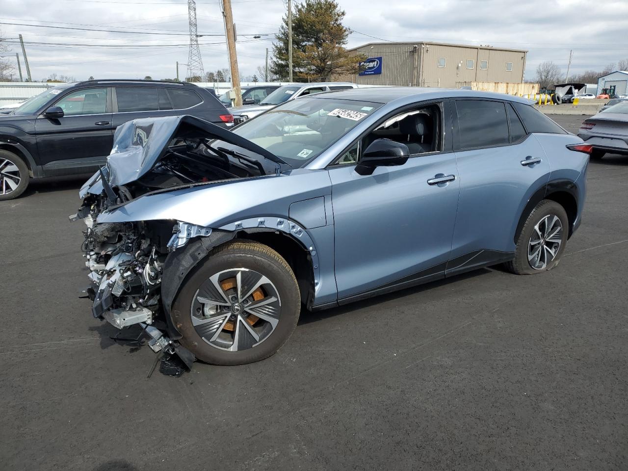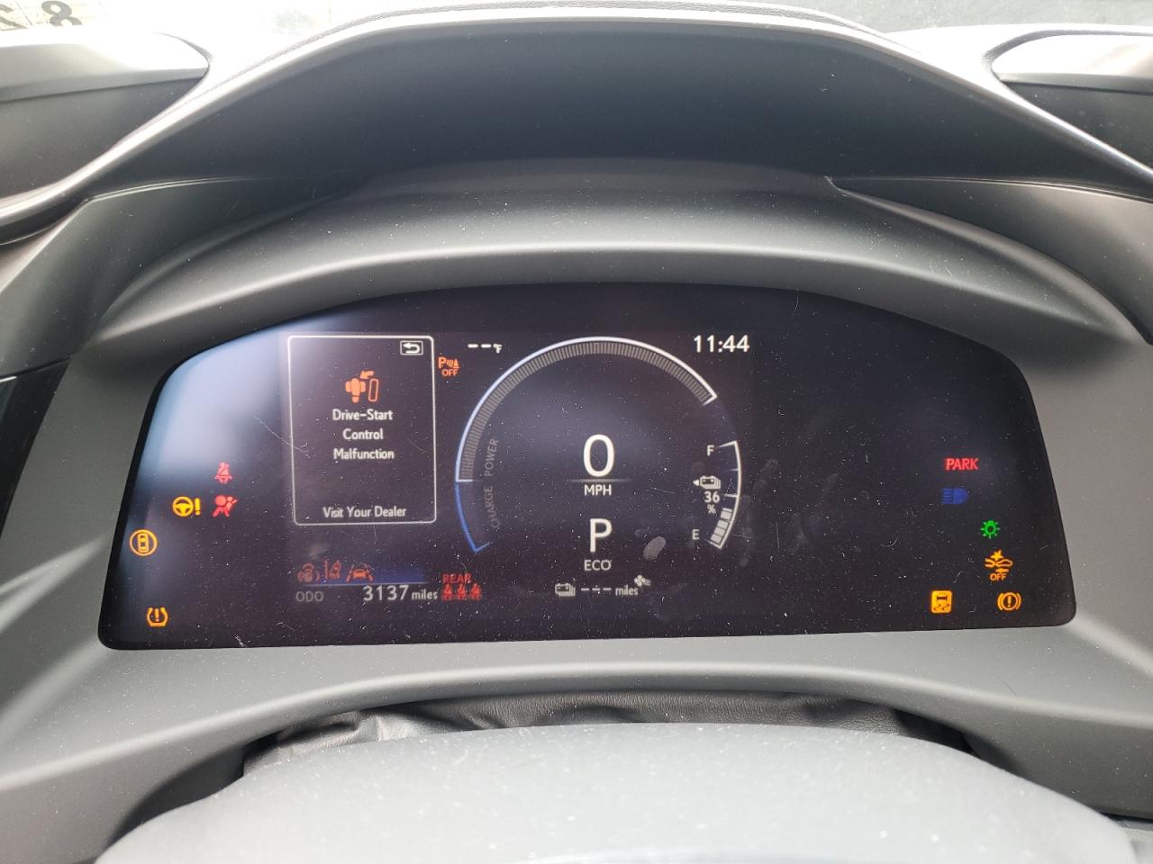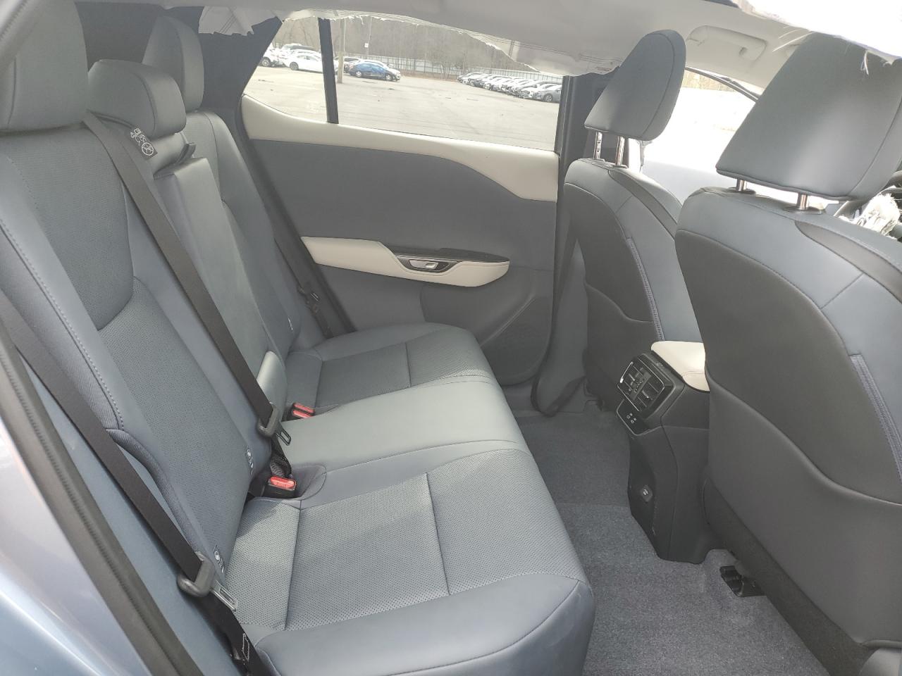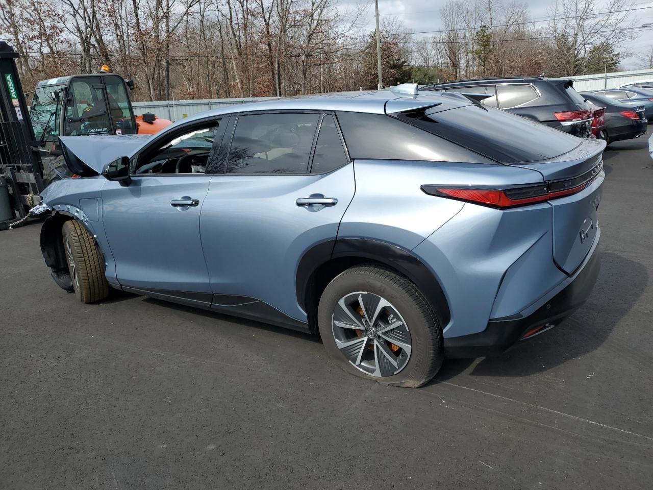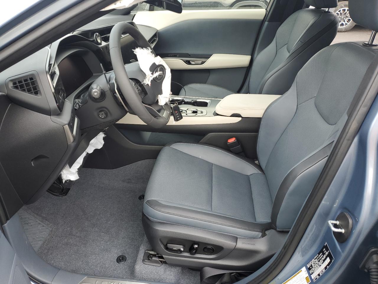The LEXUS RZ 300E 2024 has significant front-end collision damage. This includes extensive damage to the front bumper, hood, and fenders. The airbags have deployed. There are dents and scratches on the body. The wheels have damage and tires are deflated. The interior shows damage.