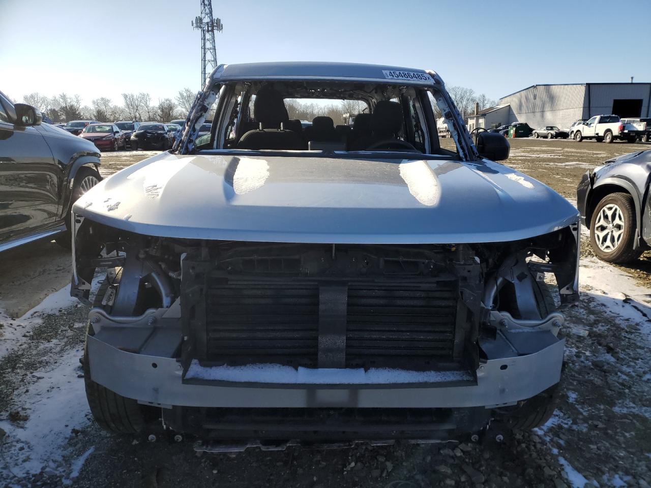 The vehicle exhibits significant damage, with the front end severely damaged. The body panels show considerable damage and the roof is missing. The interior also shows damage.
