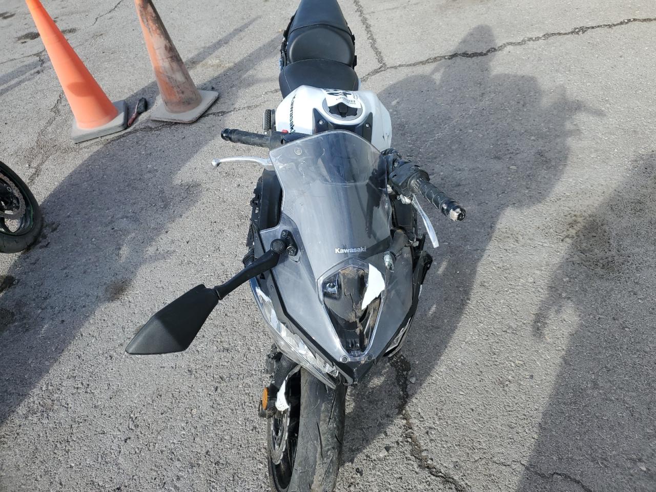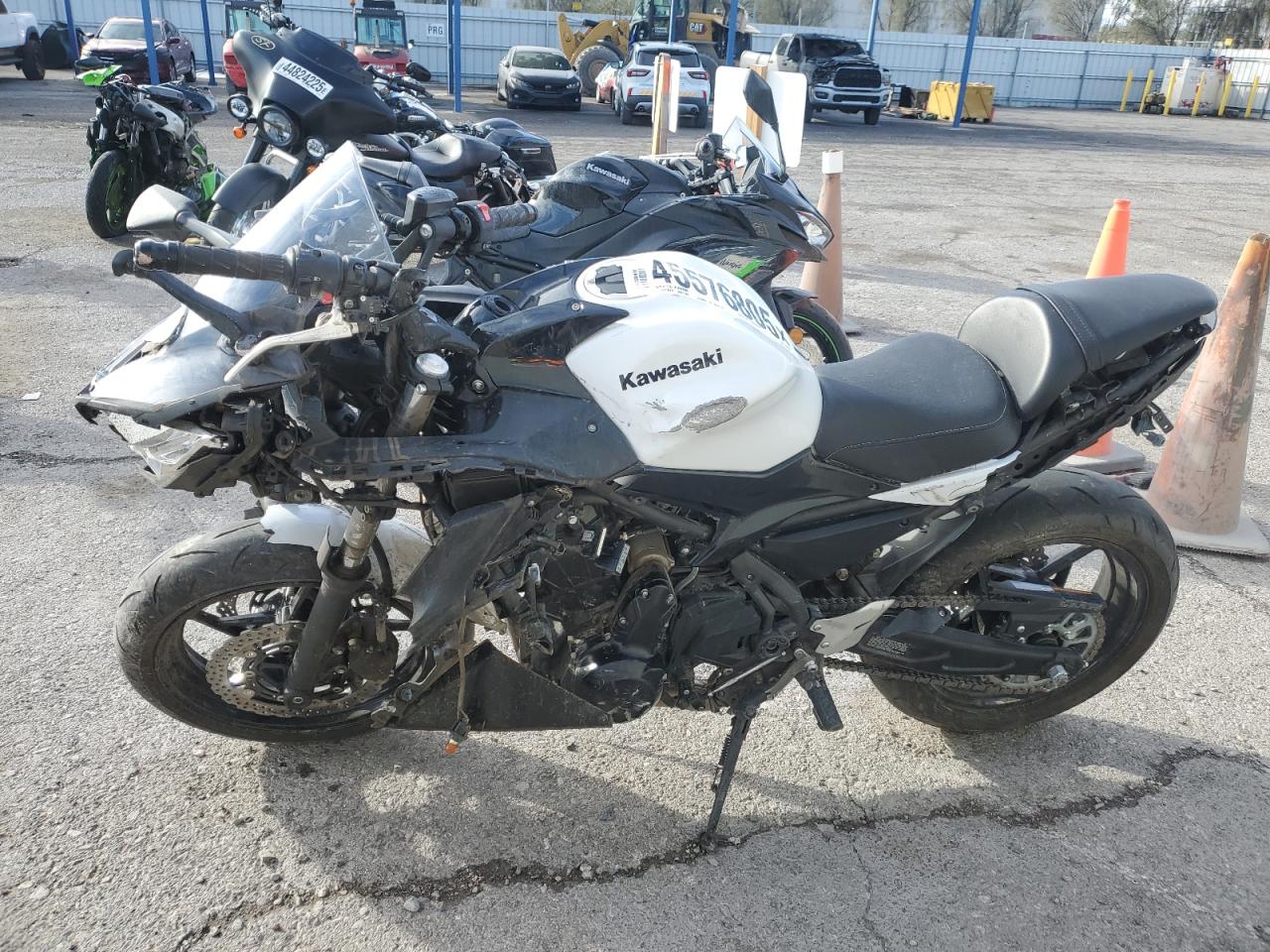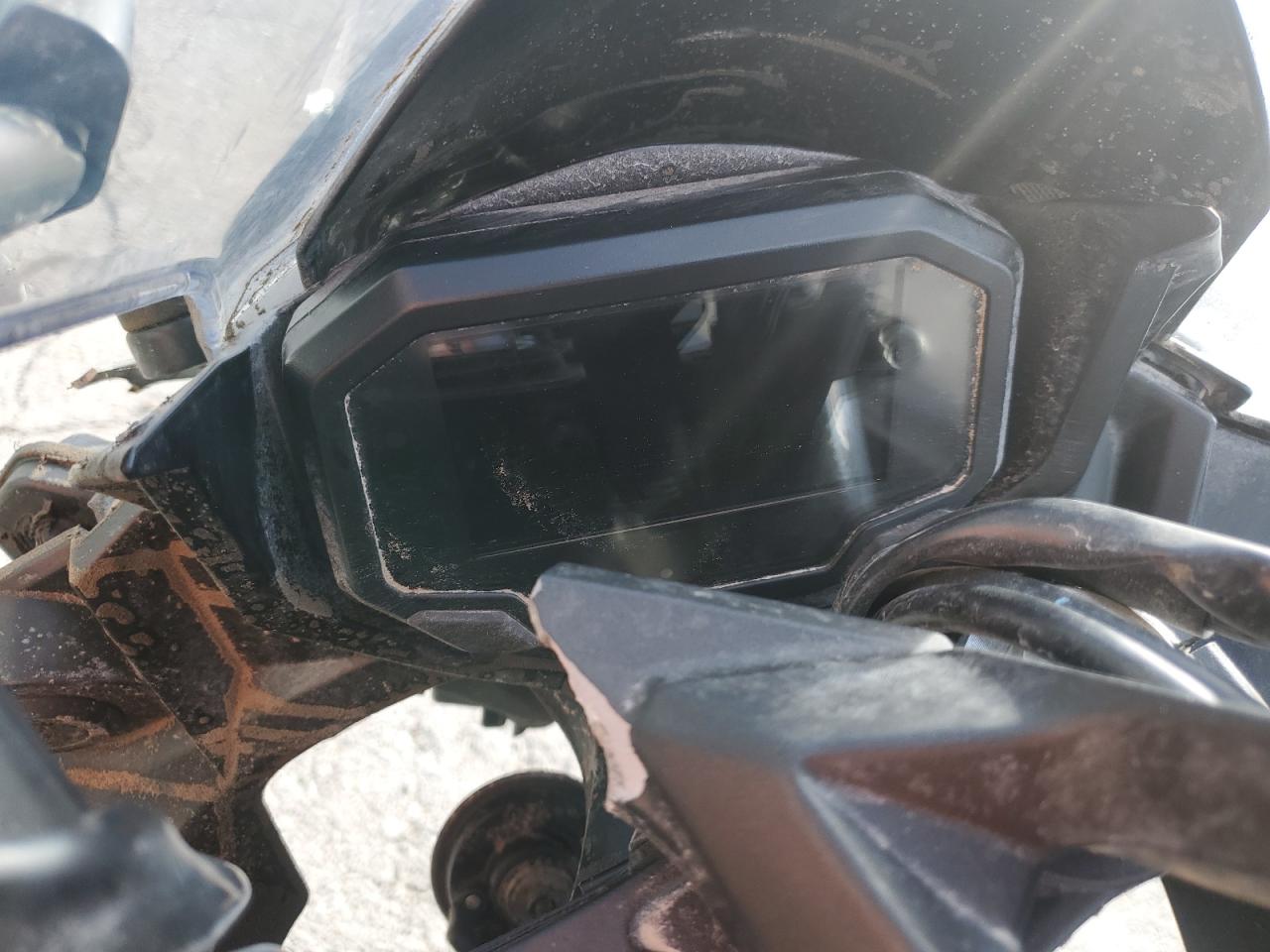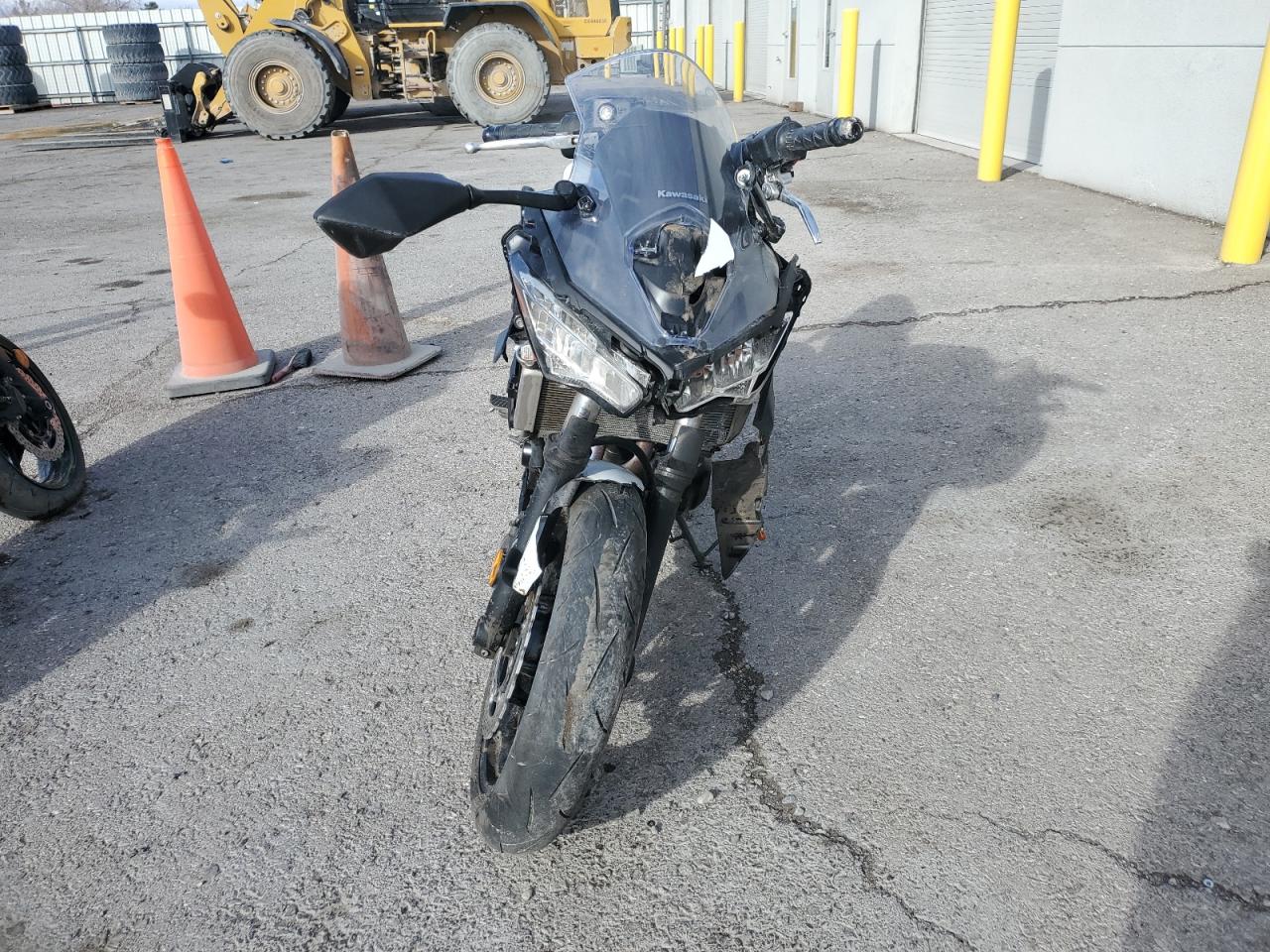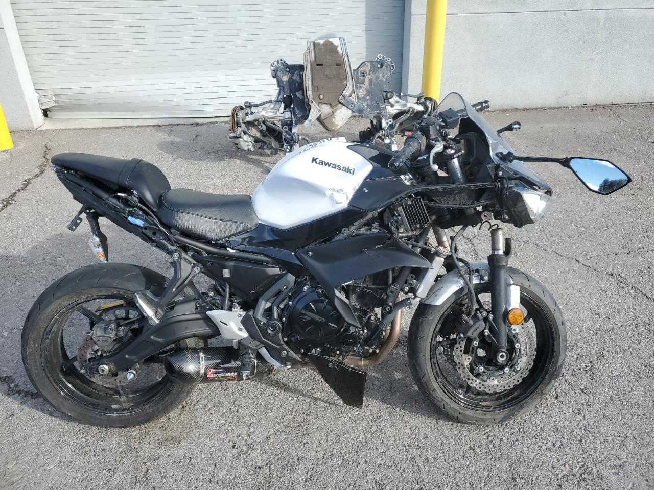 FairThe KAWASAKI EX650 N 2020, black in color, exhibits front-end damage. The vehicle's body panels show damage. The wheels appear intact, while the lights and windshield are damaged. The interior condition is good. The motorcycle requires repair and is drivable, with the front end being the most affected area.