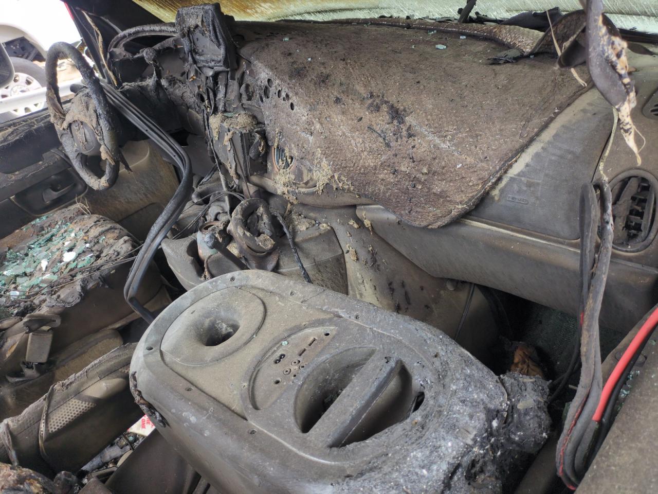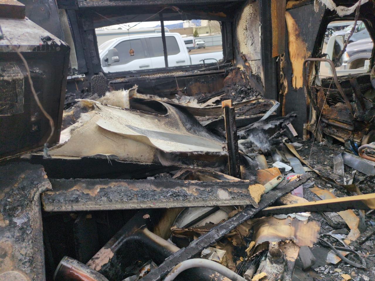 Severe fire damage to the body and interior, rendering the vehicle non-functional. Burn damage is the primary issue.