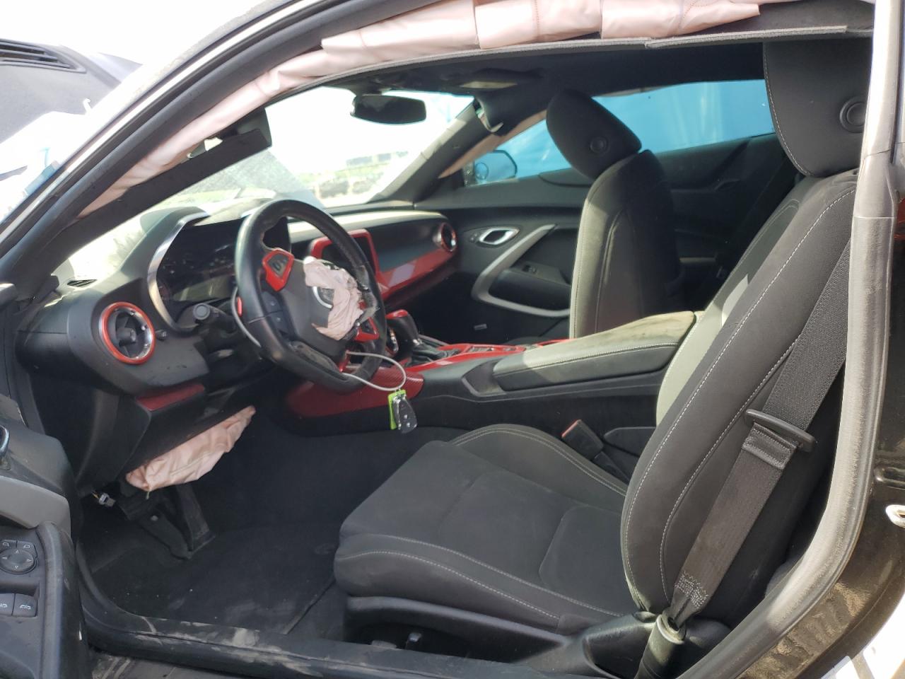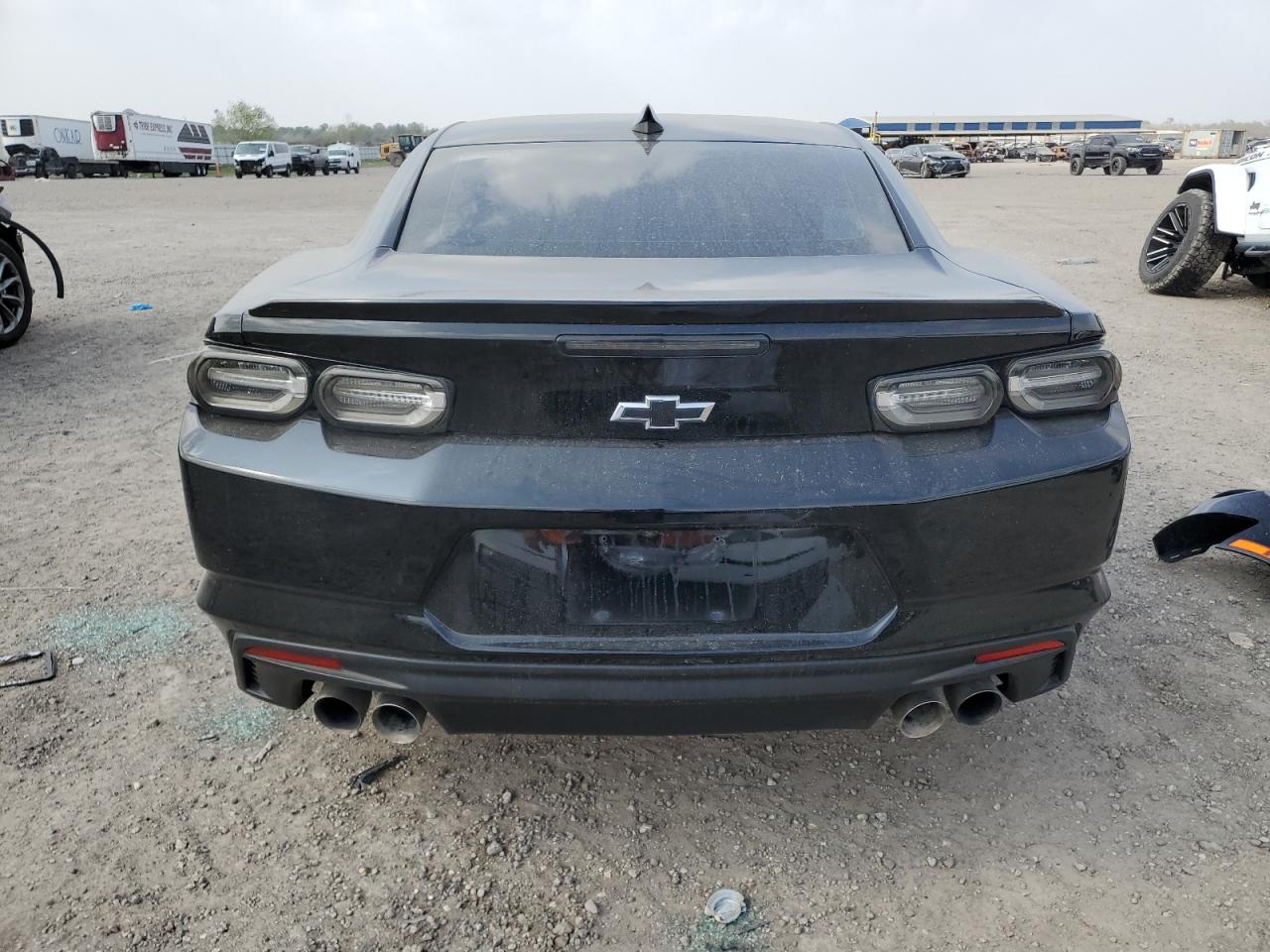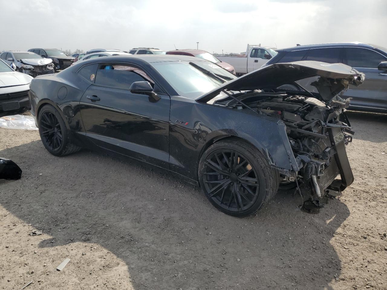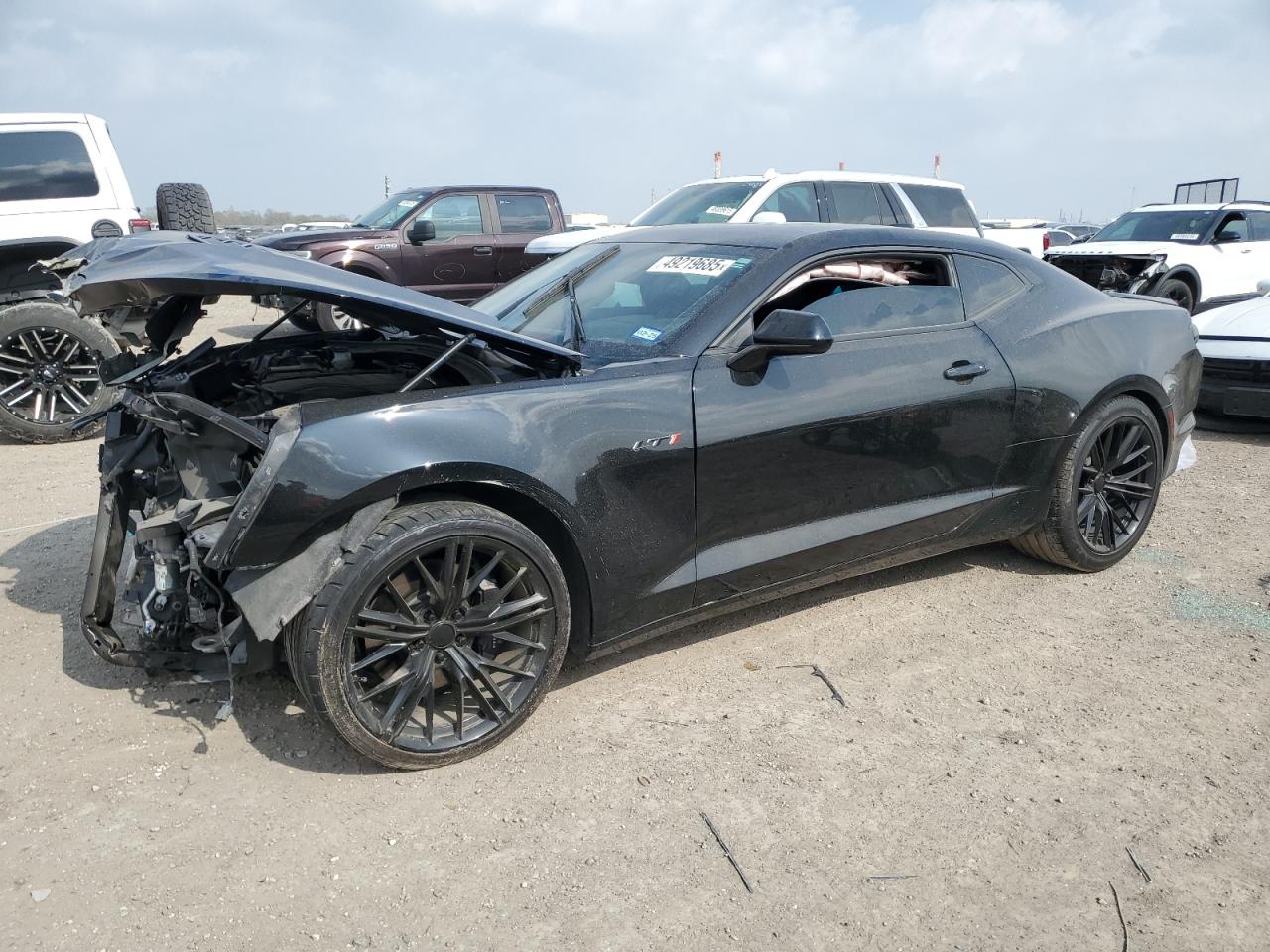 FairThe 2022 Chevrolet Camaro LT1 is a black muscle car. The vehicle sustained significant front-end damage, including a heavily damaged front fascia, hood, and potential structural damage. The front lights are likely damaged. There are also minor dents and scratches present on the body. The interior shows signs of damage, potentially including deployed airbags and damage to the dashboard and steering wheel. Wheels are present. The vehicle requires considerable repair and is likely not drivable.