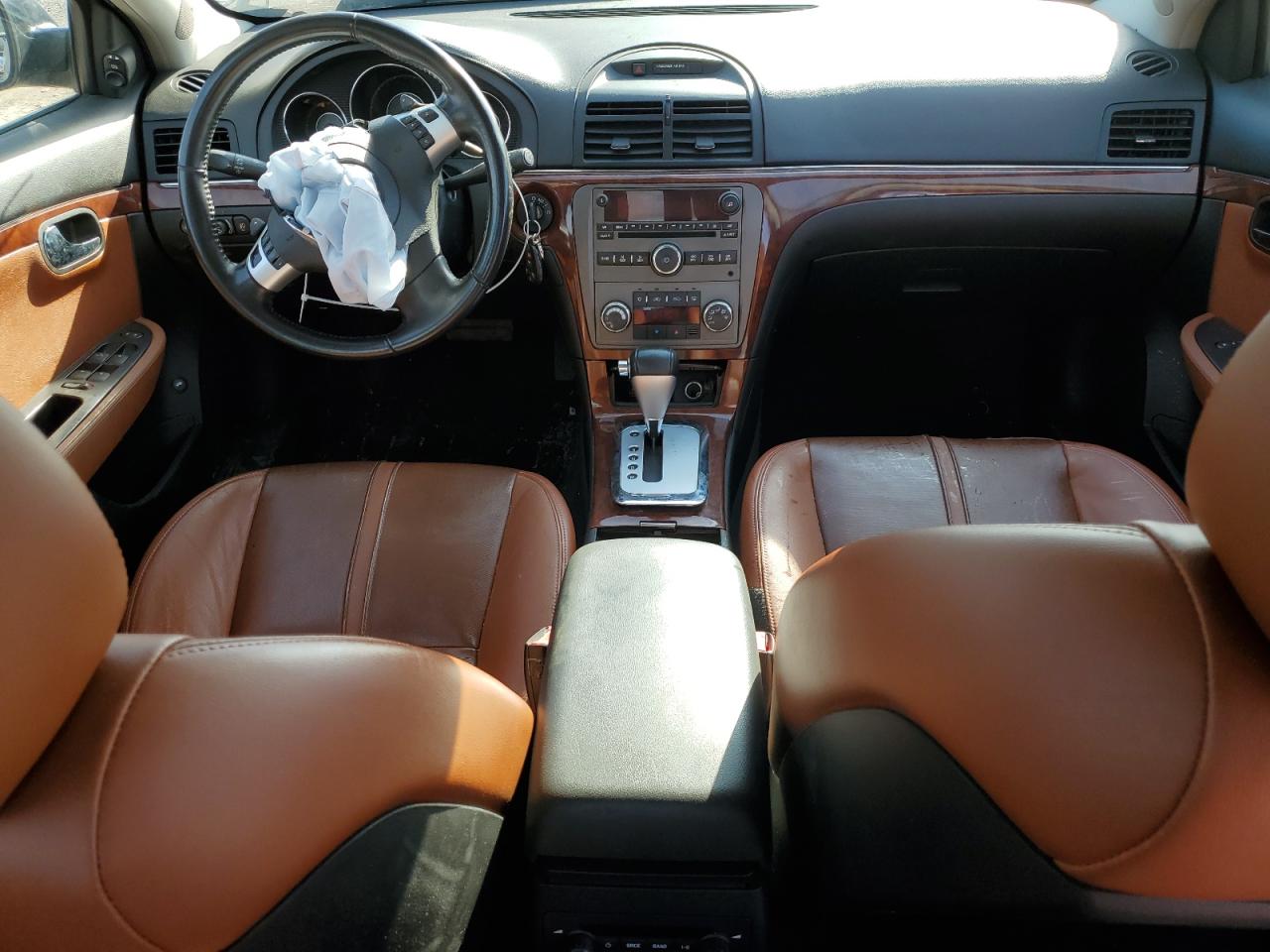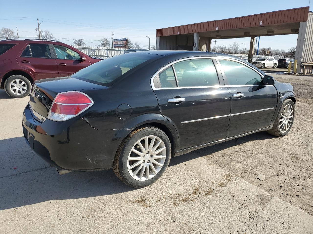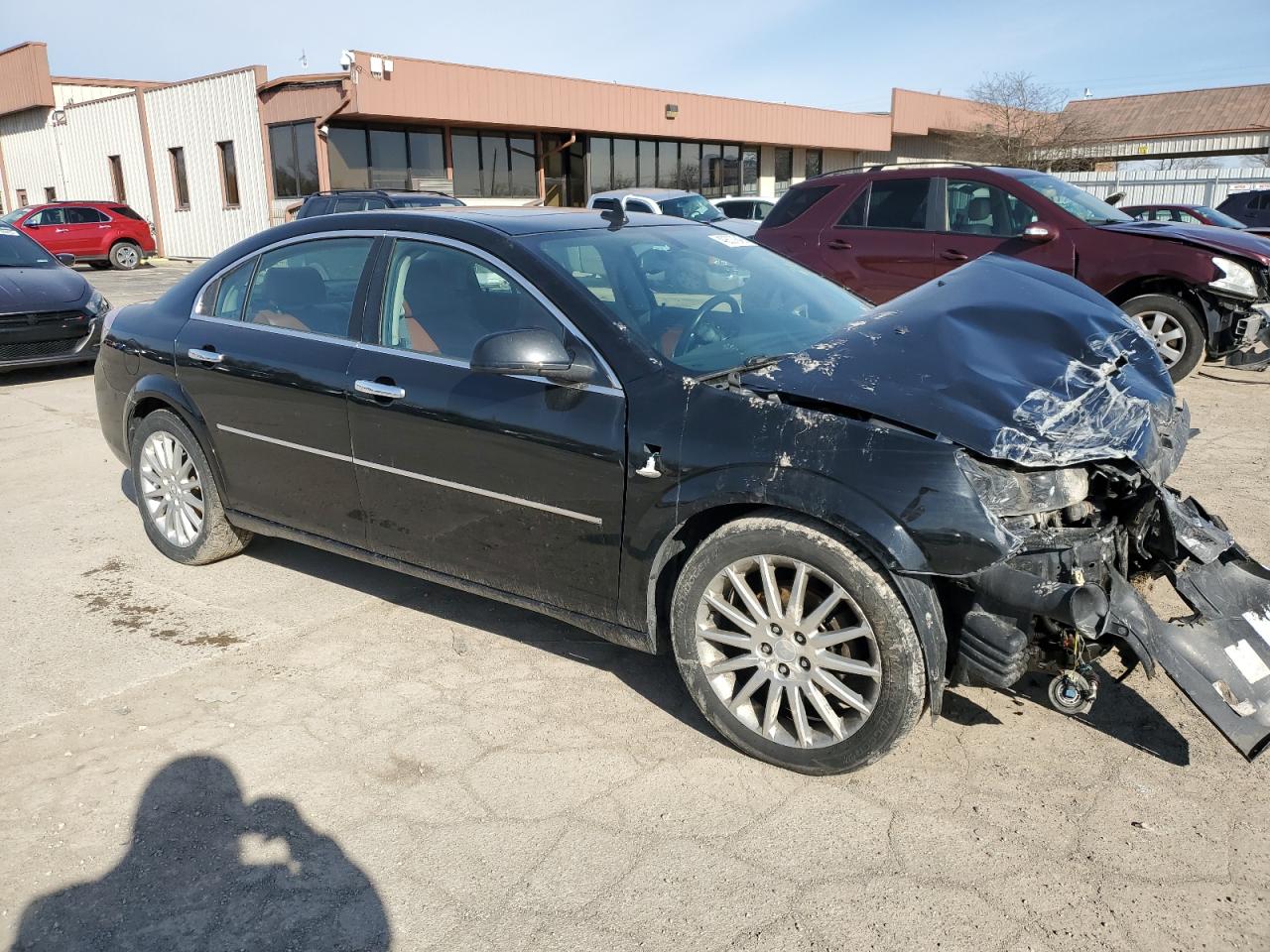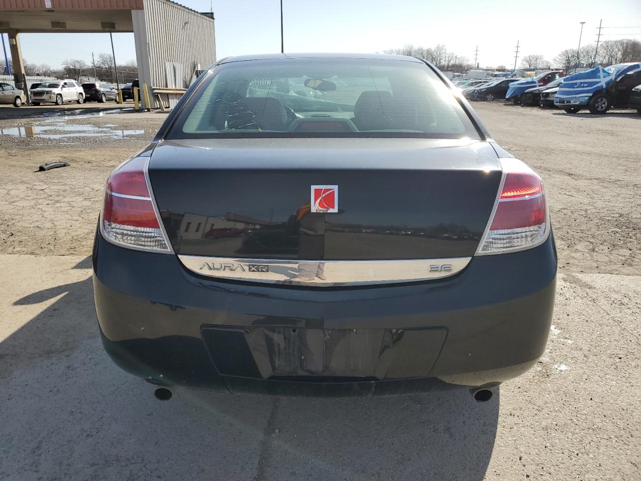 The Saturn Aura XR shows extensive front-end damage, affecting the hood, bumper, and other front body panels. Minor damage to the rear. Interior shows some wear and tear. Airbags are deployed. The car needs body repair, primarily focused on the front end.