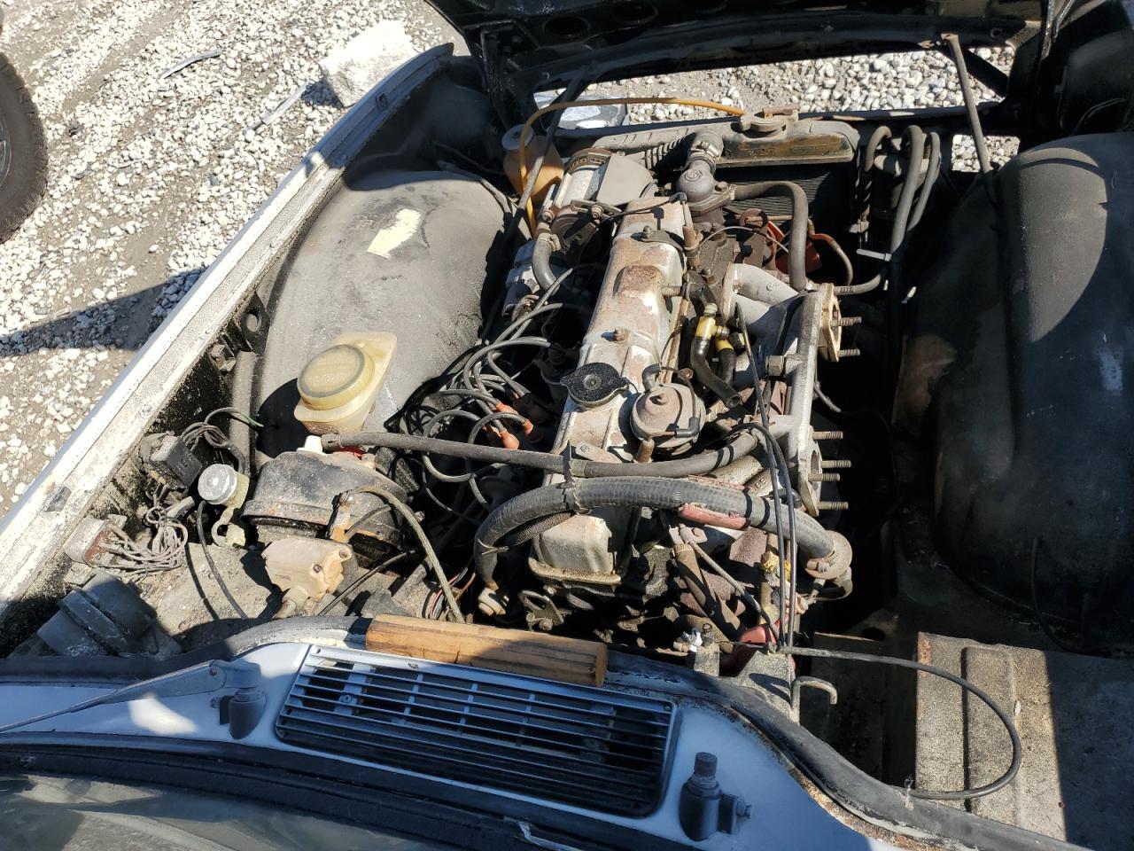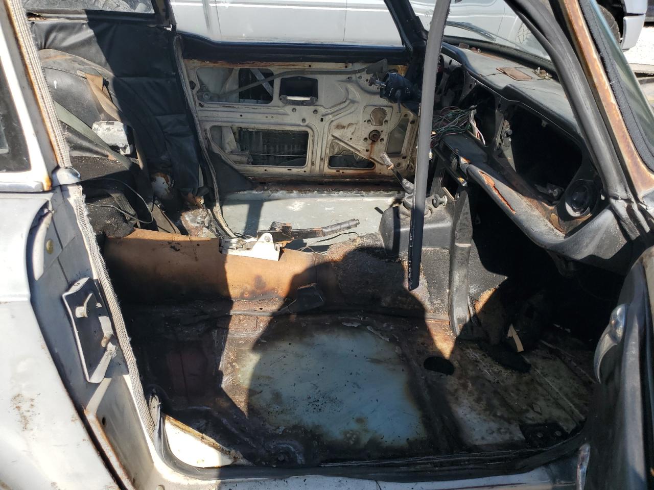 The car exhibits visible body damage, including dents and scratches, along with significant interior degradation. The roof is missing and the car have rust spots. The wheels show signs of age, but no visible severe damage is presented. The vehicle's overall condition suggests it requires considerable repair.