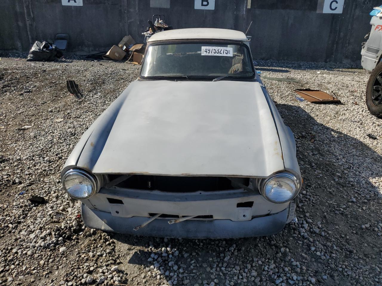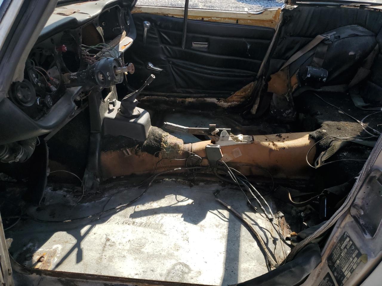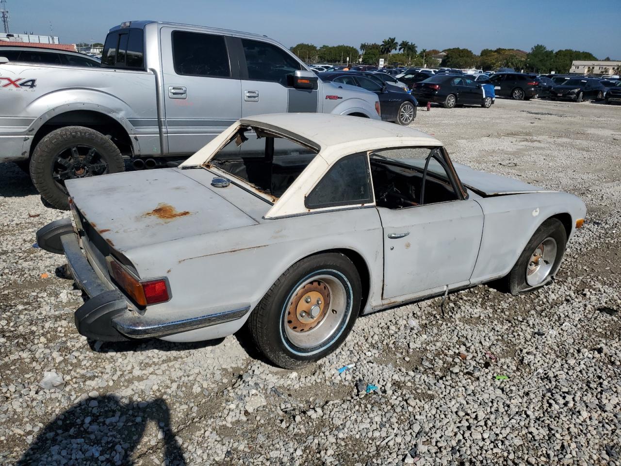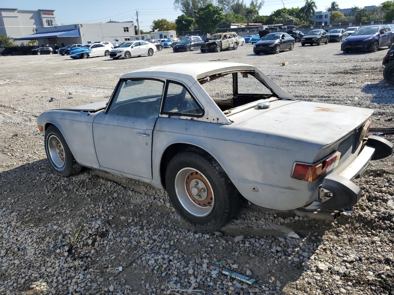 FairThe 1976 Triumph TR6, shown in multiple images, presents with significant damage, indicating a project car in need of extensive restoration. The exterior features cosmetic issues like scratches and dents, with body damage to several panels. The interior is severely damaged, with missing components and signs of deterioration. Wheel damage or engine damage is not visible on the pictures. This car is a prime candidate for restoration enthusiasts.