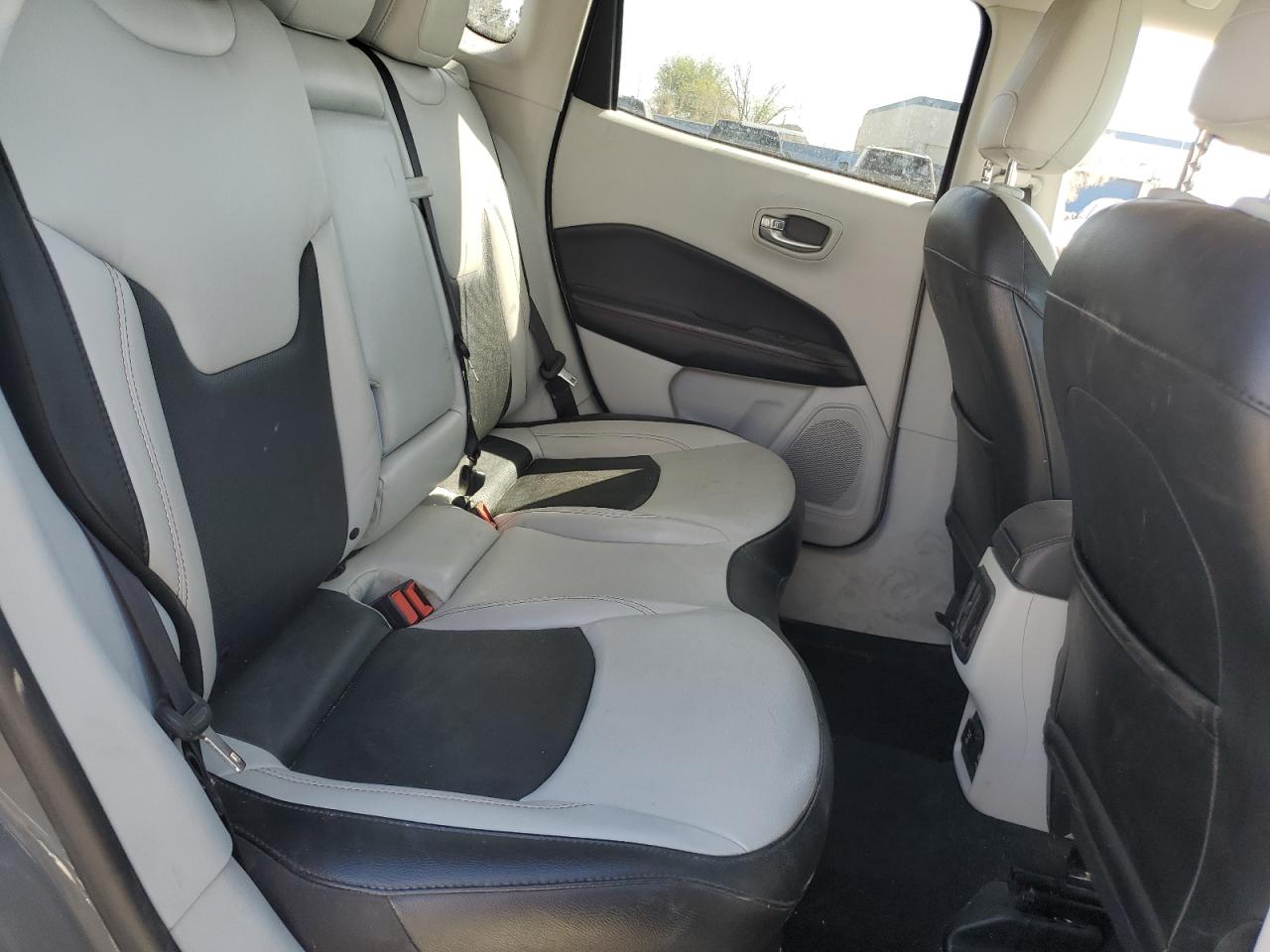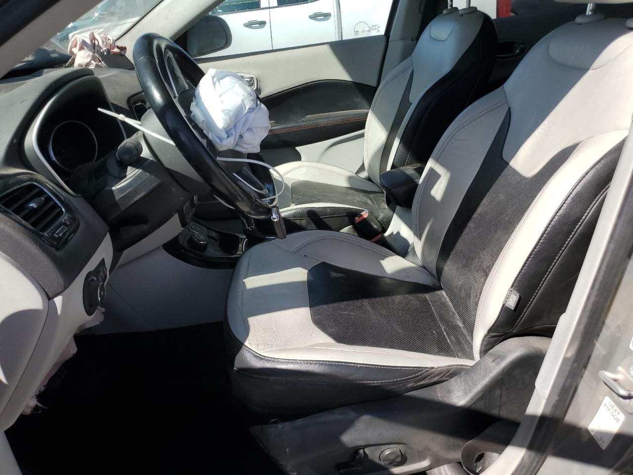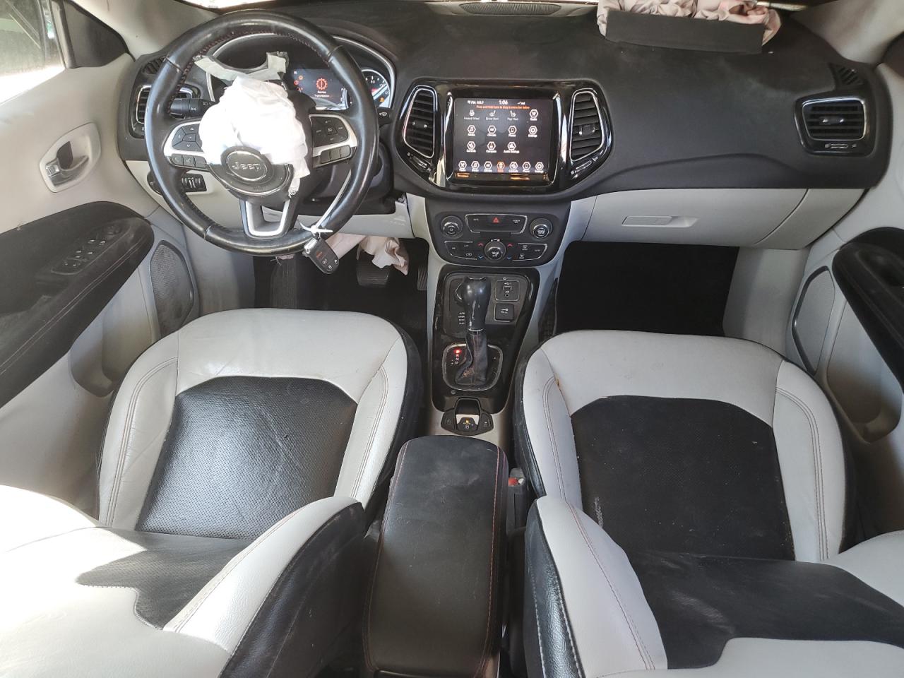The Jeep Compass has sustained significant damage to both the front and side. The front end has extensive damage with the hood crumpled and headlights broken. The side shows damage, possibly involving body panels. The interior has airbag deployment and warning lights on the dashboard.