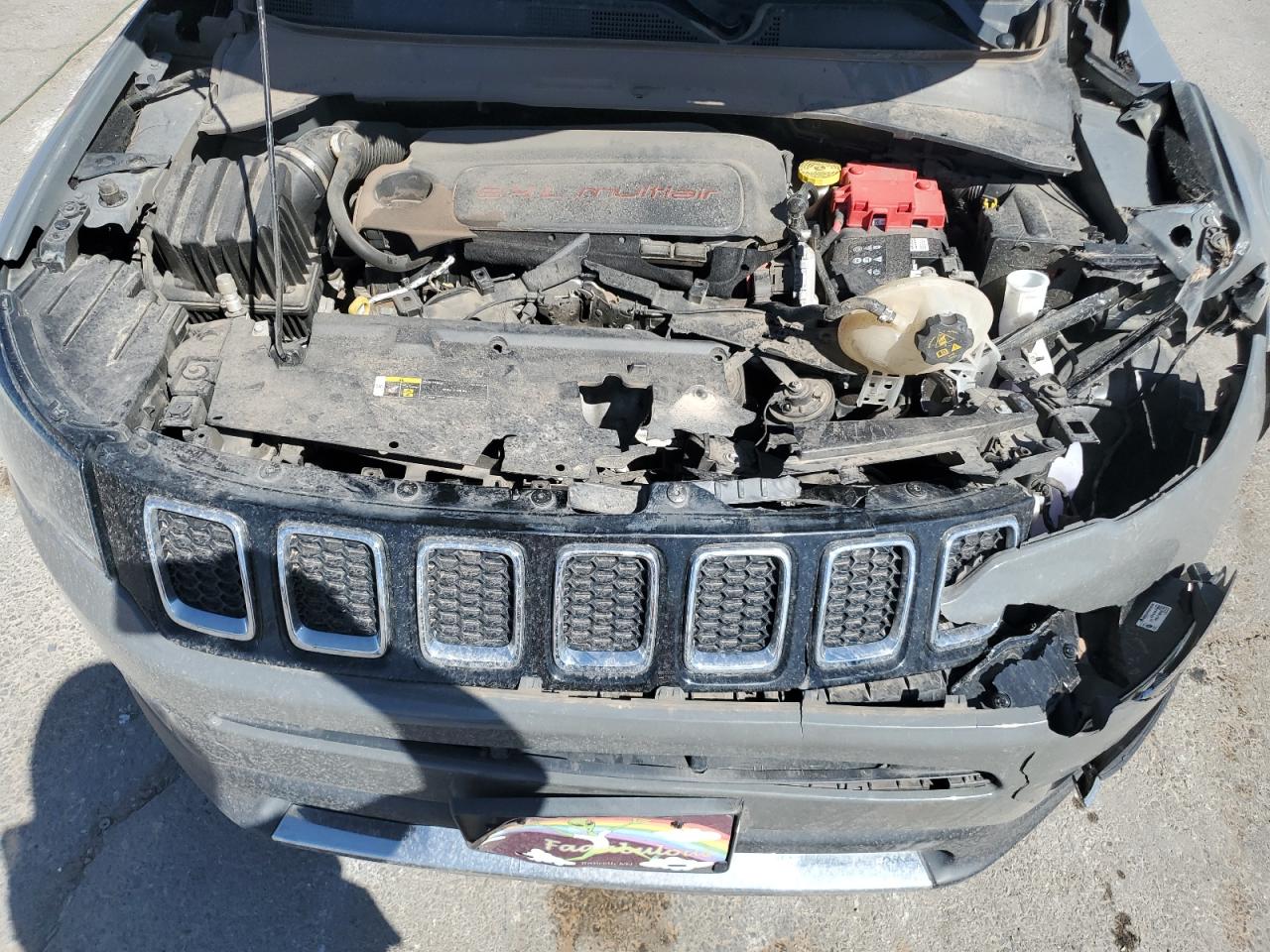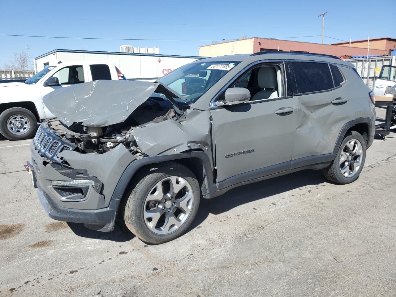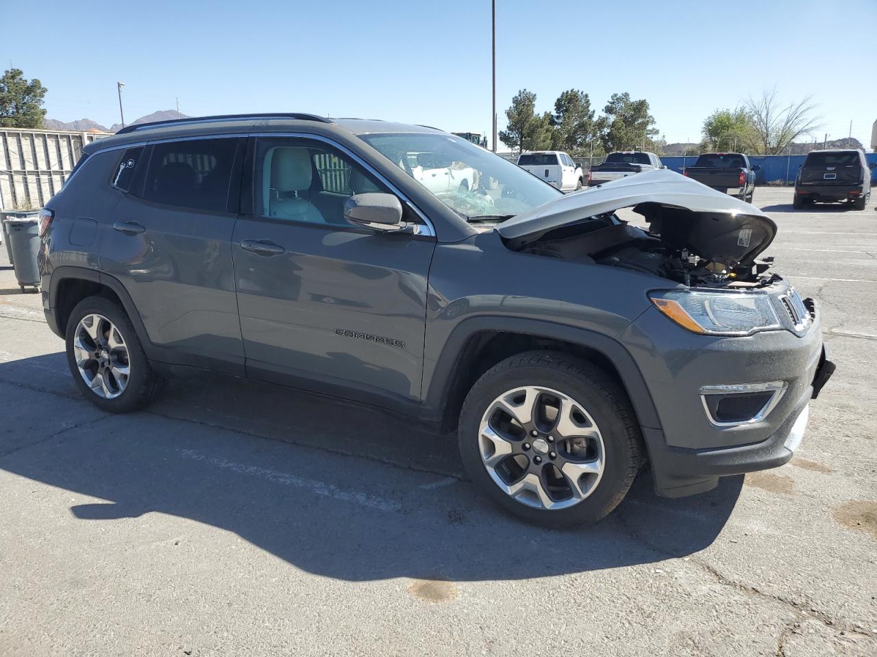FairThis is a damaged 2020 Jeep Compass Limited with front-end and side damage. The exterior is gray. The front end is heavily damaged, including the hood, bumper, and headlights. There's also significant damage to the driver's side, with potential body panel issues. The interior shows airbag deployment, and the dashboard displays warning lights. The car's overall condition is poor.