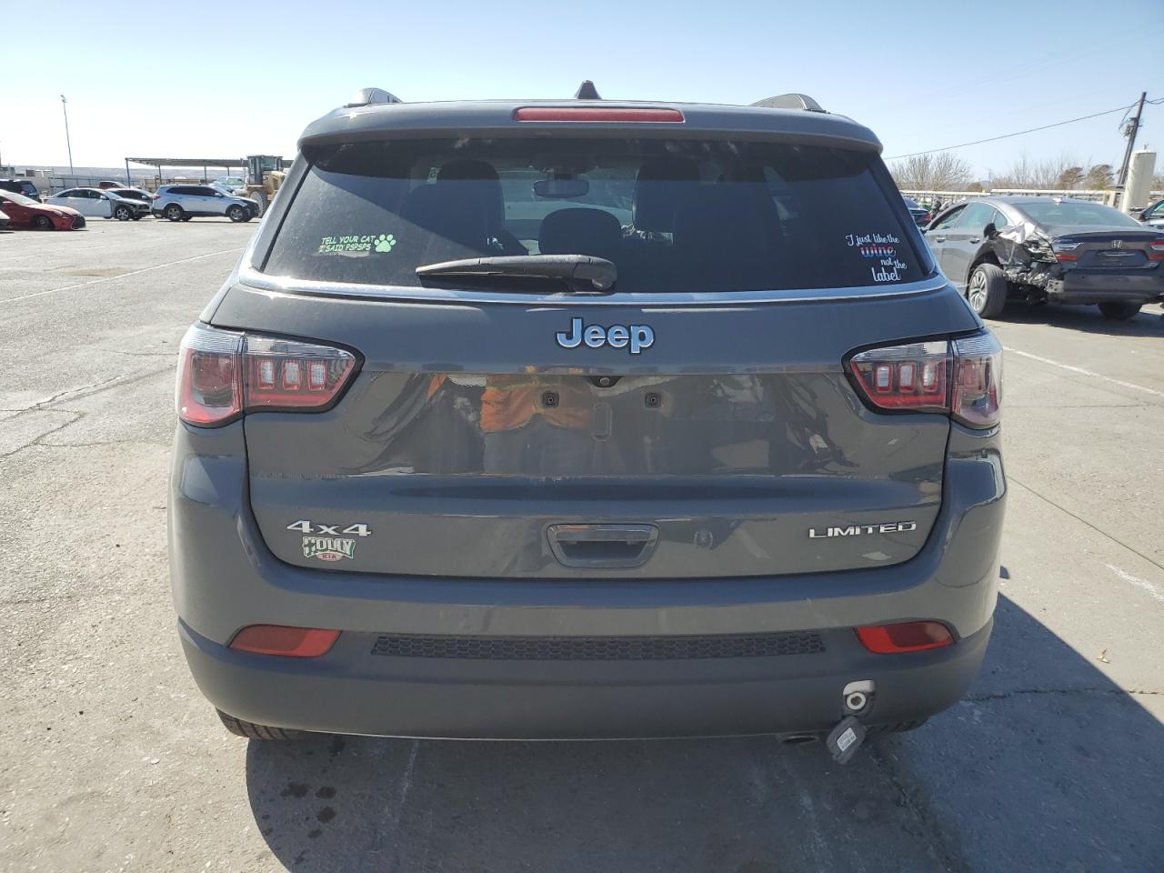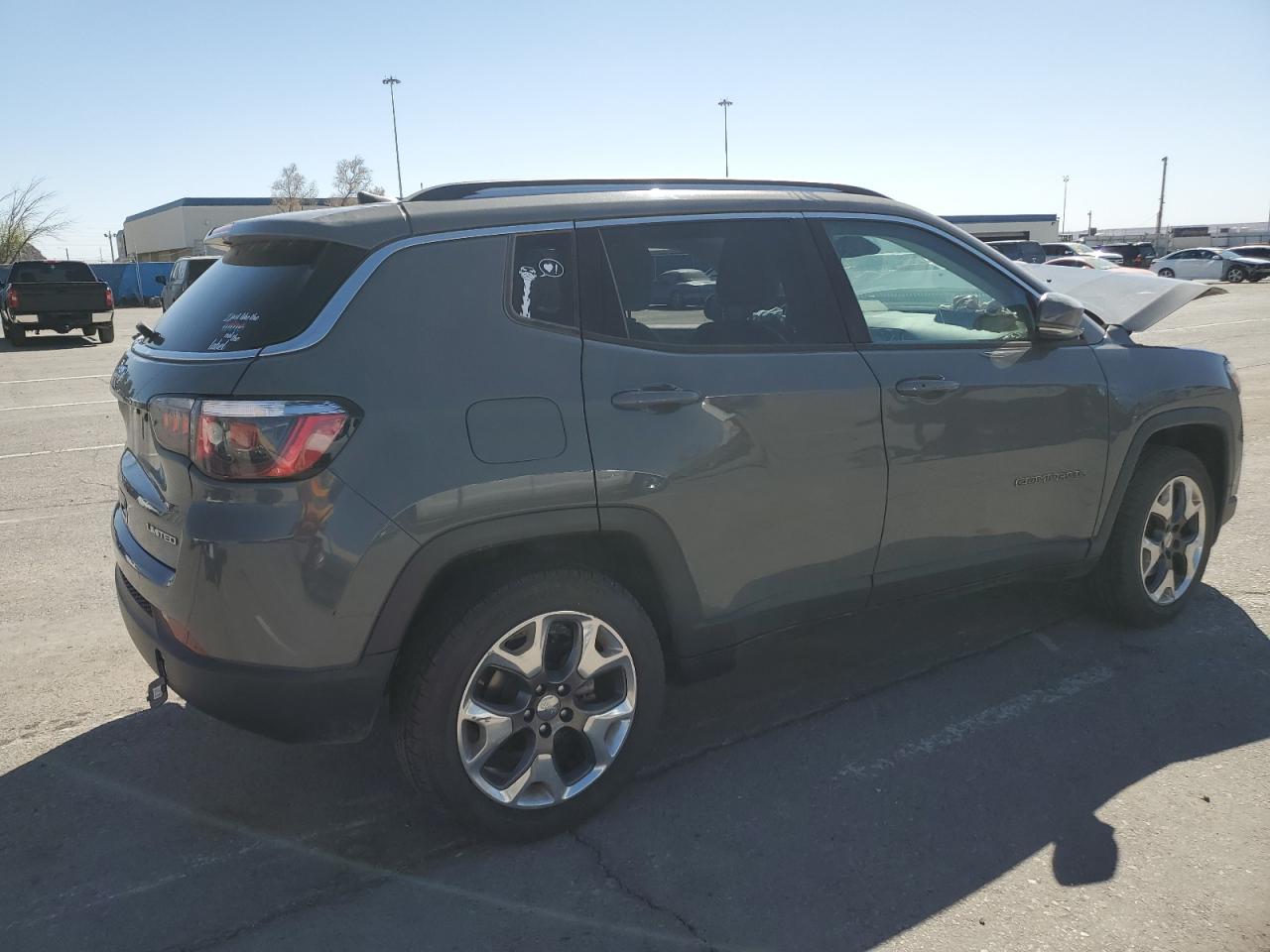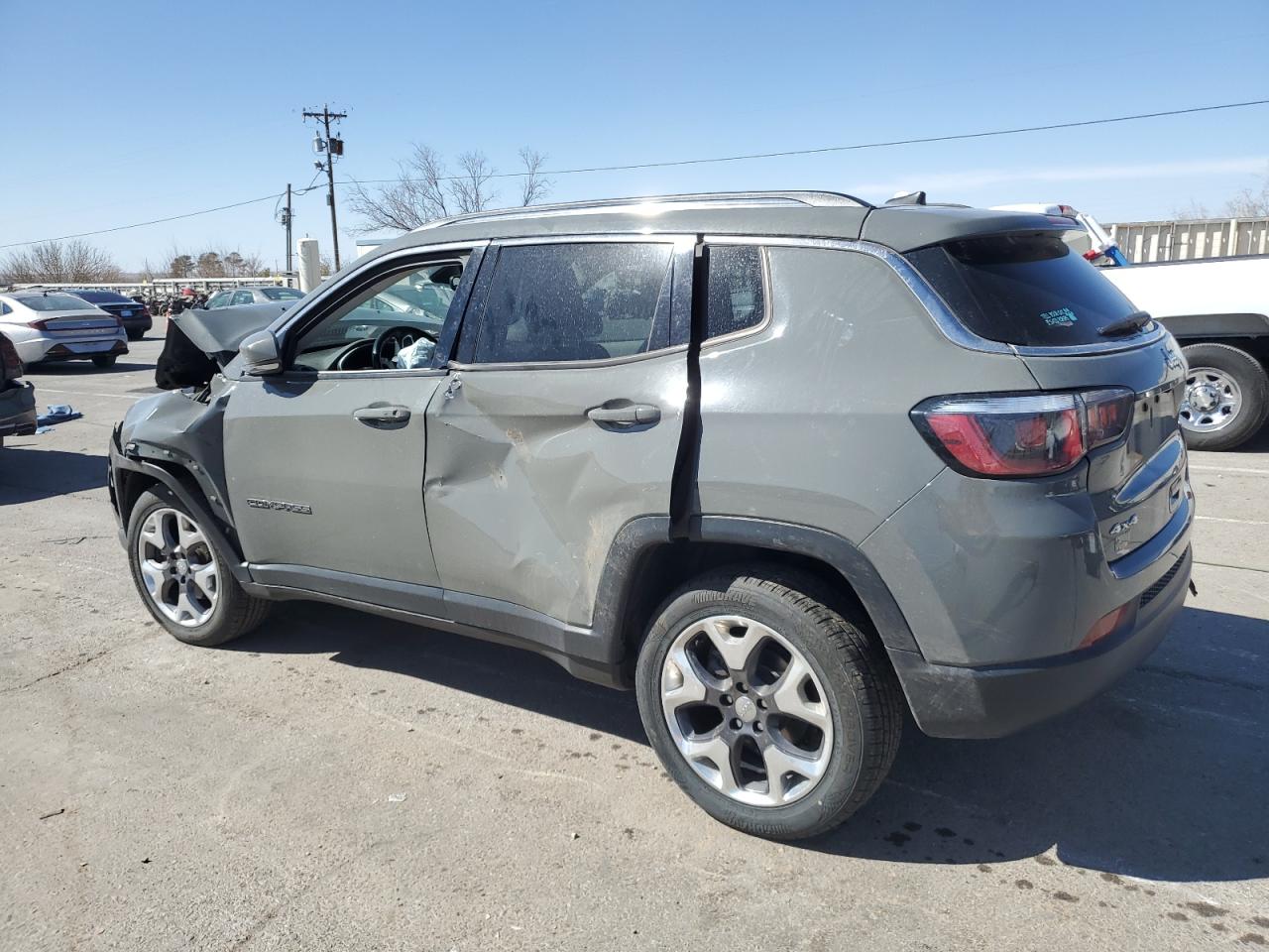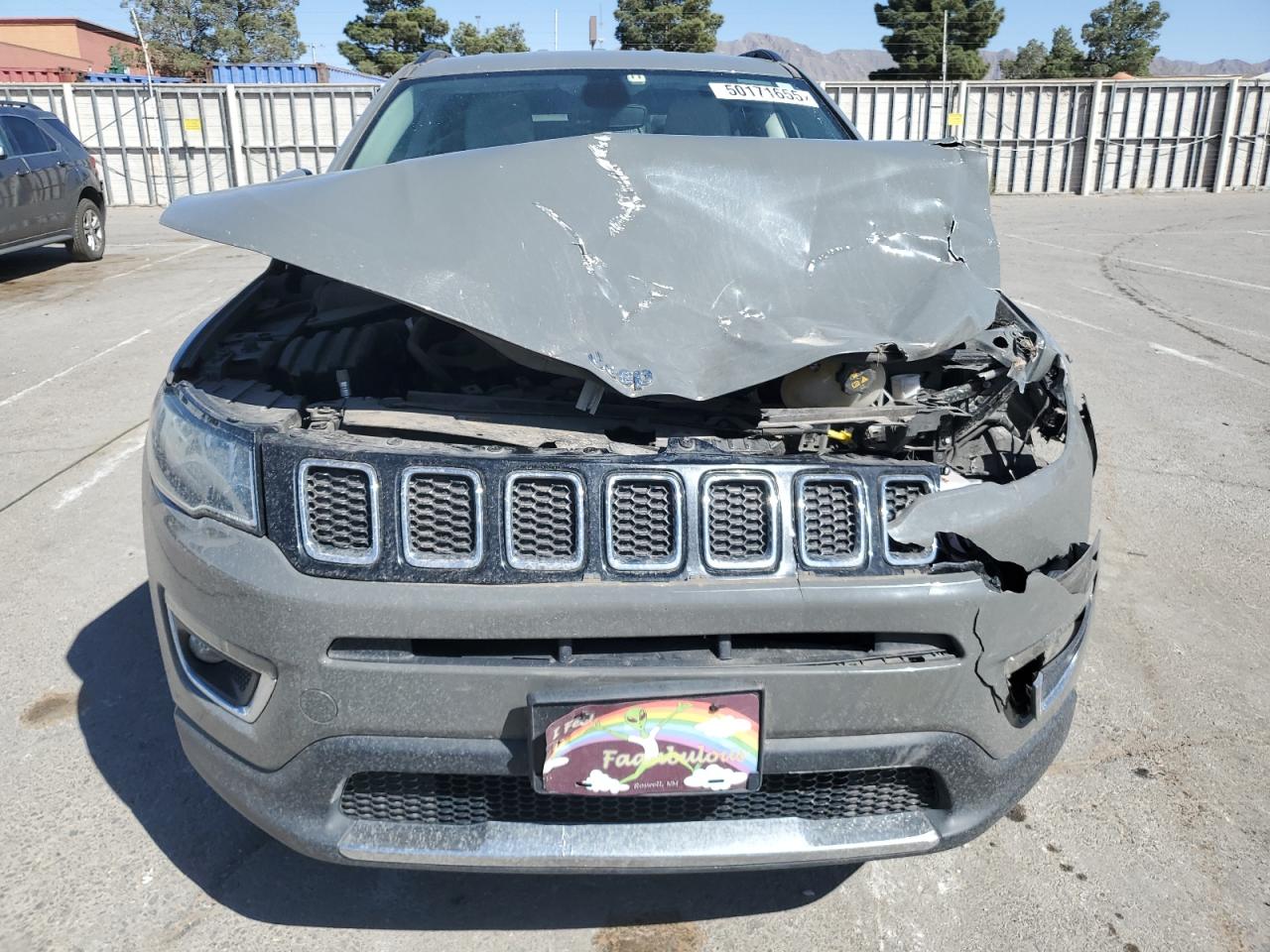 FairThis is a damaged 2020 Jeep Compass Limited with front-end and side damage. The exterior is gray. The front end is heavily damaged, including the hood, bumper, and headlights. There's also significant damage to the driver's side, with potential body panel issues. The interior shows airbag deployment, and the dashboard displays warning lights. The car's overall condition is poor.