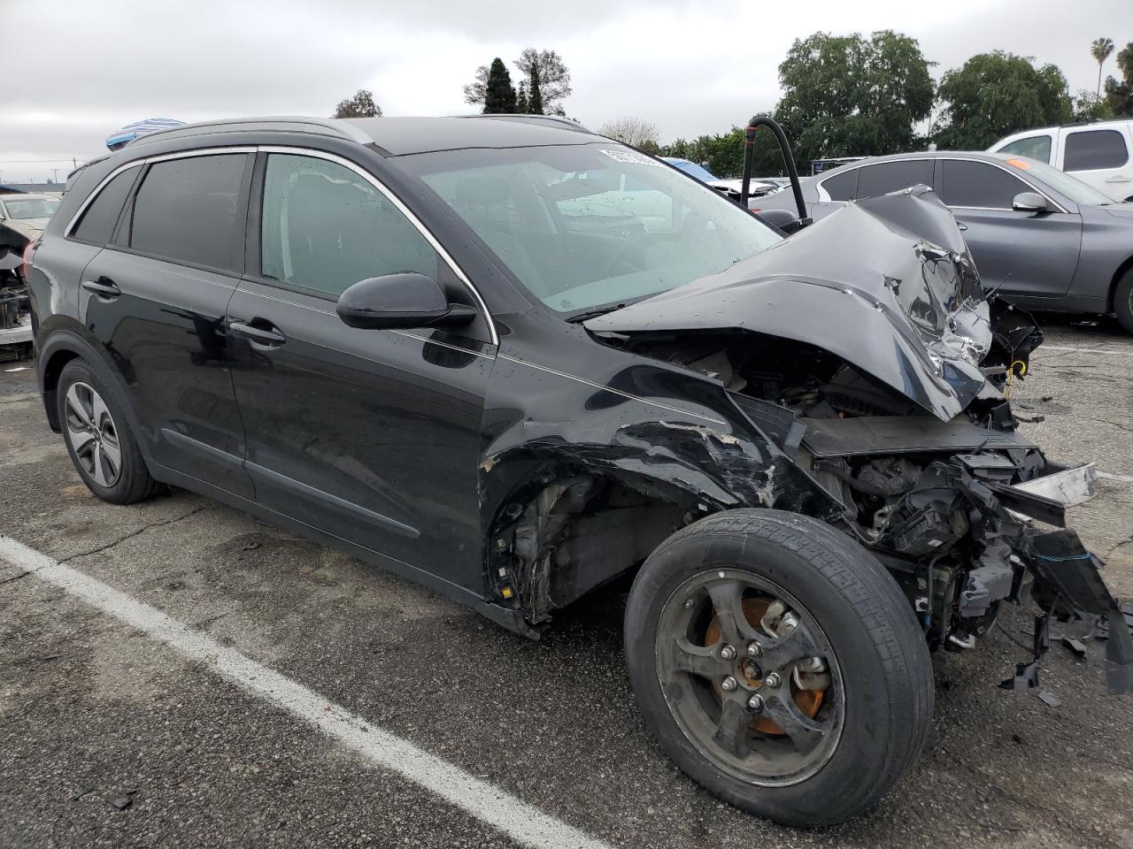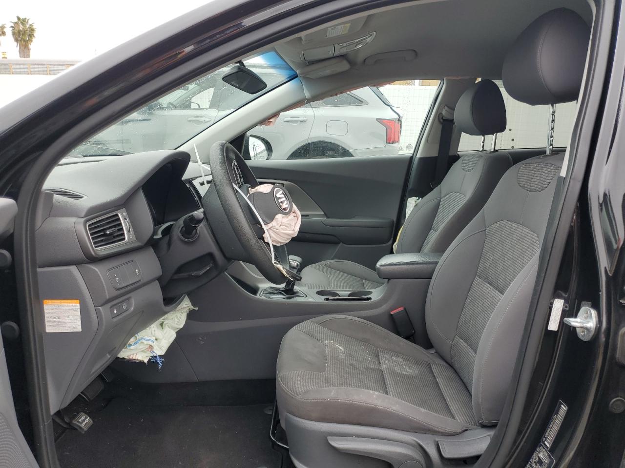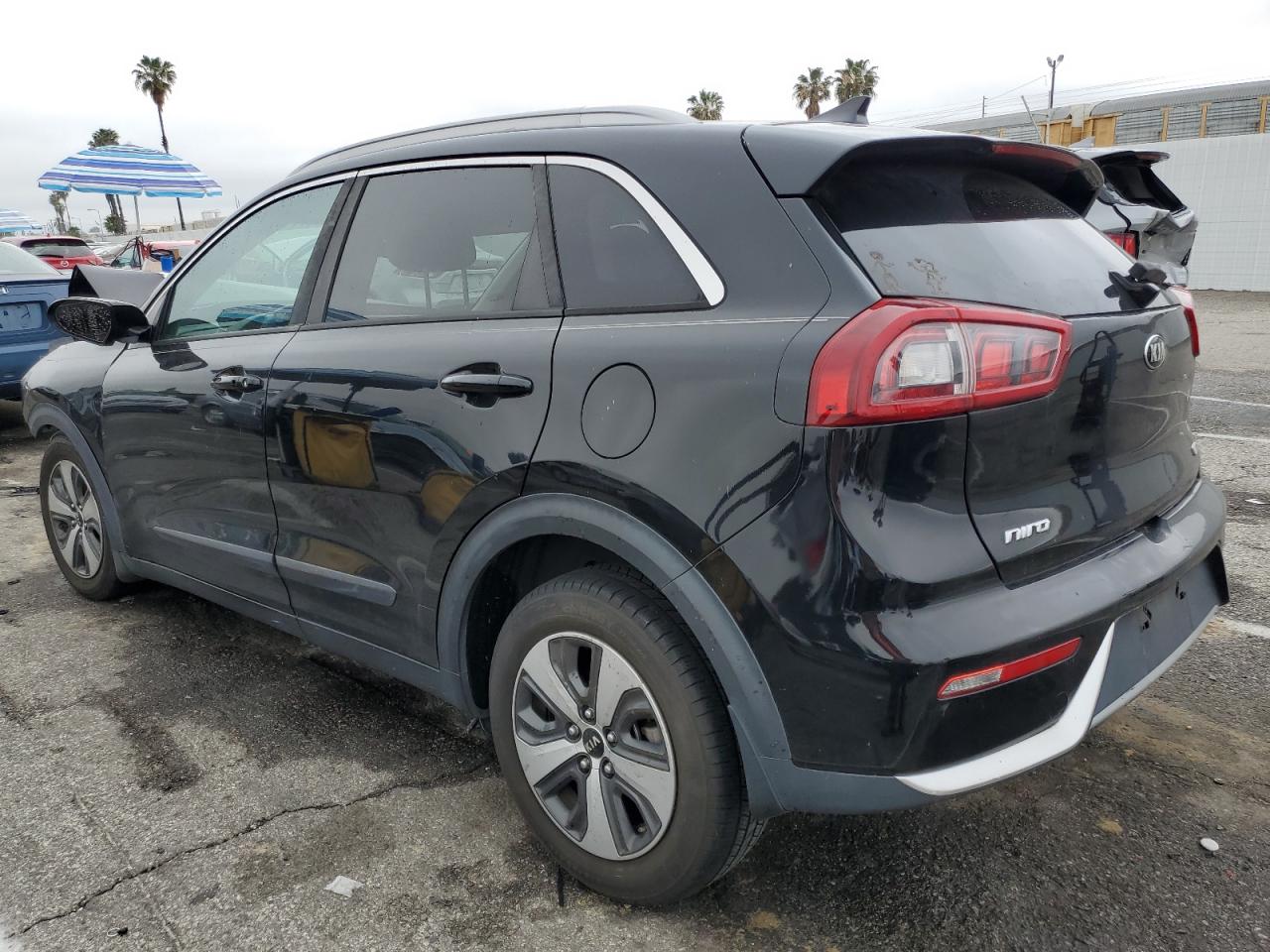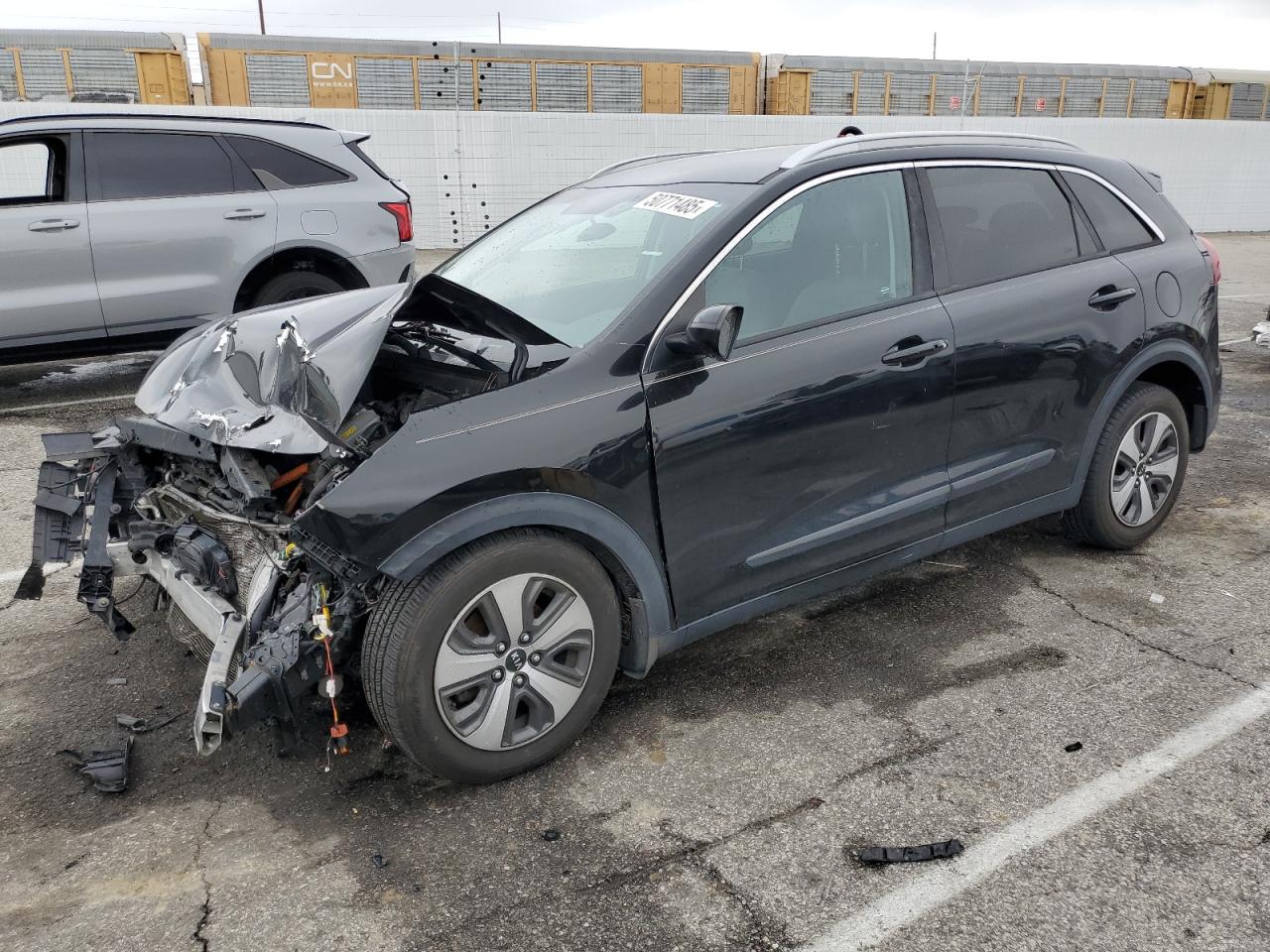 FairKIA NIRO FE 2017. This black SUV shows significant damage. The front end is severely impacted, with extensive damage to the body panels and structural components. The wheels appear to be intact but may have related damage. The airbags have deployed, indicating a significant collision. Interior damage is evident, with visible wear and tear throughout the cabin. This vehicle requires substantial repairs and is likely not drivable in its current condition. The car have a start code of 2017.