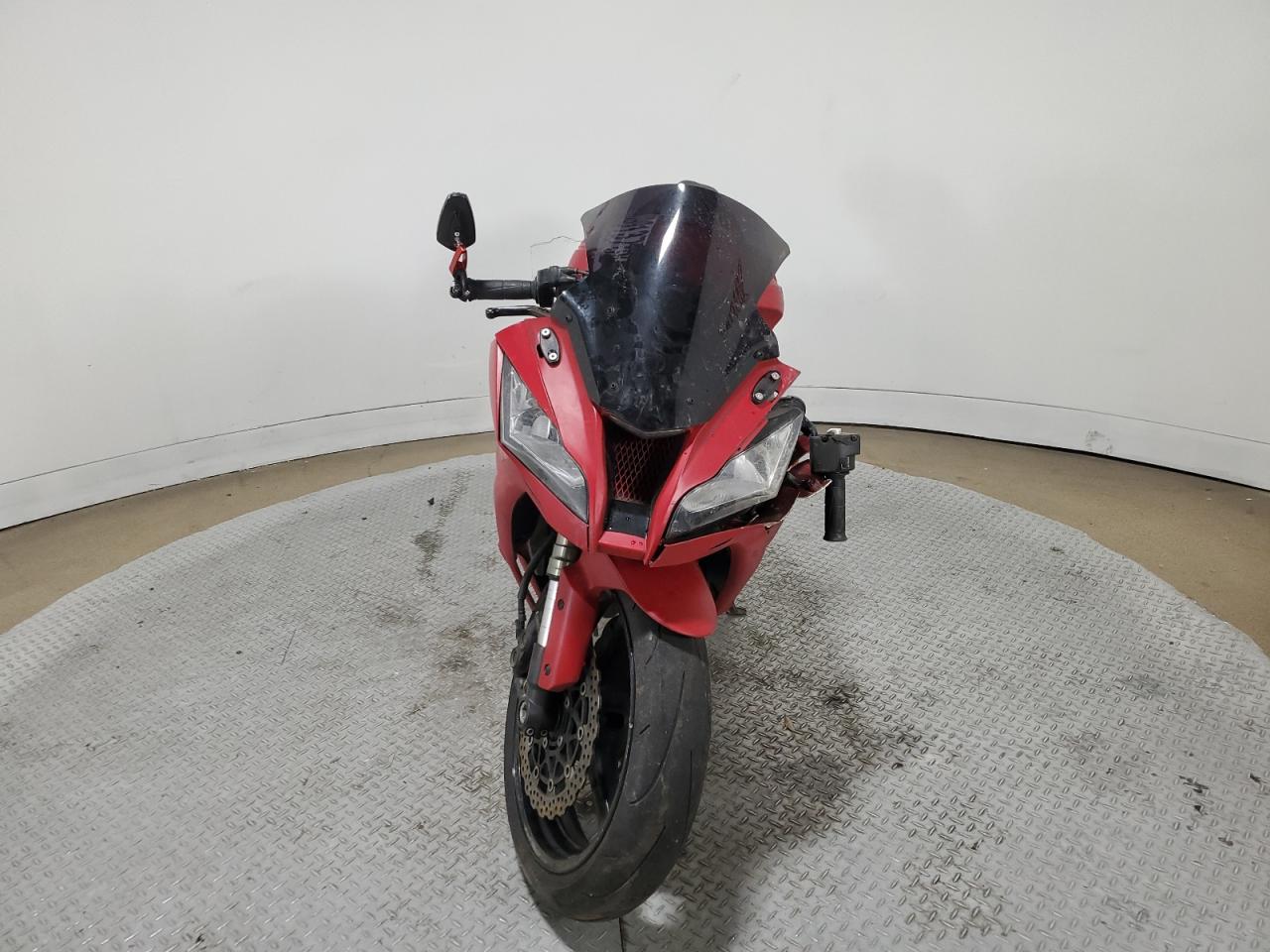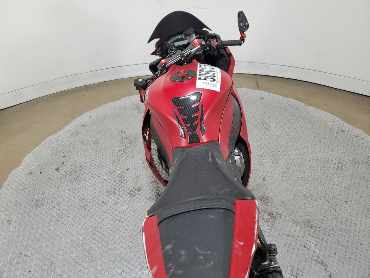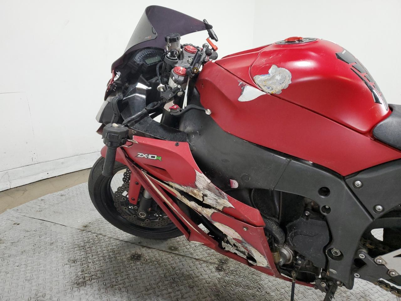 FairThe KAWASAKI ZX1000 J 2013, a red motorcycle, exhibits damage primarily to the side, with secondary hail damage. The motorcycle itself is a high-performance sportbike known for its power and handling.