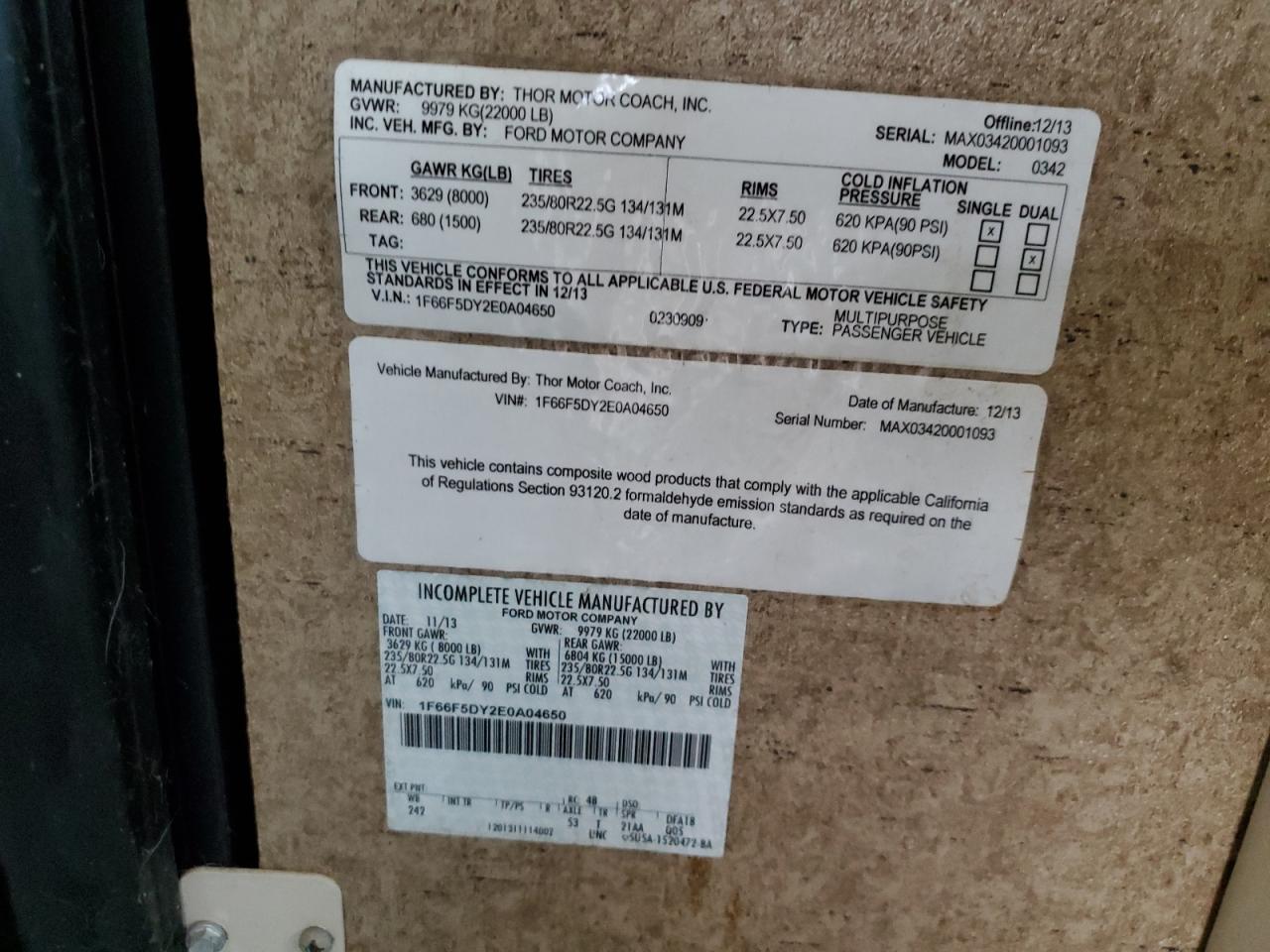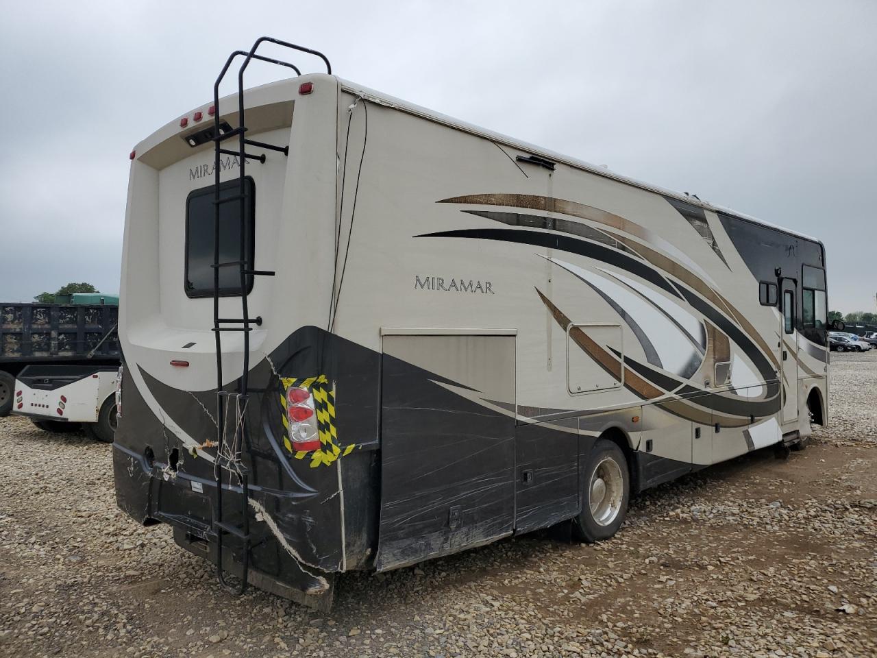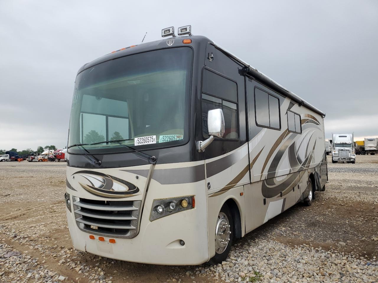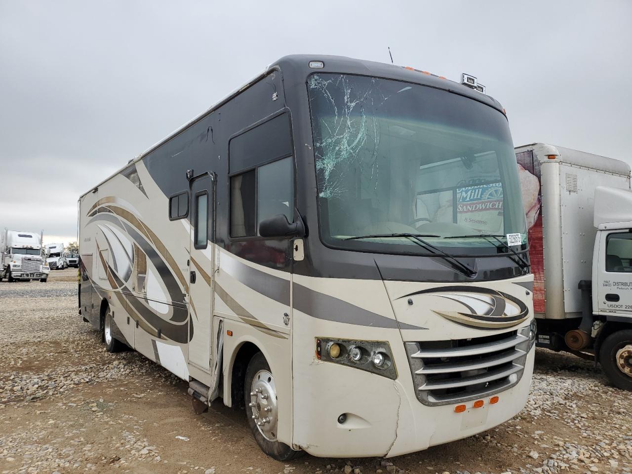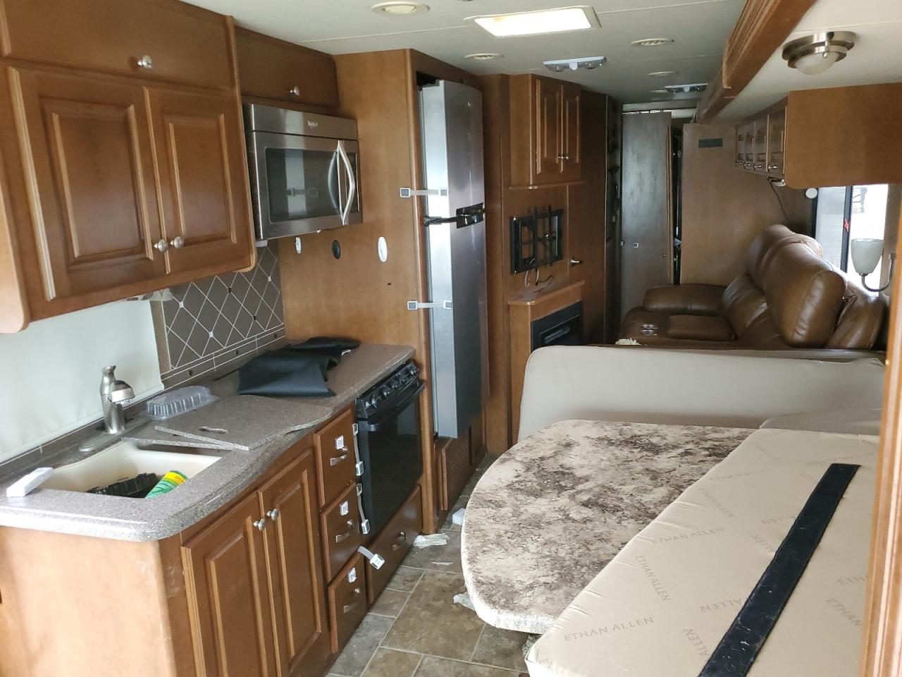 FairThis 2014 FORD F53 RV, is a two-tone motorhome. The vehicle is a Run & Drive Verified and sustained damage all over the body. The exterior has visible damage including the front windshield, rear bumper, and body panels. The interior shows signs of wear and tear but is in a good condition. The RV appears drivable, with body damage requiring repairs. The wheels and lights appear functional, with no apparent damage. The airbags' condition is not specified. The vehicle's overall state is fair, requiring body repairs.