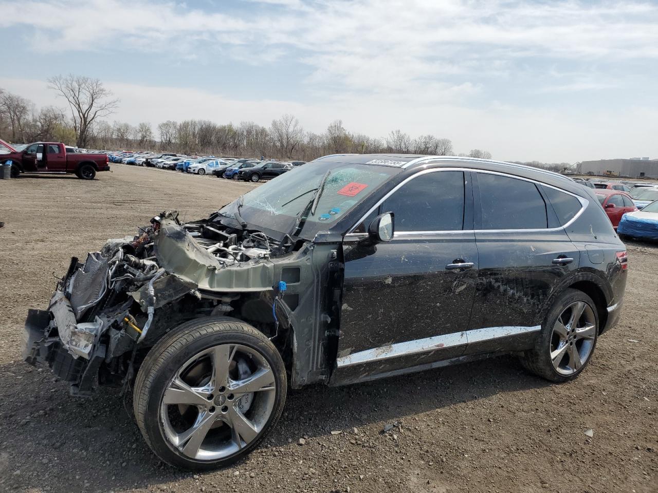 PoorThe 2022 GENESIS GV80 BASE, black in color, displays significant damage. The primary damage is to the front end, with secondary damage to the top/roof. The front end is heavily damaged. The wheels are visible but may have some damage. The lights and glasses are likely damaged. The interior shows deployed airbags and visible damage to the dashboard and other components. The overall condition is poor, indicating a need for considerable repair and is not drivable.